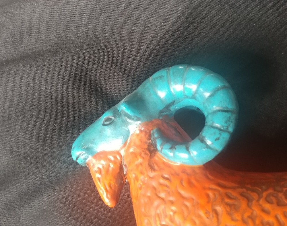 MID-CENTURY MODERN Blue and Orange Ram bank. Bank has a great look and is in excellent condition. It measures 8" long by 5 1/2" tall.