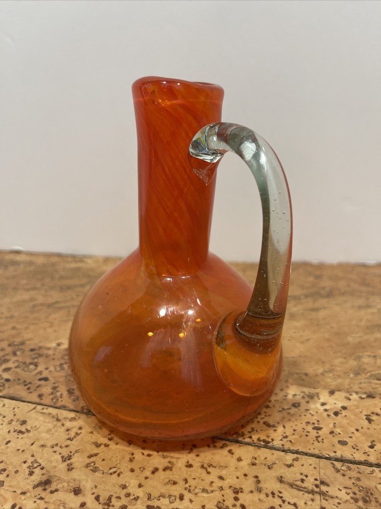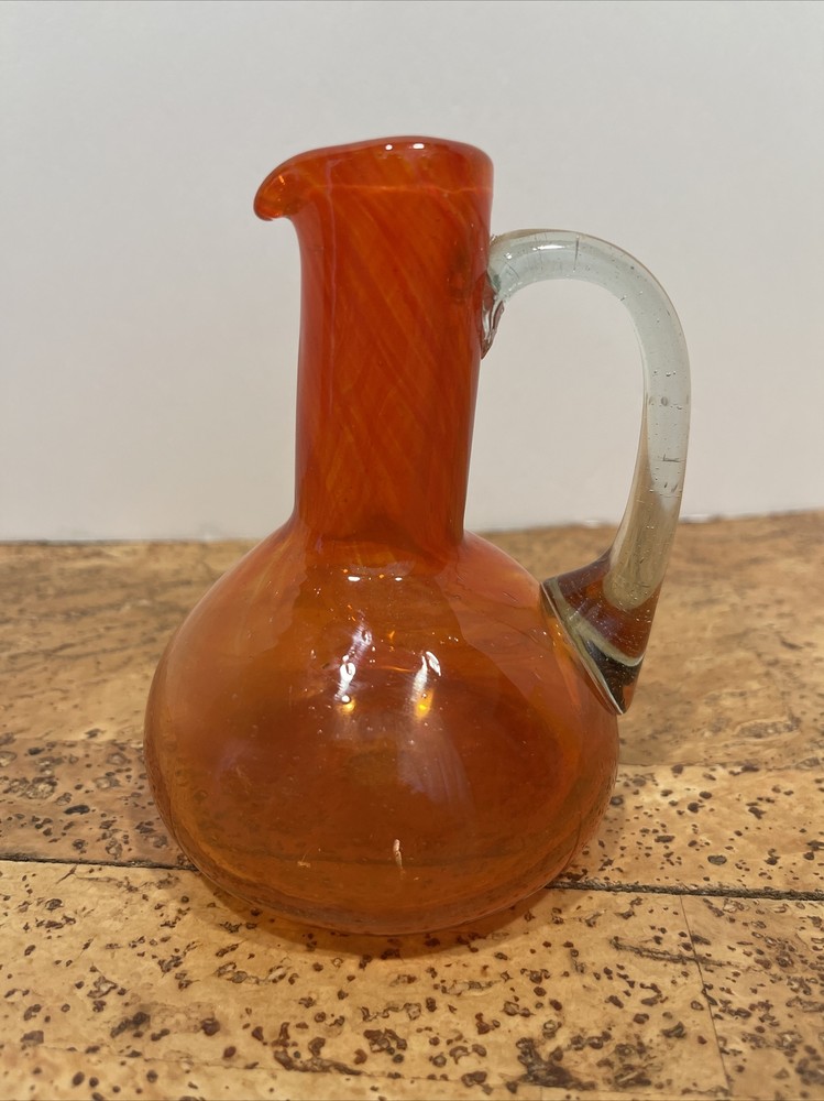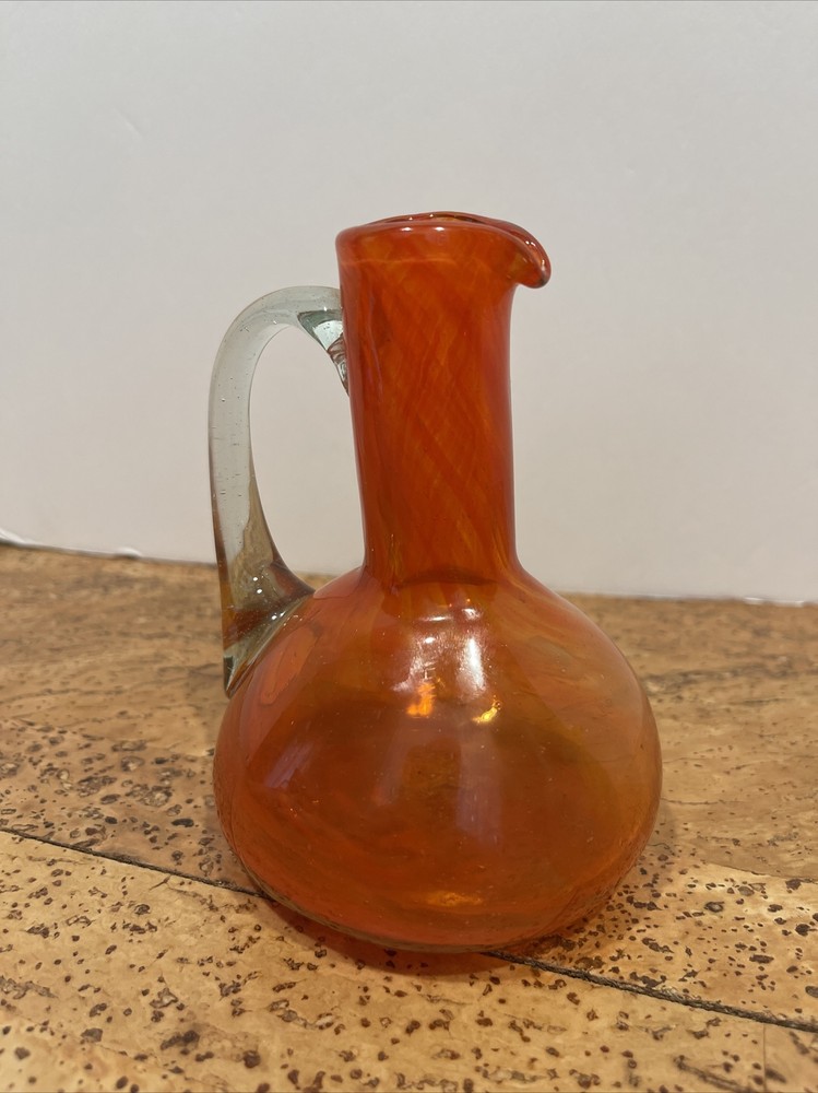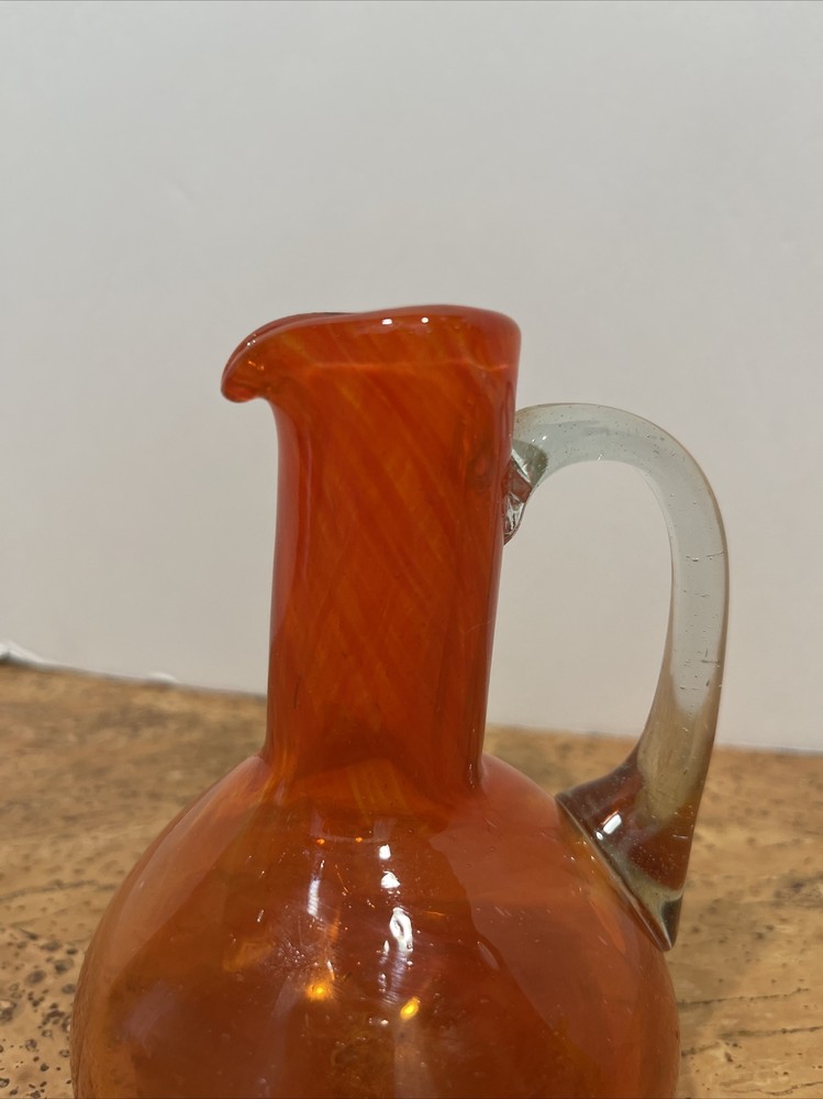 MID-CENTURY MODERN SWIRL ART GLASS TANGERINE - ORANGE 5 Inch PITCHER. 5 inches tall 4 inches wide at base. Hand blown so does show bubbles in glass. No chips....