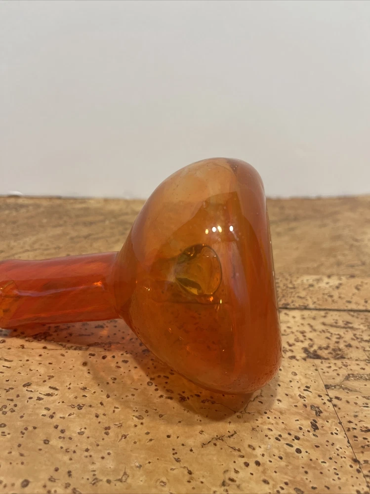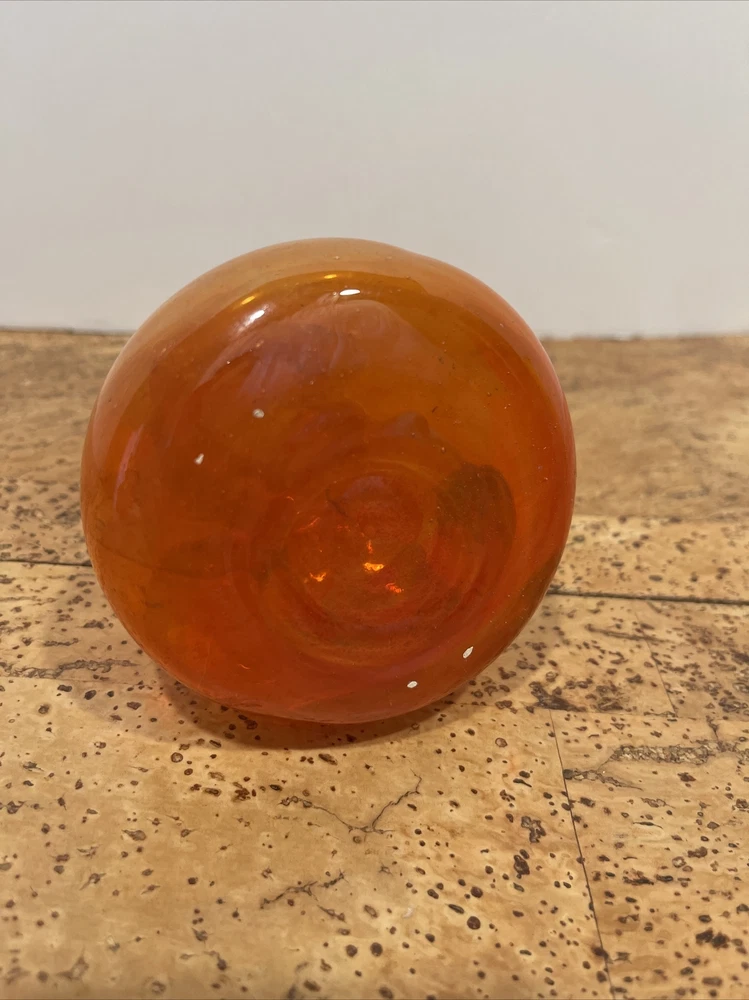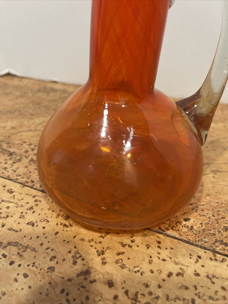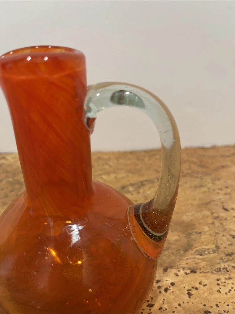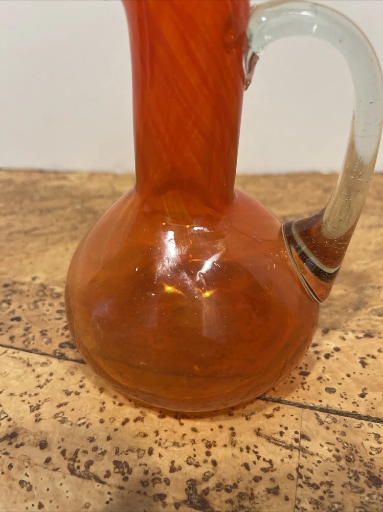 MID-CENTURY MODERN SWIRL ART GLASS TANGERINE - ORANGE 5 Inch PITCHER. 5 inches tall 4 inches wide at base. Hand blown so does show bubbles in glass. No chips....