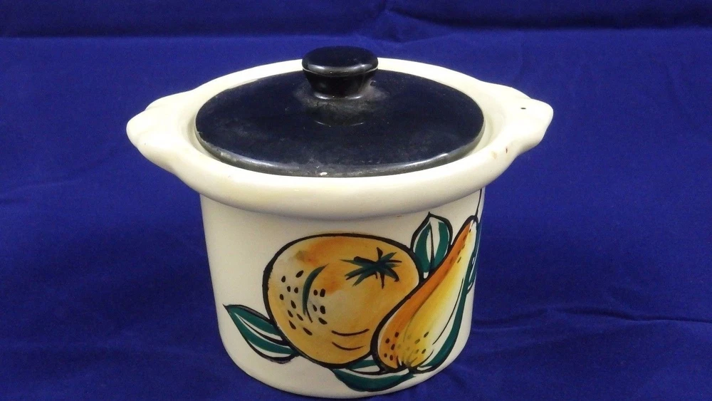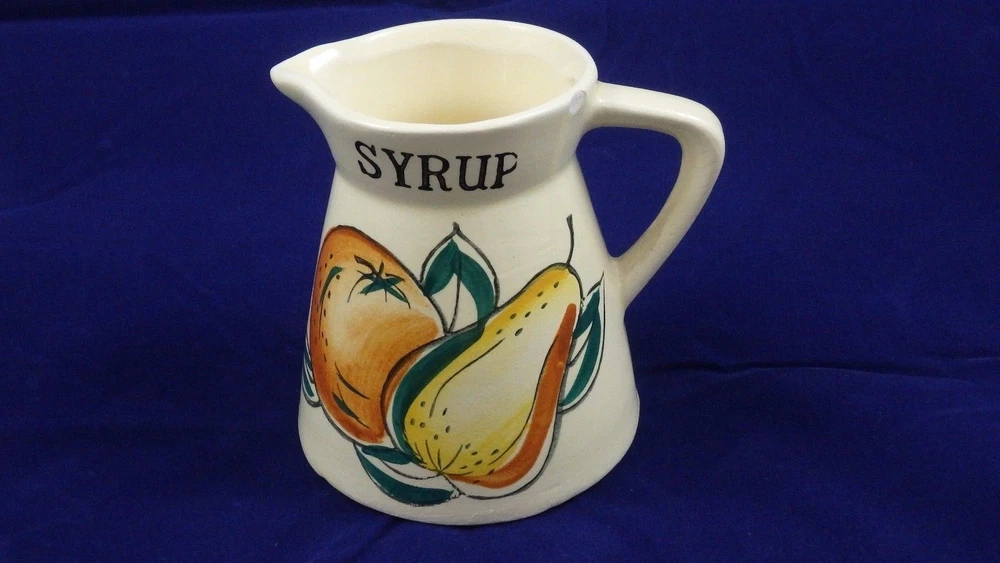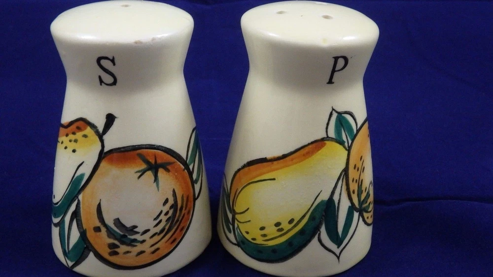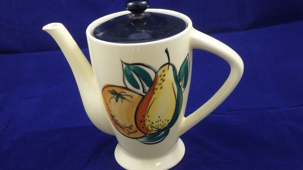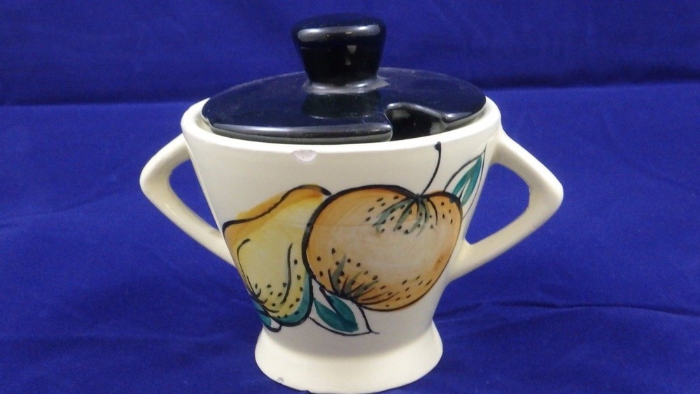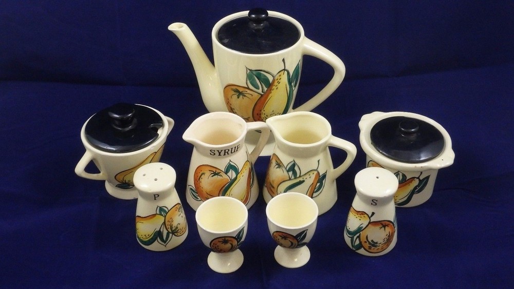 MID-CENTURY TEA SET KITCHEN SET PEARS/ORANGES TEA POT- 5 1/2" TALL 3 3/4" OPEN SALT/PEPPER- 2 3/4" CREAMER- 3 1/2" CREAM/ SYRUP- 2 1/2"OPEN 2 CUPS- 2 1/2 TALL 1 3/4" DIAMETER SUGAR- 3" TALL 2 3/4" OPENING * CHIP ON SUGAR CONTAINER, OTHERWISE NO CHIPS, CRACKS, OR CRAZING! inkFrog Analytics On Apr-15-16 at 11:09:42 PDT, seller added the following information:
