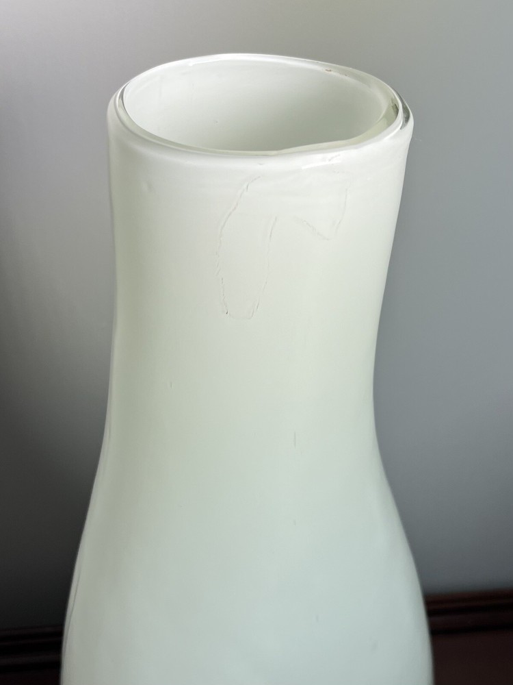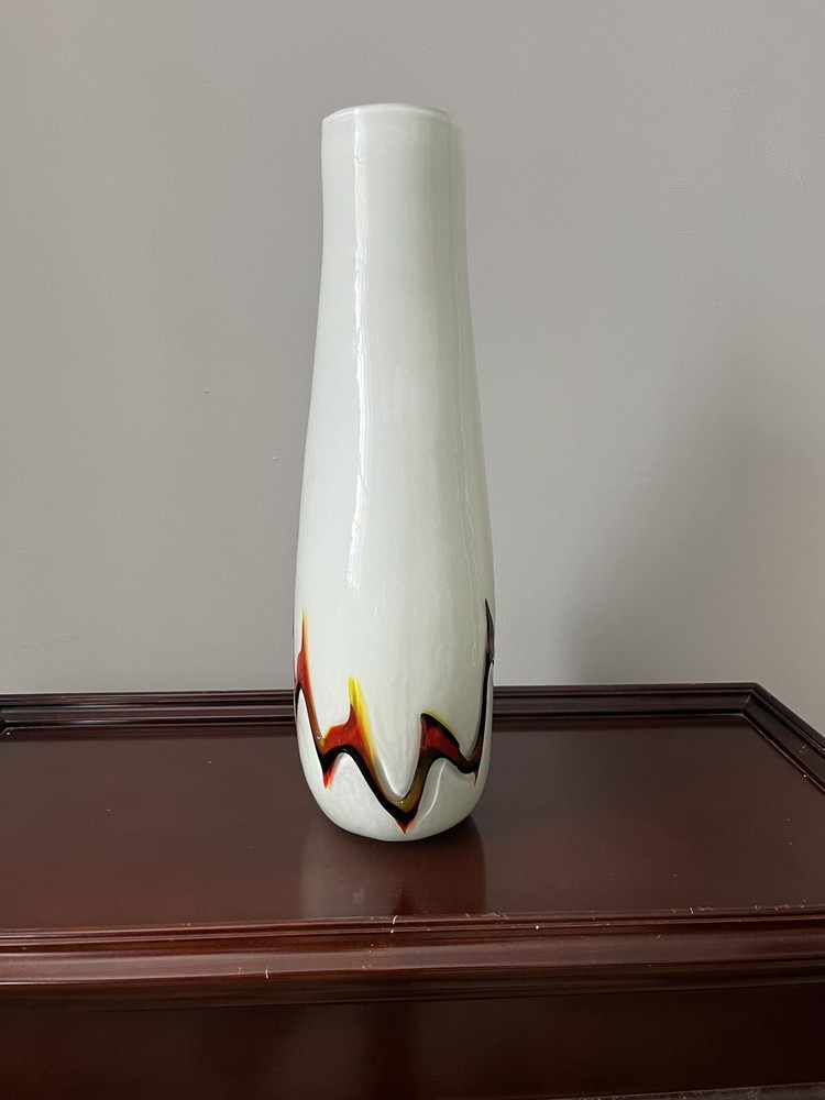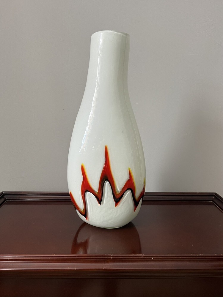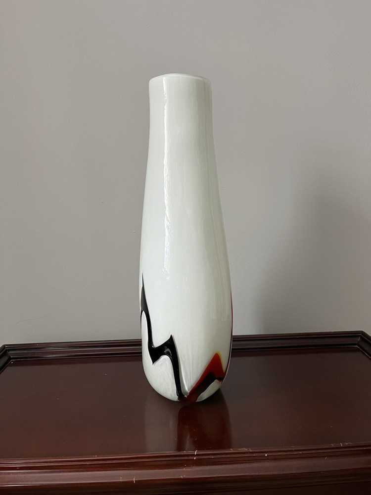 This stunning Murano studio art glass vase is a true masterpiece of modern design. The striking combination of white, black, and orange flame colors creates a bold and unique look that is sure to catch the eye of any collector or art enthusiast. Crafted from high-quality glass material, this vase is a testament to the skill and craftsmanship of Murano artisans. The 16-inch height of this vase makes it the perfect centerpiece for any room or collection. Whether you're a fan of modern design or simply appreciate the beauty of expertly crafted art glass, this Murano vase is sure to impress. Add it to your collection today and elevate the look of any space with its bold and unique style.