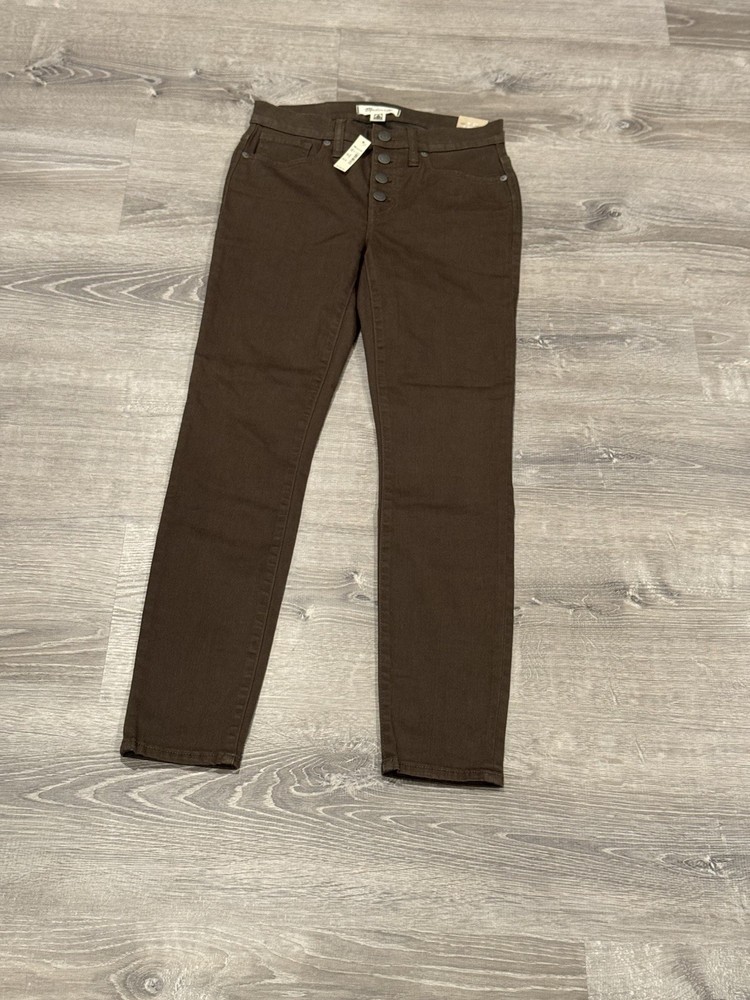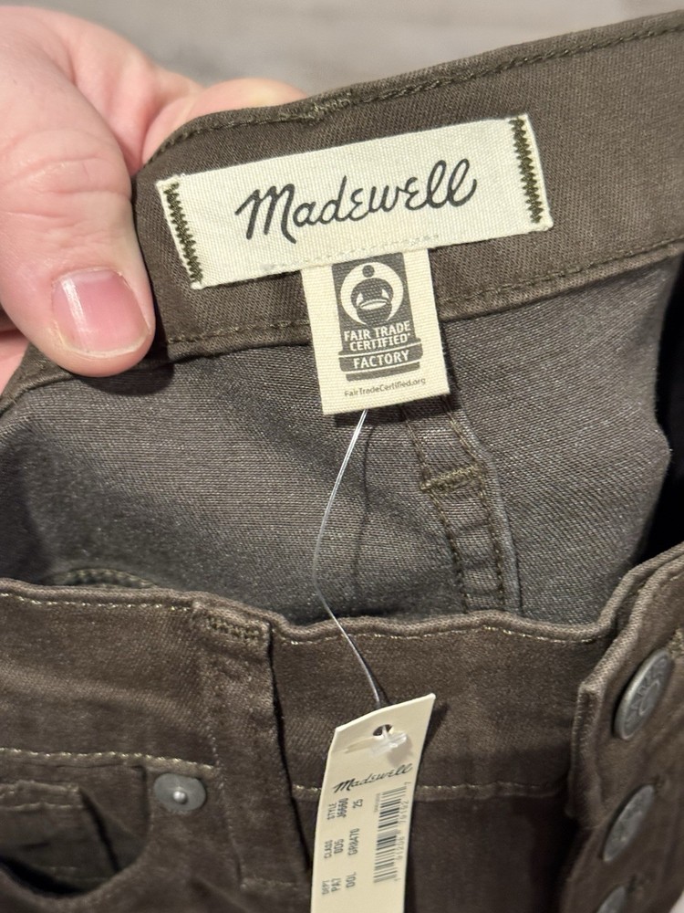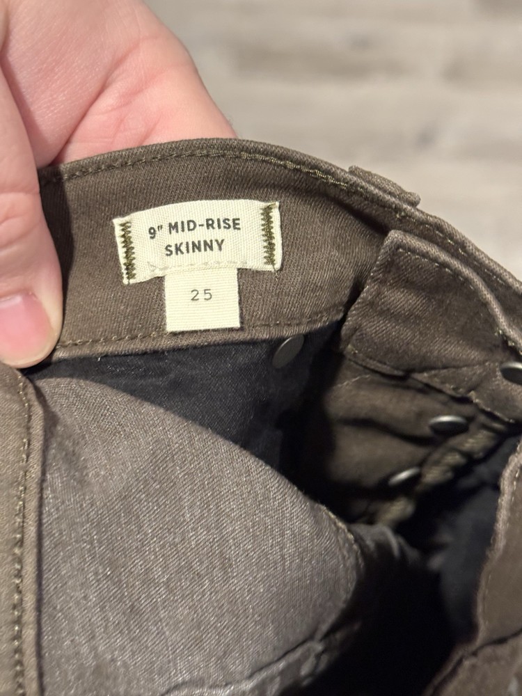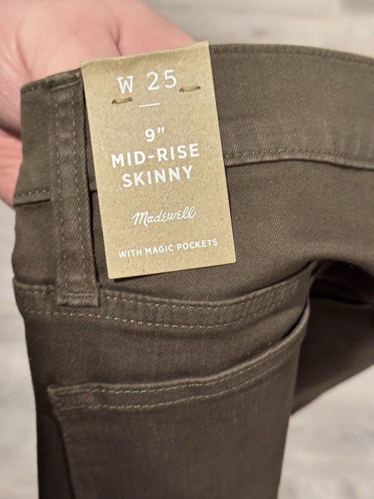The Madewell 9" Mid Rise Skinny Jeans in Olive are a stylish and versatile addition to any woman's wardrobe. With a mid-rise fit and skinny style, these jeans offer both comfort and a flattering silhouette. The garment dye process gives them a unique and trendy color, while the stretch denim fabric ensures a comfortable and easy-care wearing experience. Featuring a classic 5-pocket design and zipper closure, these jeans are perfect for all seasons and can easily be paired with a variety of tops and shoes for a chic and trendy look. Selling as-is