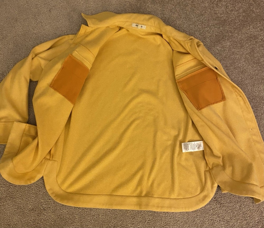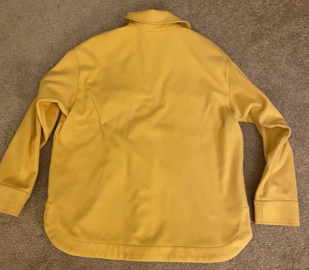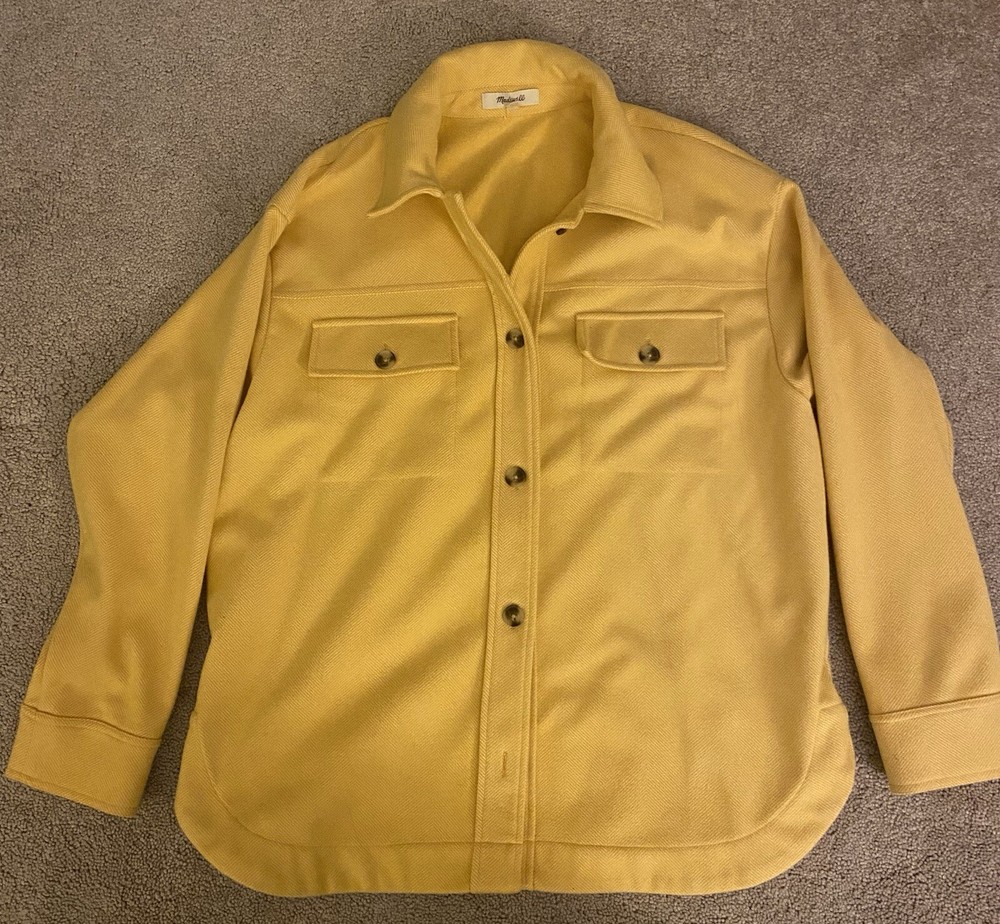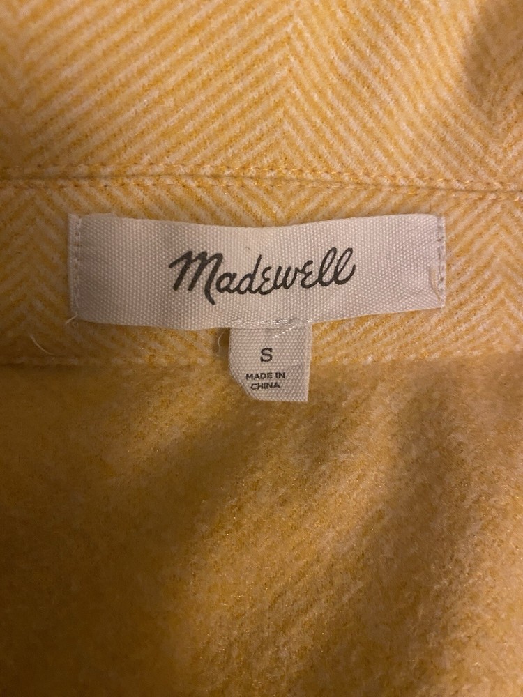 Elevate your wardrobe with this Madewell Brushed Herringbone Knit Shirt Jacket in size small. The mid-length jacket features long sleeves with button closure, perfect for travel, casual outings, and workwear. The orange/yellowish jacket is made of polyester and has a knit fabric type with an oversized fit and pockets. The jacket has a regular fit and is suitable for women. It has a classic basic jacket style with a pattern of herringbone. The jacket is not vintage and is from the Madewell brand. This jacket is a must-have for your wardrobe and can be paired with any outfit.
