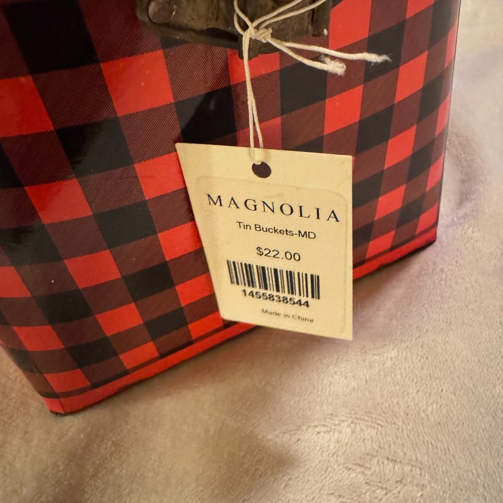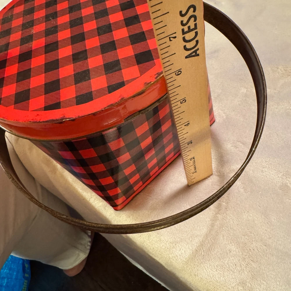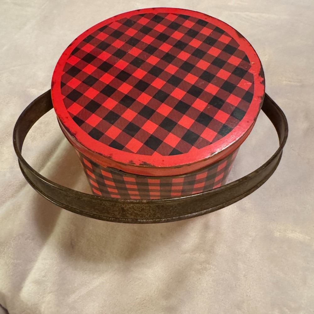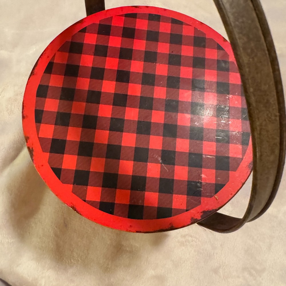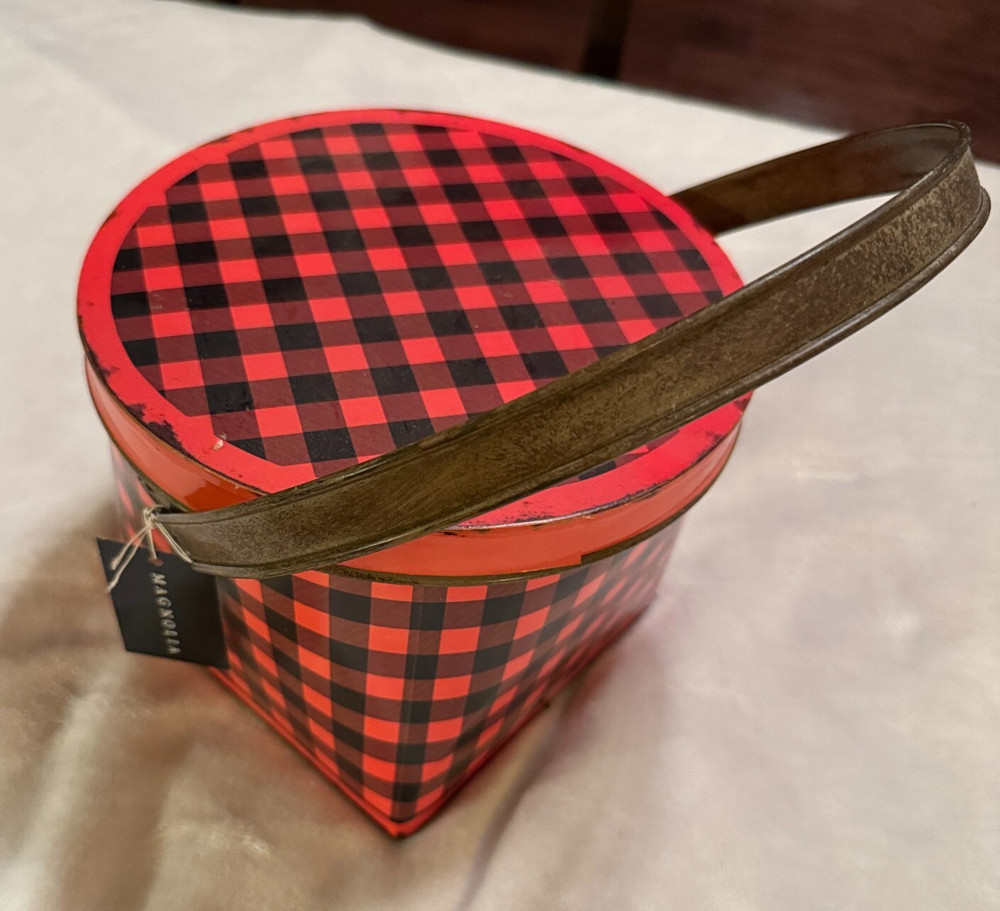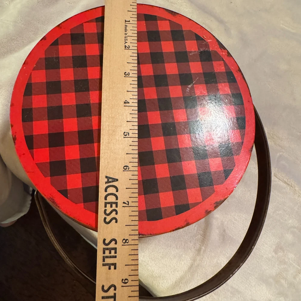 Magnolia Creative Co-op Tin Bucket w/ lid red black gingham berry pail 8" diameter 6" tall...