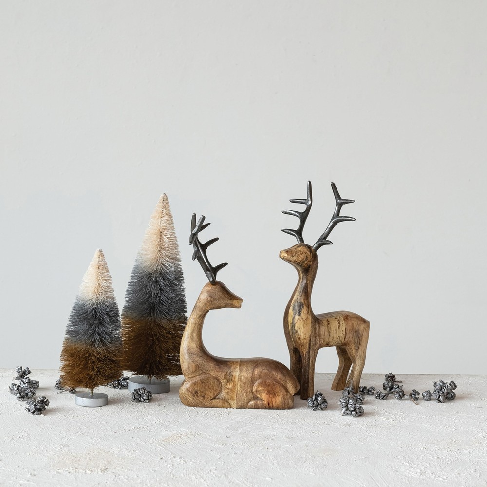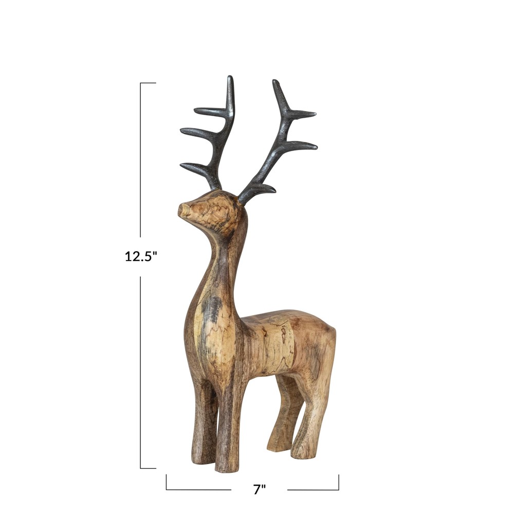 This mango wood standing reindeer with aluminum antlers is a beautiful and convenient way to decorate the home. It features a stunning mango wood standing reindeer with aluminum antlers that gives it a contrast of natural and metallic colors, making it look like a real reindeer. The reindeer has a detailed and refined shape that is pleasant to touch and look at. The reindeer is a stylish and elegant piece that can enhance any style, from cozy to industrial. It is ideal for adding some personality and flair to the home, where it can make any space feel more confident and impressive. The reindeer is made of mango wood and aluminum, which are durable, smooth, and easy to clean. It measures 7 inches in length, 6.75 inches in width, and 12.5 inches in height, making it a noticeable and attractive accessory. This is a perfect choice for anyone who loves stylish and elegant home decor. A stunning mango wood standing reindeer with aluminum antlers that gives it a contrast of natural and metallic colors A stylish and elegant piece that can enhance any style, from cozy to industrial Ideal for adding some personality and flair to the home, this reindeer can be displayed on a floor, a table, or a pedestal Made of mango wood and aluminum that are durable, smooth, and easy to clean 7" L x 6.75" W x 12.5" H