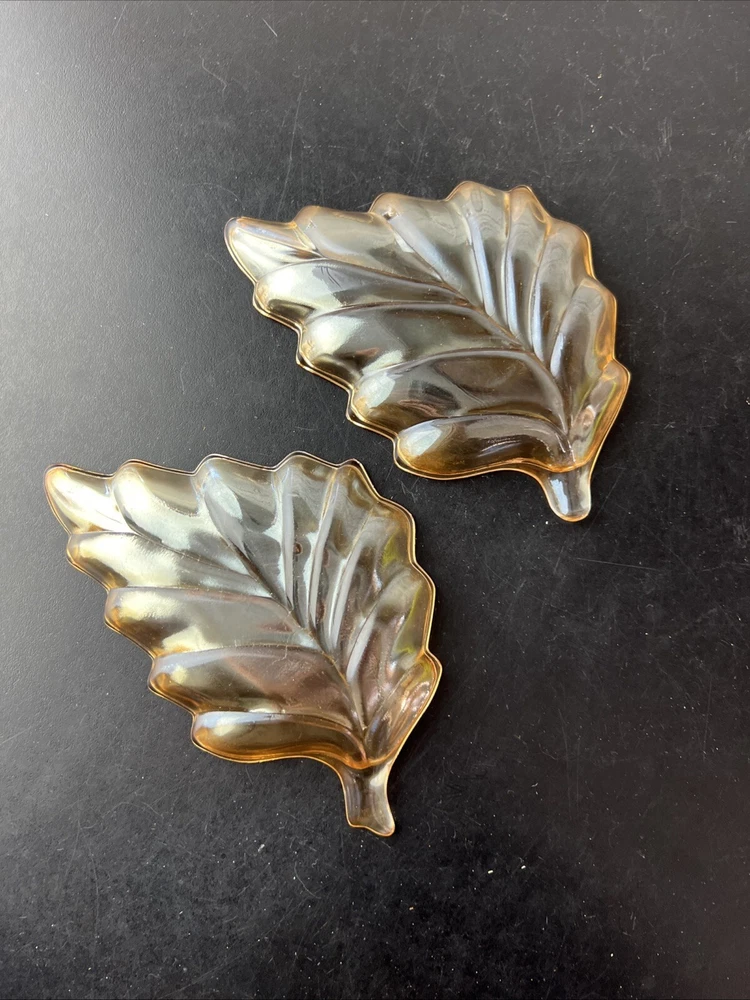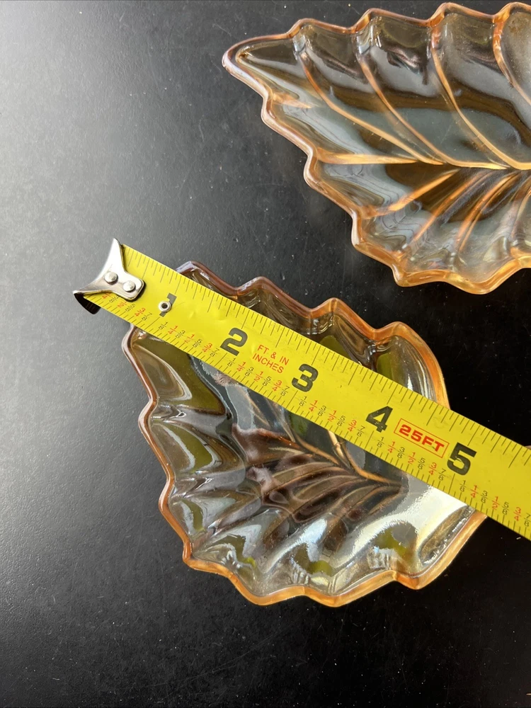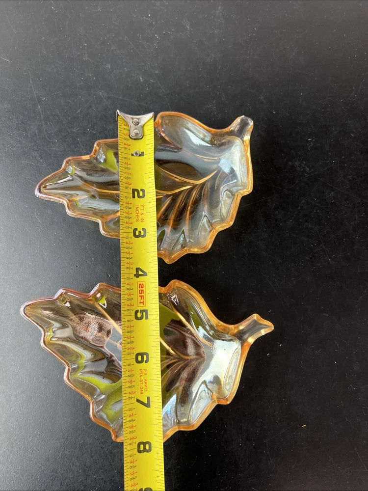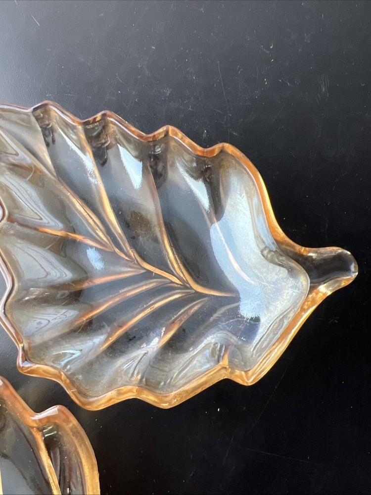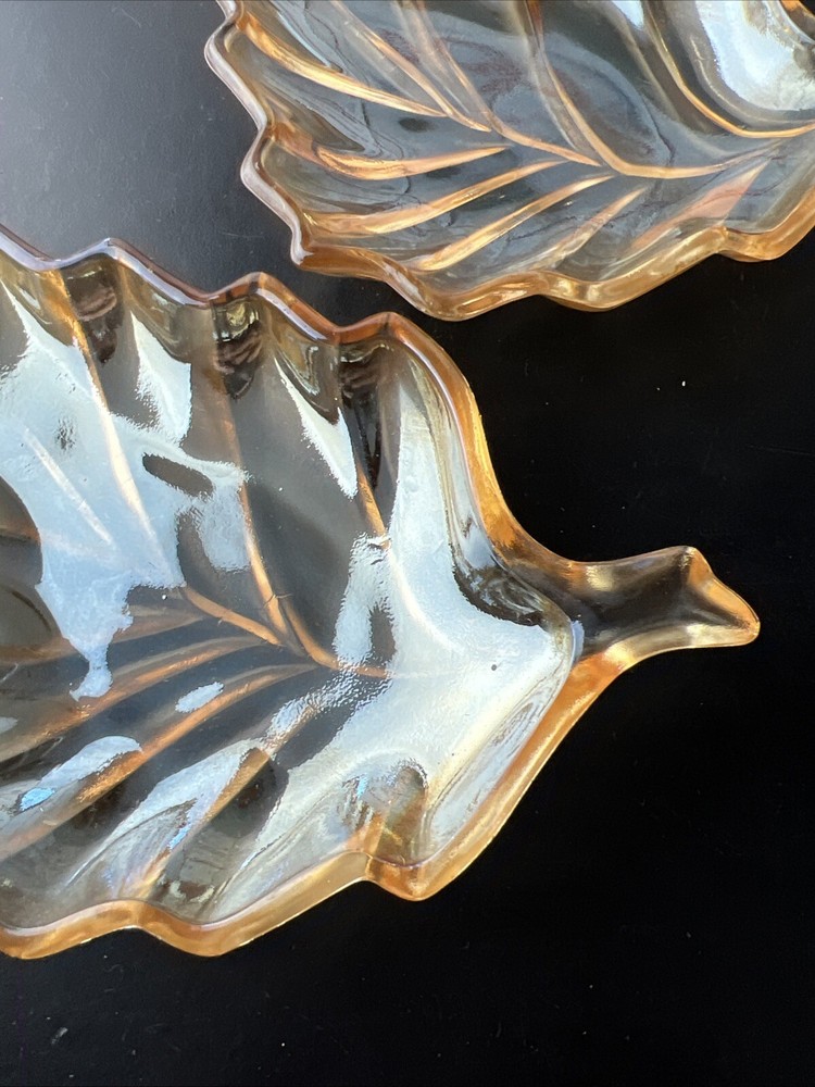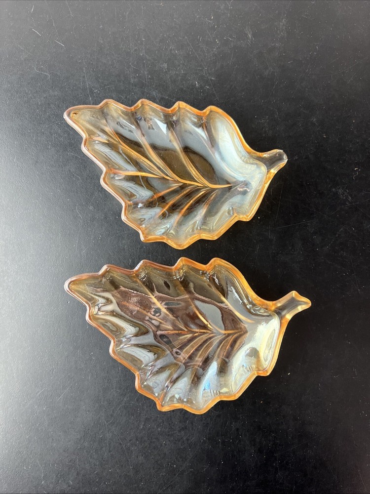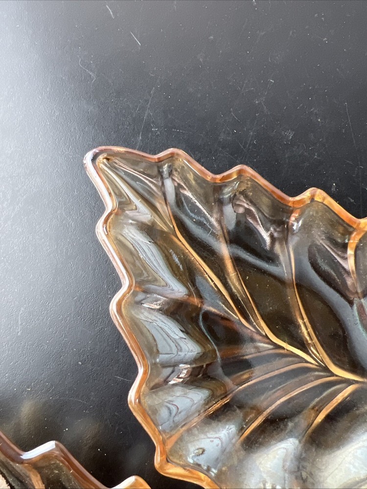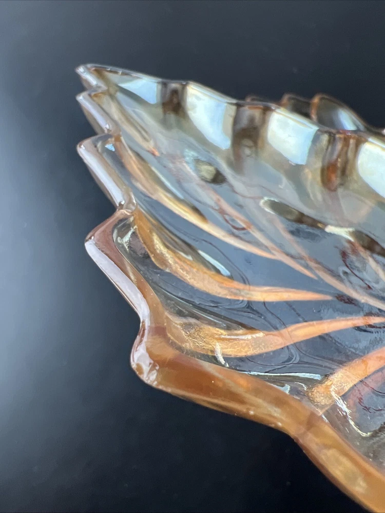 Marigold Carnival Glass Leaf Shape Trinket Dish What is pictured is the lot you will be receiving. This is being sold as is. Please look over the pictures to determine condition. If you have any questions about the listing please feel free to ask and I will respond as quickly as possible. Buyer pays shipping unless otherwise stated and I do combined shipping however you will have to wait until the other item is done and I have sent you the invoice.. Payments are due within 5 days of winning the auction. Thanks for looking and happy bidding!!