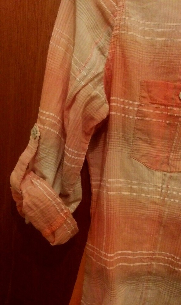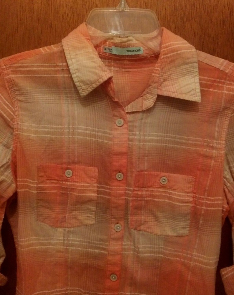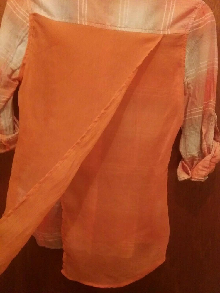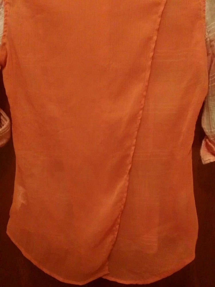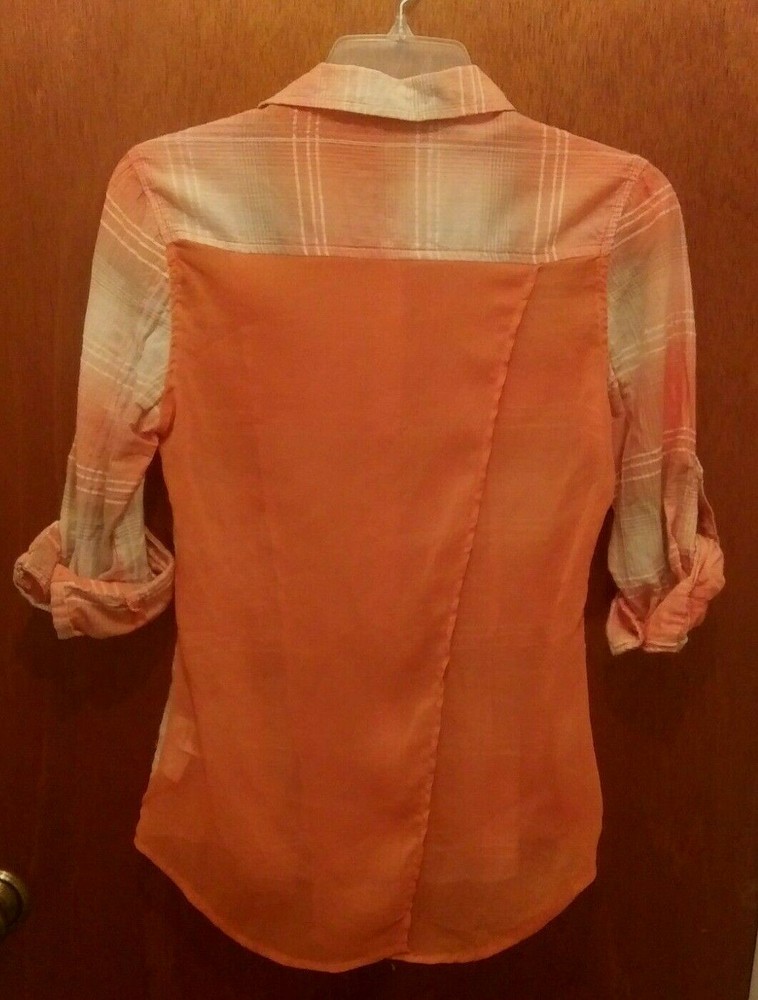 Orange Plaid Button Down Top with Roll Tab Sleeves and Open Sheer Back-So Cute! Orange, brown/tan and white plaid top made by Maurices. Size Small. Roll tab sleeves. Pearl button down, two front pockets with buttons. Split back, semi sheer. 100% cotton, back is 100% polyester. Super cute top! Thanks for looking and check out my other items-I do combine shipping! Please message me with any questions or if you need more pictures or information
