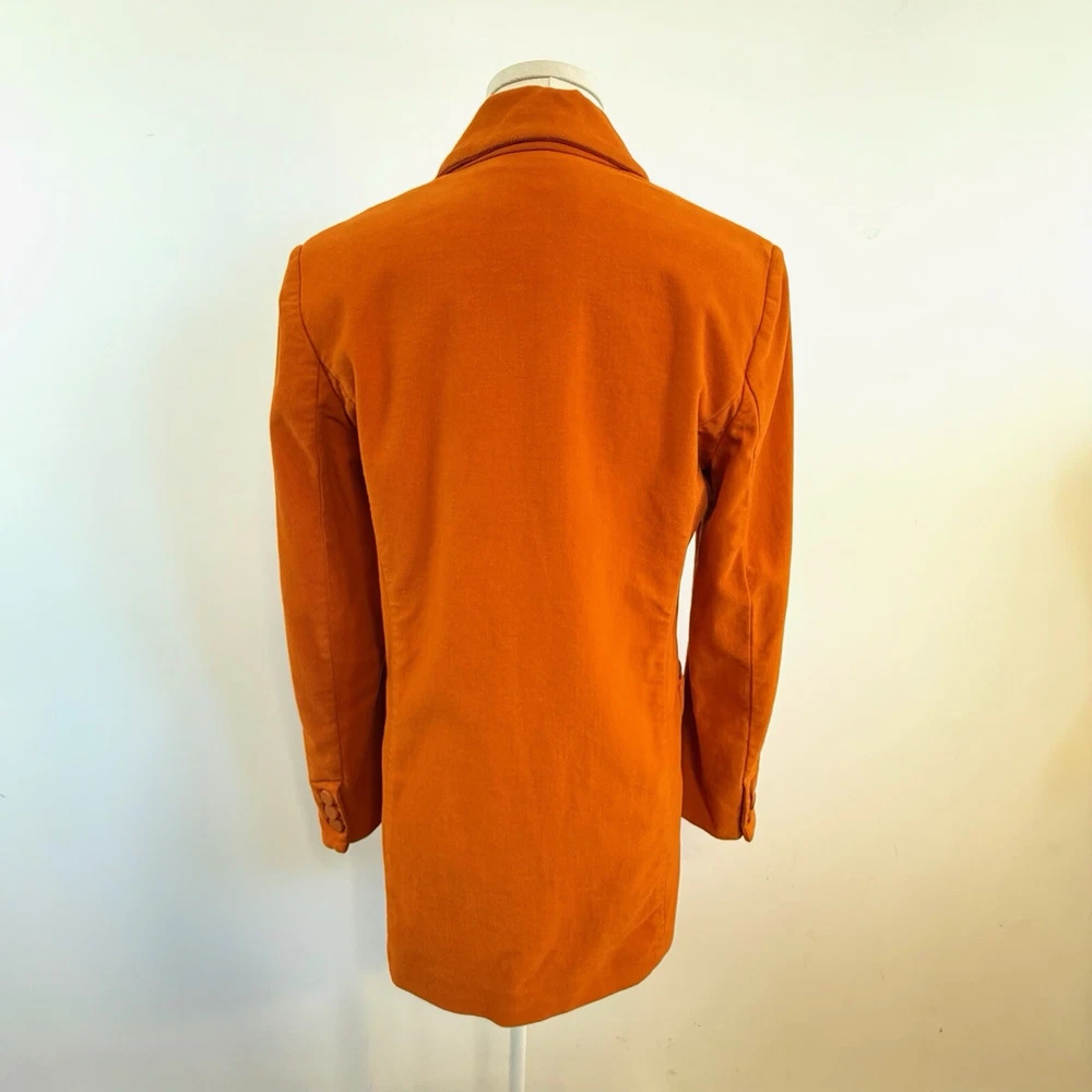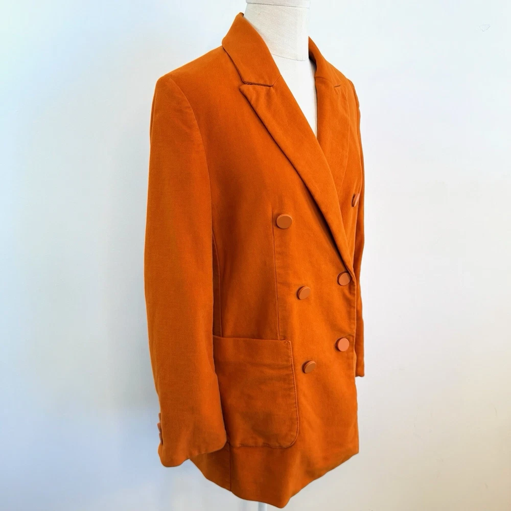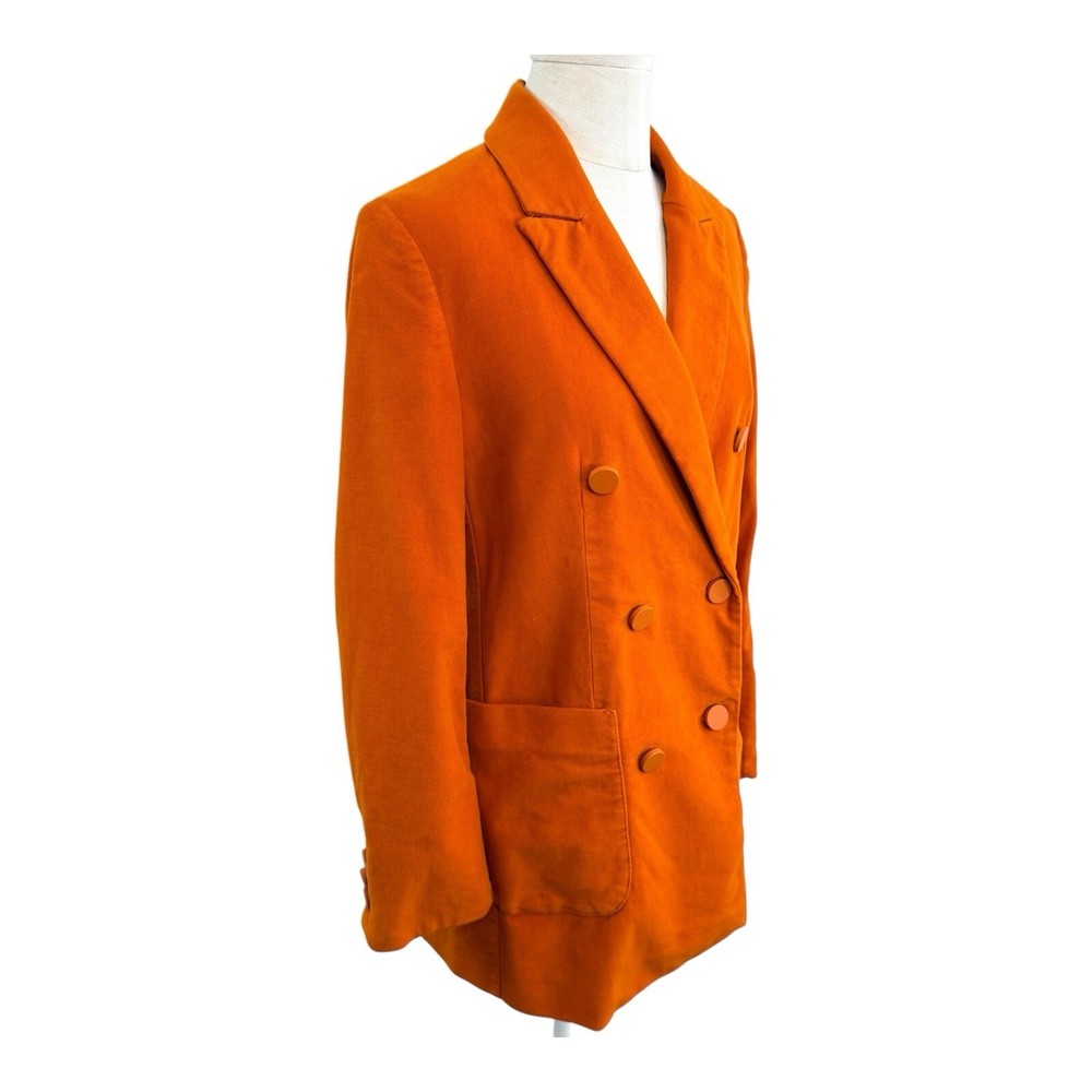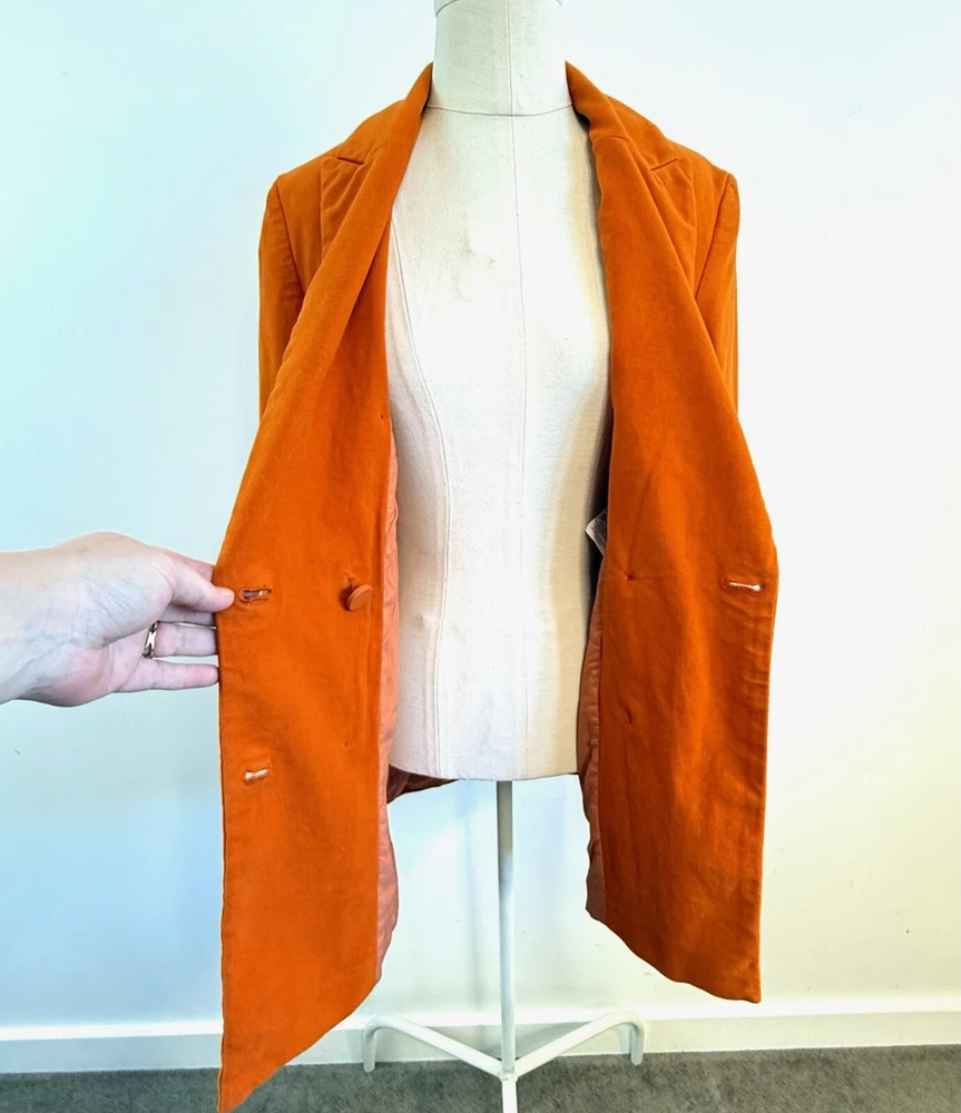 Welcome to Designer Loot and thanks for looking... Stay on-trend with this Max & Co Orange Velvet Double Breasted Fustian Blazer Jacket in size XS 6. Made from a comfortable Cotton Elastane blend, this mid-length blazer features long sleeves and a solid pattern. Perfect for any occasion from casual outings to business meetings, this designer piece is a must-have for your wardrobe. Complete with double button fastenings, lined interior, and pockets, this blazer is ideal for the cooler seasons of Winter, Autumn, and Spring. Elevate your style with this chic and versatile jacket from Max & Co (max Mara). New without tags Brand label has been removed Measurements, laid flat, unstretched, one side, in cm Width across back from underarm to underarm: 45cm Shoulder to hem length: 73cm We sell carefully curated designer clothing and accessories, and add new pieces regularly. TERMS + CONDITIONS Please see our excellent feedback. We are proud of our level of service and strive to be honest and reliable sellers. Our items have been well cared for, but have had a previous life. New pieces may be slightly shop soiled. All obvious flaws and marks are described. Photos form part of the item description. Colours can differ on screens. Larger size items may have been pinned on our dress form (which is a size 12). We have a smoke free home. Please feel free to ask any questions. Payment is required within 4 days. We use prepaid tracked Australia post satchels within Australia. For combined shipments we will fit as many items as possible into pre-paid satchels. We usually post on the same business day. International Postage is usually $28. Taxes and duties are the buyer's responsibility. Please let us know if you think we've missed something, and we'll fix it. We offer a full refund service and we will fairly resolve any issue. Returns will only be considered within 7 days of the buyer’s receipt of the item. The item must be returned via tracked mail. Buyer pays return post (unless we are at fault). Please give five star feedback and thanks for shopping with Designer Loot.