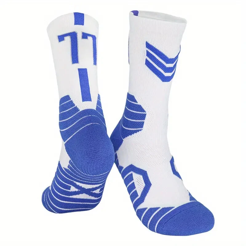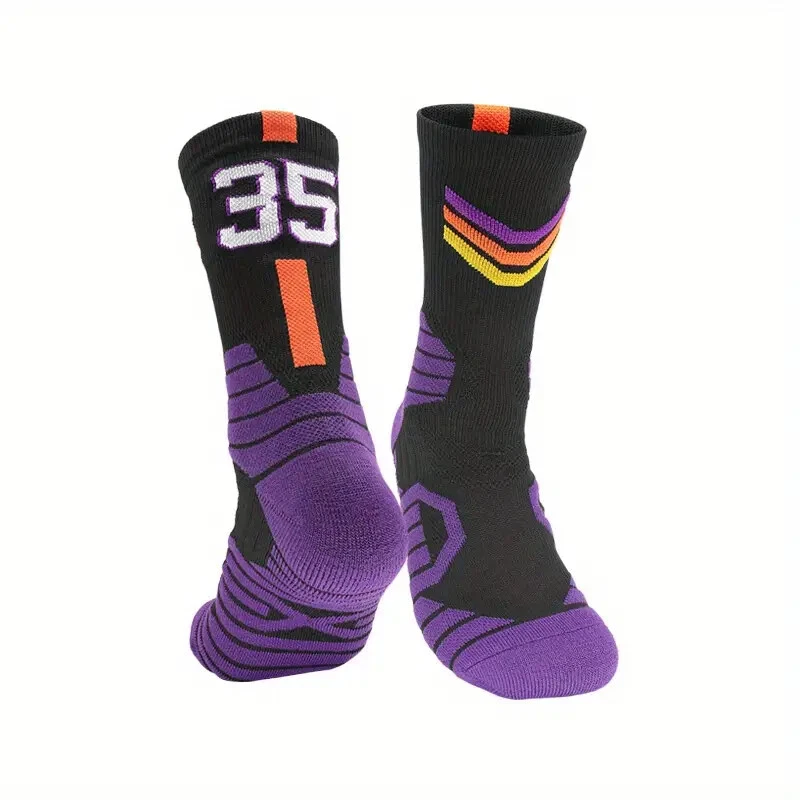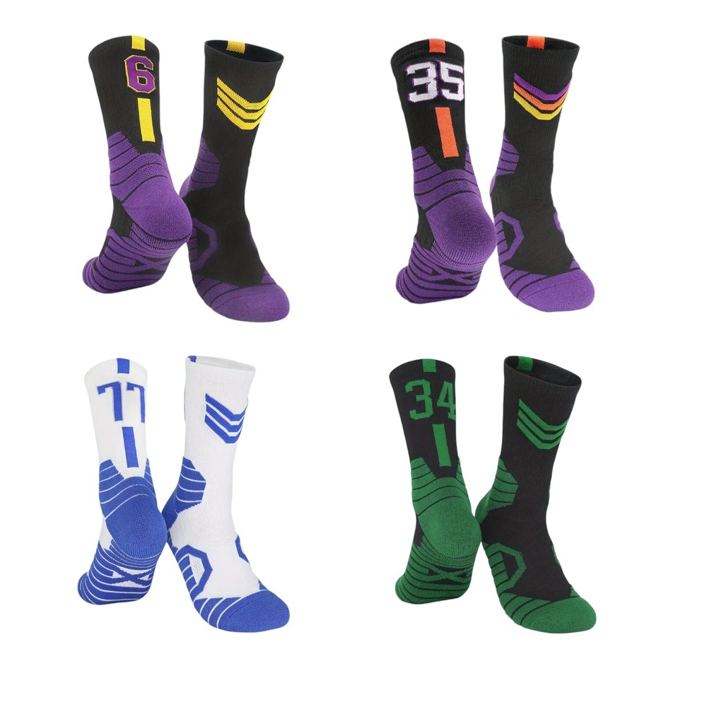 Men's Elite Cushioned Dri-Fit Socks Quantity: ONE (1) Pair Size: US Large (shoe size 6-12) Material: 80% Polyester/ 20% Spandex Features: - Cushioned toe and heel - Mid calf length - Basketball player jersey number on back Shipping: All orders ship within 24 hours (one business day) of payment Returns: accepted within 30 days of purchase