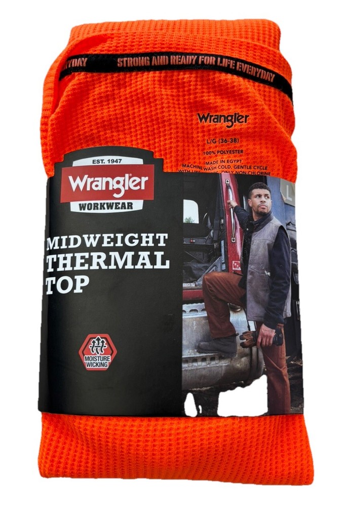 This men's Wrangler Workwear Mid weight Thermal Top is perfect for those who need to stay warm and comfortable while working. The top is made of a durable polyester blend material and comes in a vibrant orange color. It features a moderate compression level and is designed to fit the chest and abdomen areas. The thermal top is a single pack item and has a mid-rise style. It is suitable for men of size L and is perfect for winter sports and outdoor activities. The top is equipped with thermal features to keep you warm in cold weather. Get your hands on this high-quality thermal top from Wrangler and stay comfortable while working or playing.