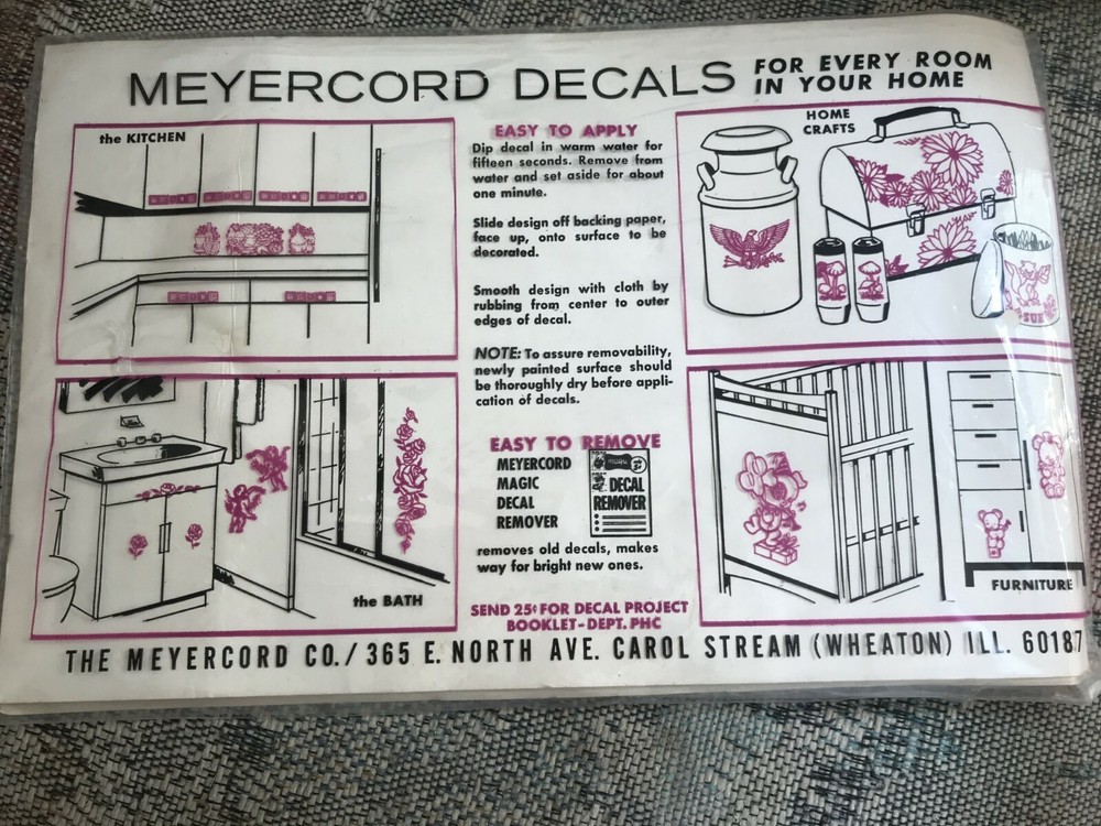 New in package vintage Meyercord Decorator Wall Decal Item #1533-A Decal is orange water lilies and is approximately 12". Package is torn on the side but the decal has never been removed and is unused.