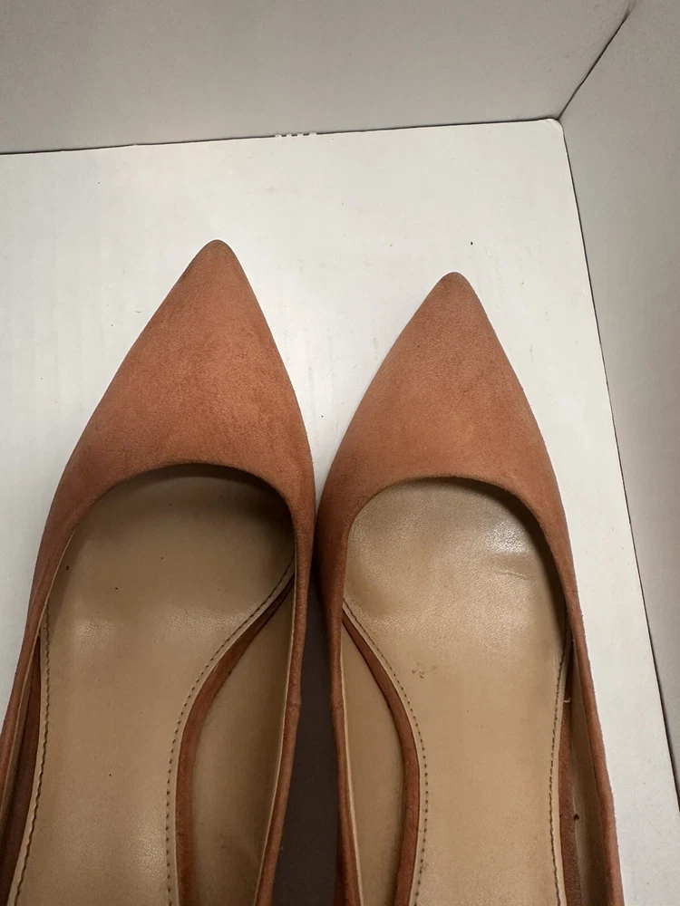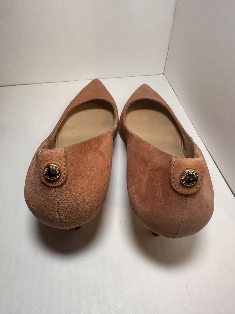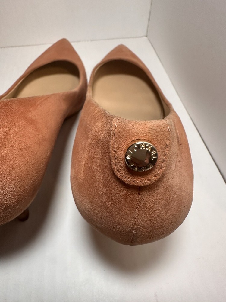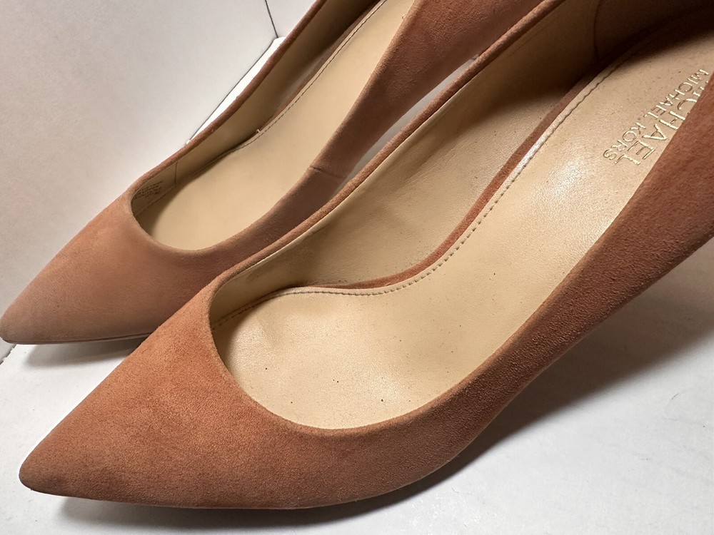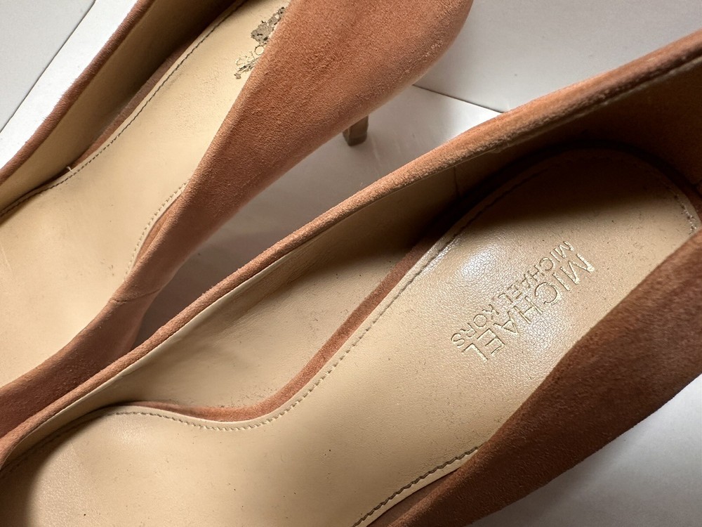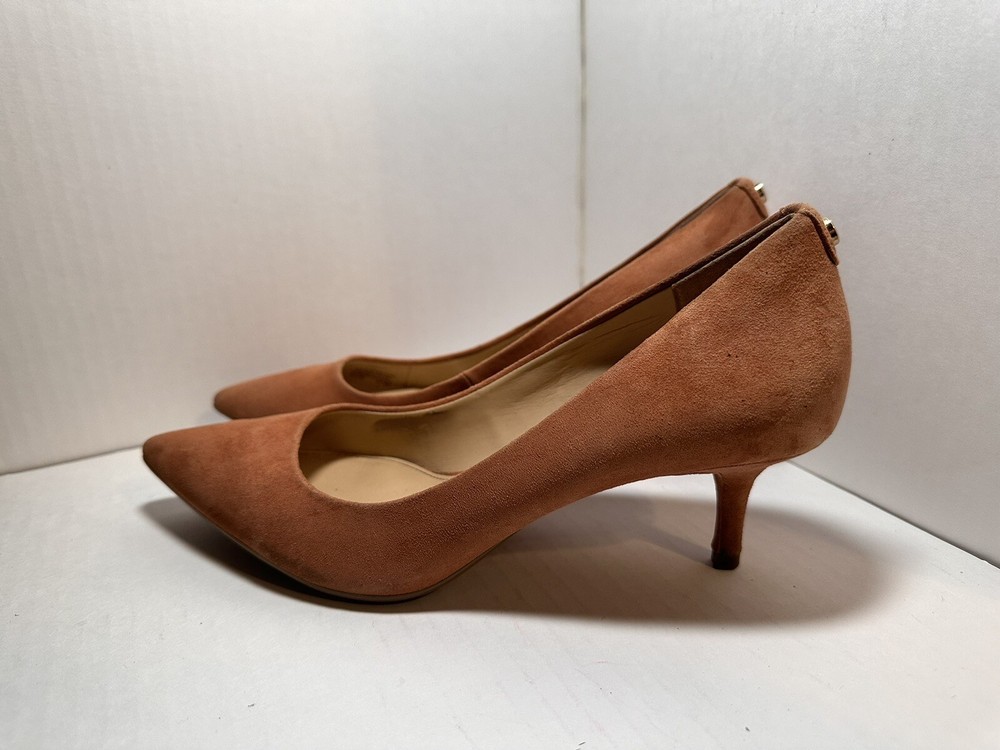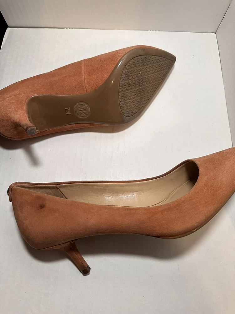 Elevate your shoe collection with these stunning Michael Kors pumps in a gorgeous orange hue. The pointed toe and mid-heel style make them a classic choice, perfect for any occasion. The slip-on design and leather/suede upper material offer both comfort and style. The shoe features the Michael Kors logo as an accent and has a solid pattern. It comes in US shoe size 7 and has a Stiletto heel style. The lining and insole material are both made of leather, while the outsole is made of leather as well. These pumps are a must-have for any fashion-forward woman. Please note that shoes are in EUC. Maybe just need a little cleaning but other than that the shoes are in great condition. Please review the images and ask questions.