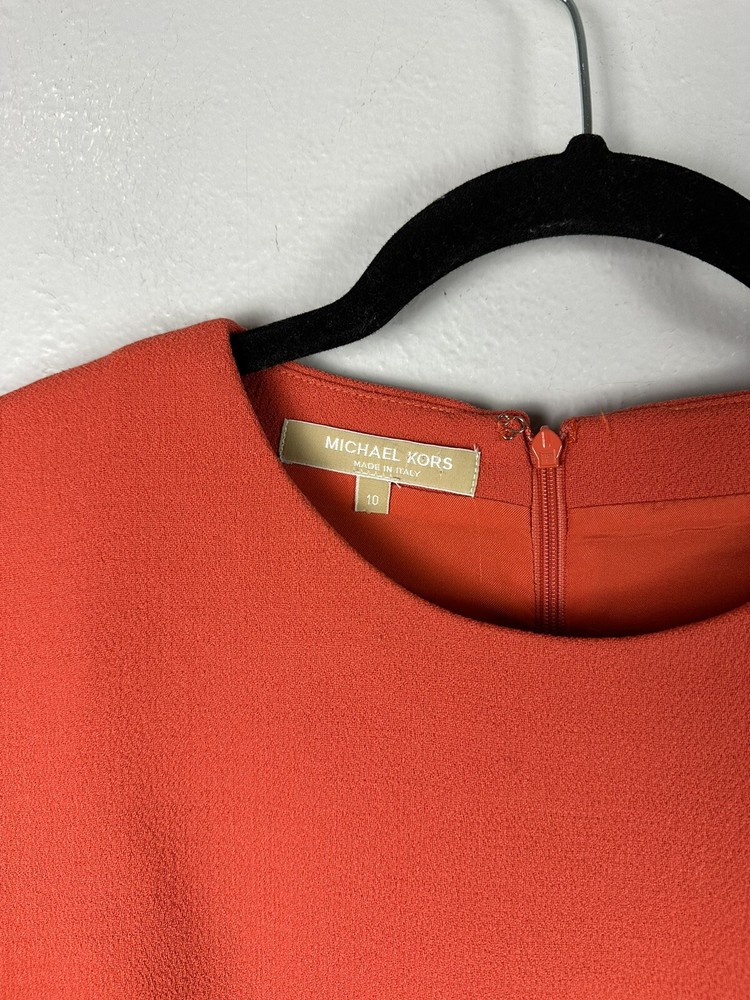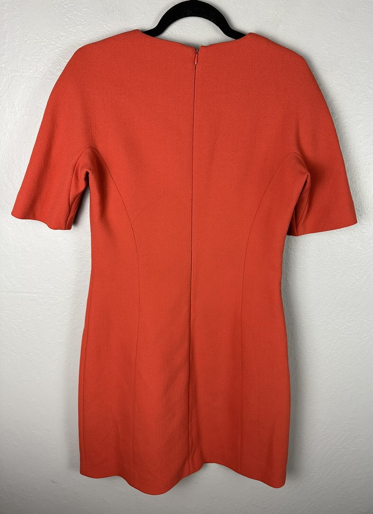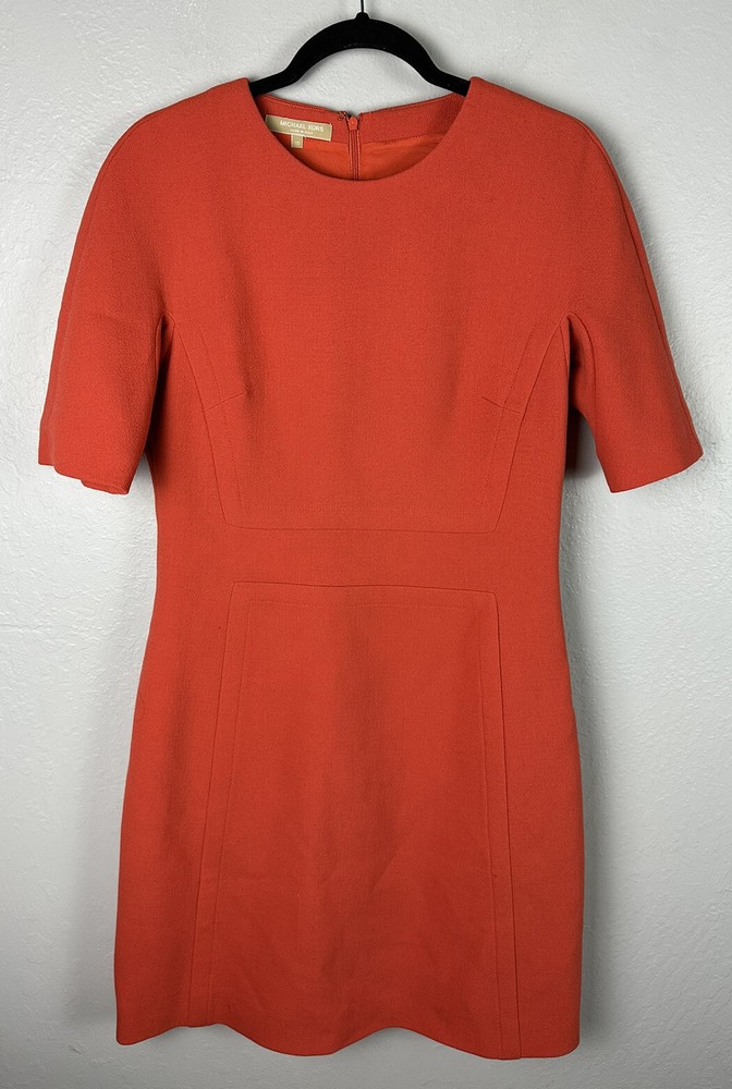 19.5” pit to pit 38.5” length 16” across waist 21.5” across hips Color is more orange than it shows in the pics Michael Kors Italy Orange Sheath Dress Wool Size 10....