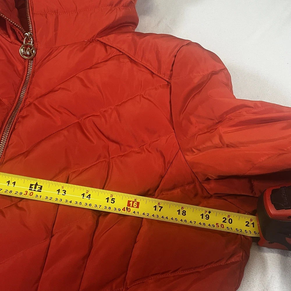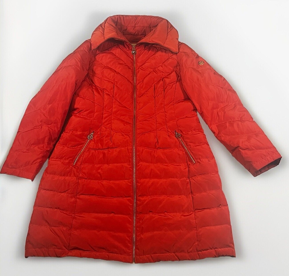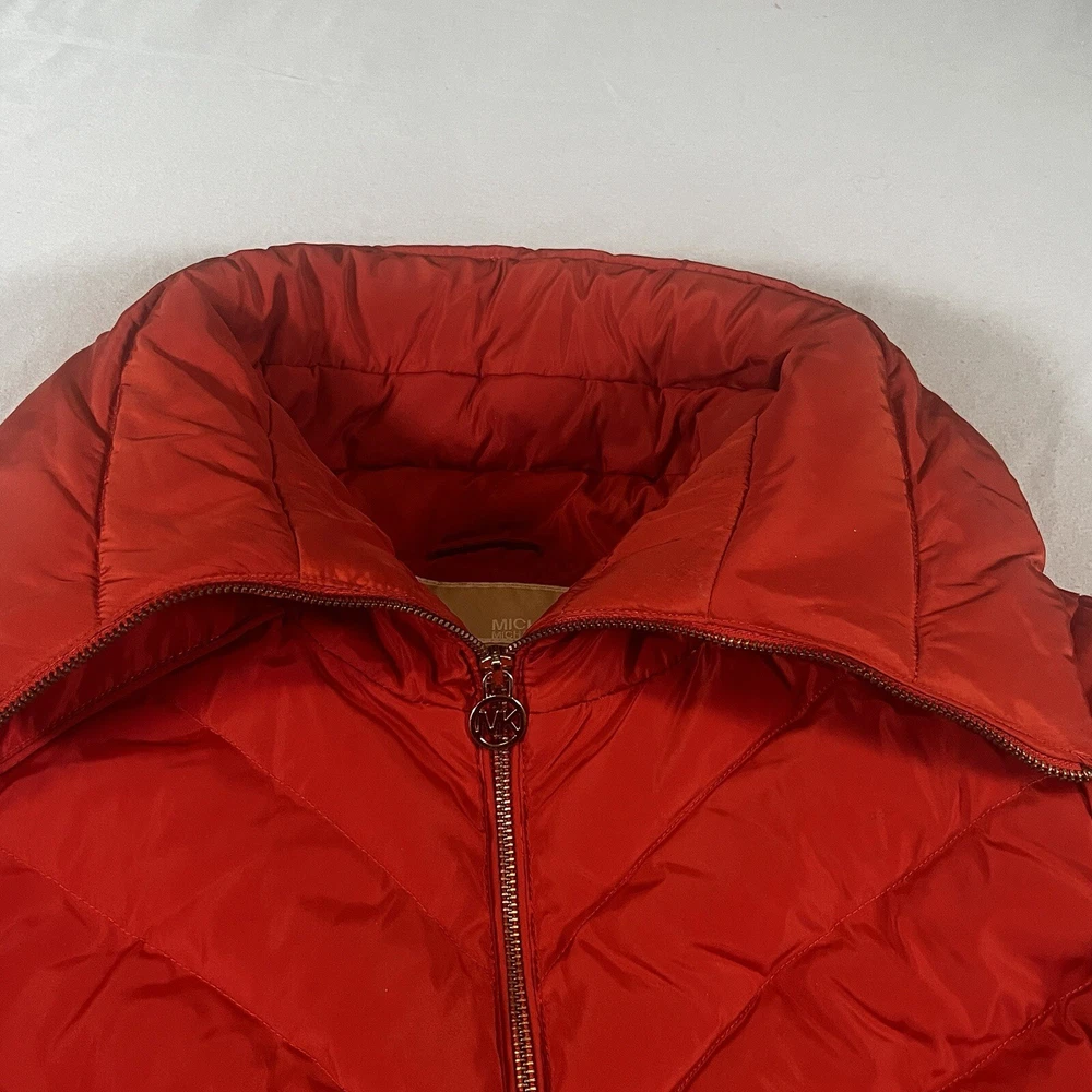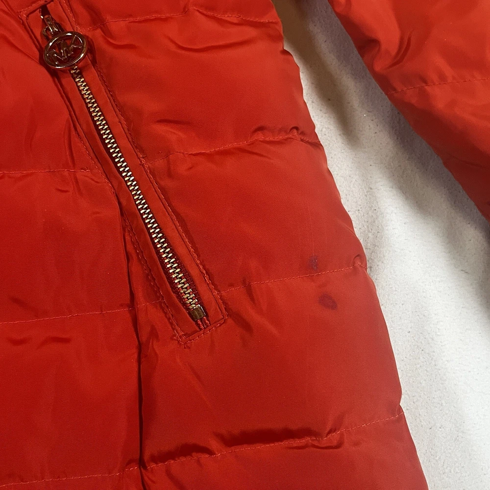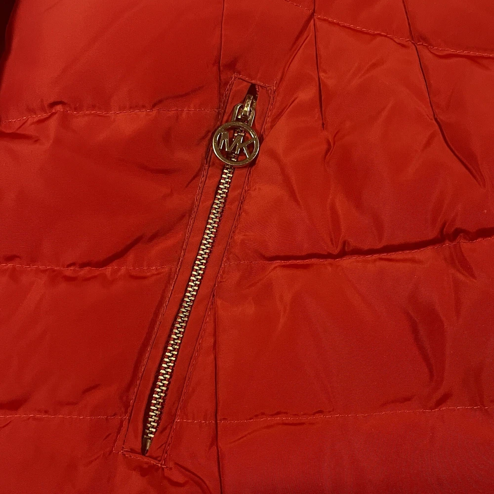 Two pinholes in jacket where small amounts of down can come out if someone is trying to pull it out. Couple small stains that may or may not be able to come out with a dry clean. Please see pictures to determine if the noted damage is acceptable to your taste. Price is reduced due to defects. Stay warm and stylish this winter with the Michael Kors Orange Down Turtle Neck High Collar Mid Length Puffer Jacket. This slim-fit coat features a quilted design, gold tone logo accents, and a full zip closure for a chic look. With insulated and water-resistant properties, this jacket is perfect for all occasions, whether you're travelling, running errands, or heading to the office. Pair it with your favourite outfit for a trendy winter ensemble that will keep you cozy and fashionable.