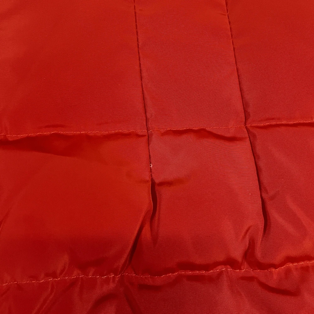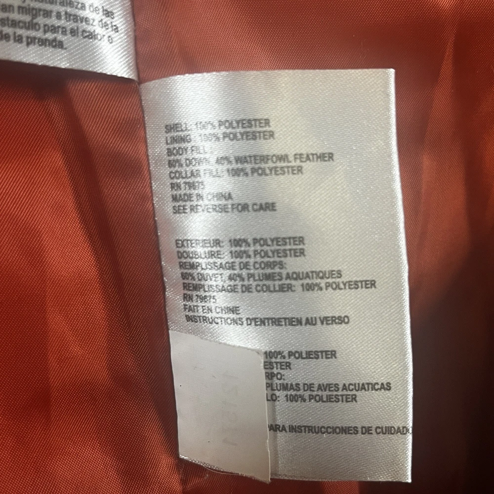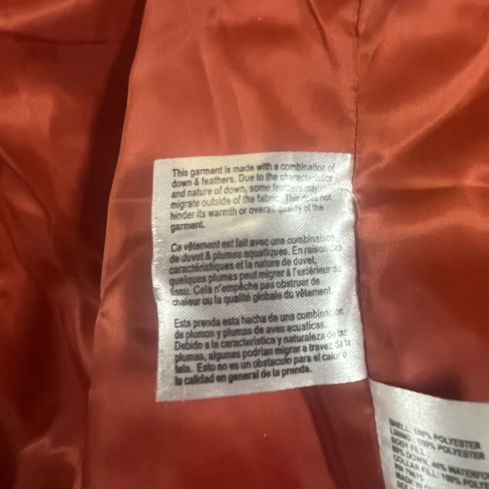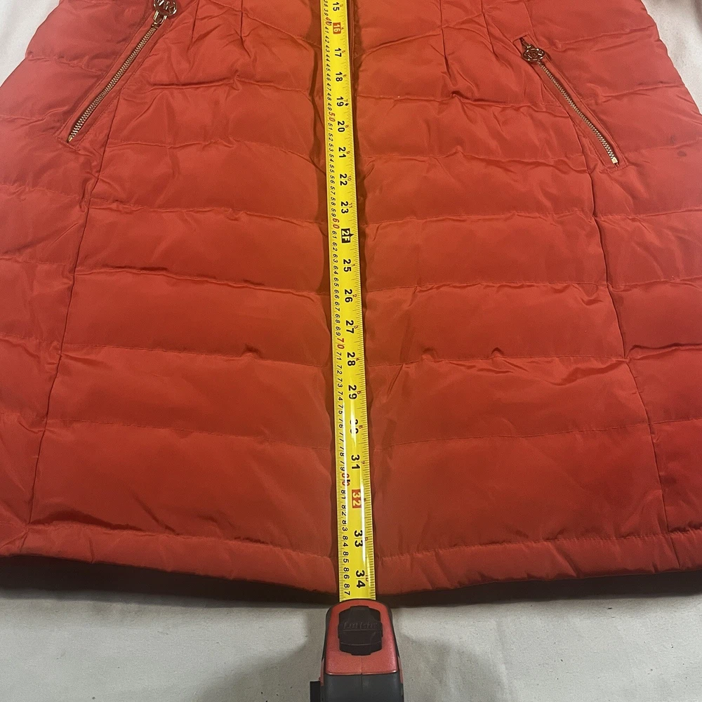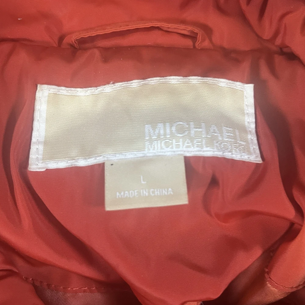 Two pinholes in jacket where small amounts of down can come out if someone is trying to pull it out. Couple small stains that may or may not be able to come out with a dry clean. Please see pictures to determine if the noted damage is acceptable to your taste. Price is reduced due to defects. Stay warm and stylish this winter with the Michael Kors Orange Down Turtle Neck High Collar Mid Length Puffer Jacket. This slim-fit coat features a quilted design, gold tone logo accents, and a full zip closure for a chic look. With insulated and water-resistant properties, this jacket is perfect for all occasions, whether you're travelling, running errands, or heading to the office. Pair it with your favourite outfit for a trendy winter ensemble that will keep you cozy and fashionable.