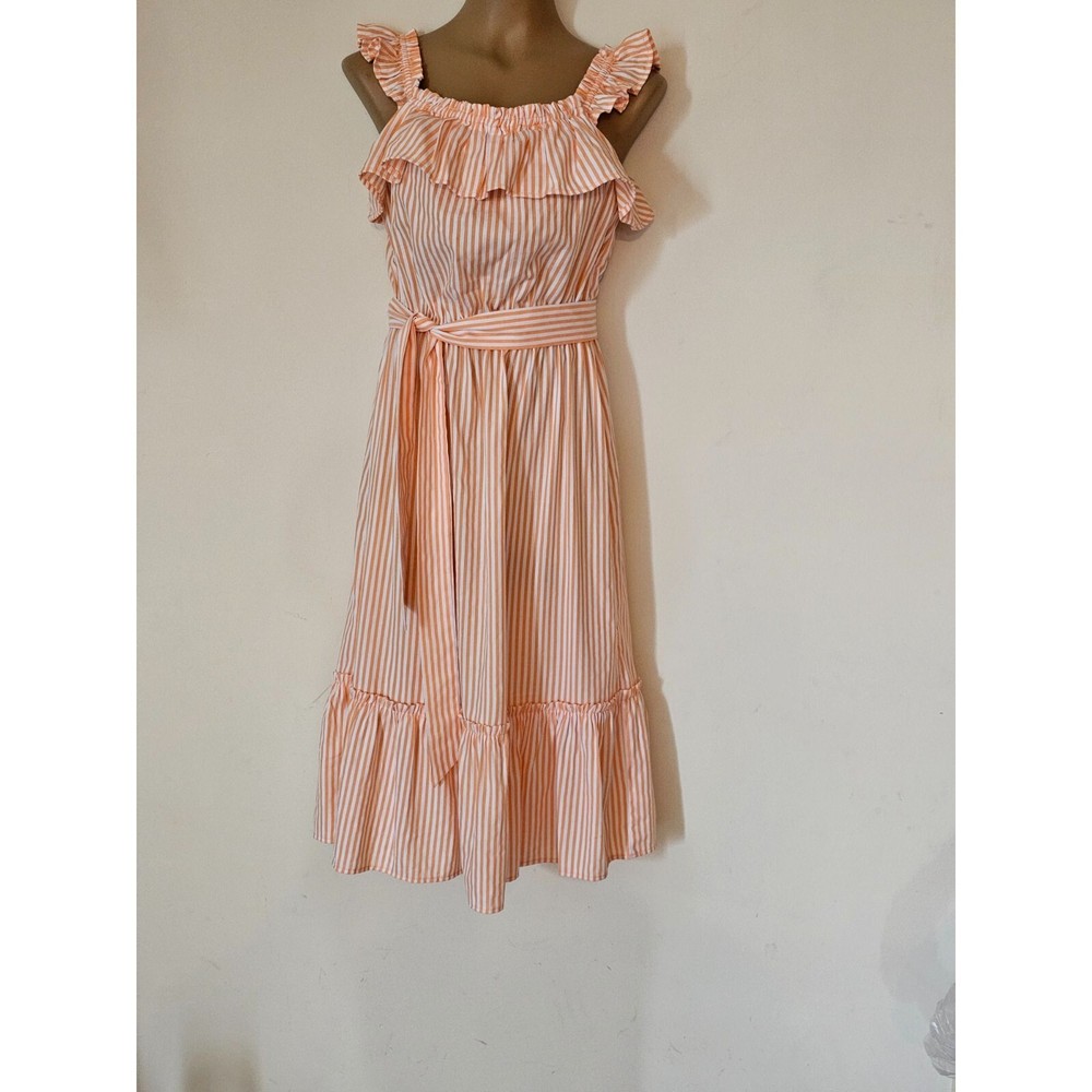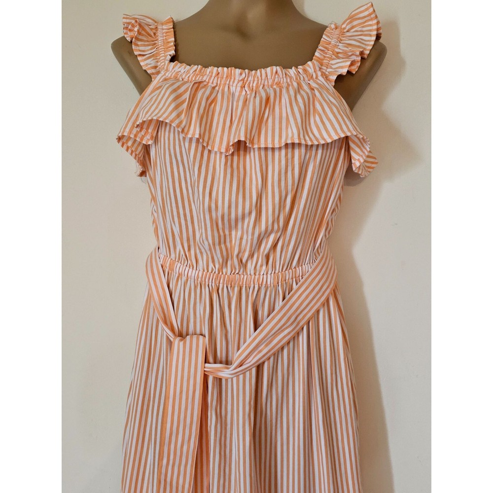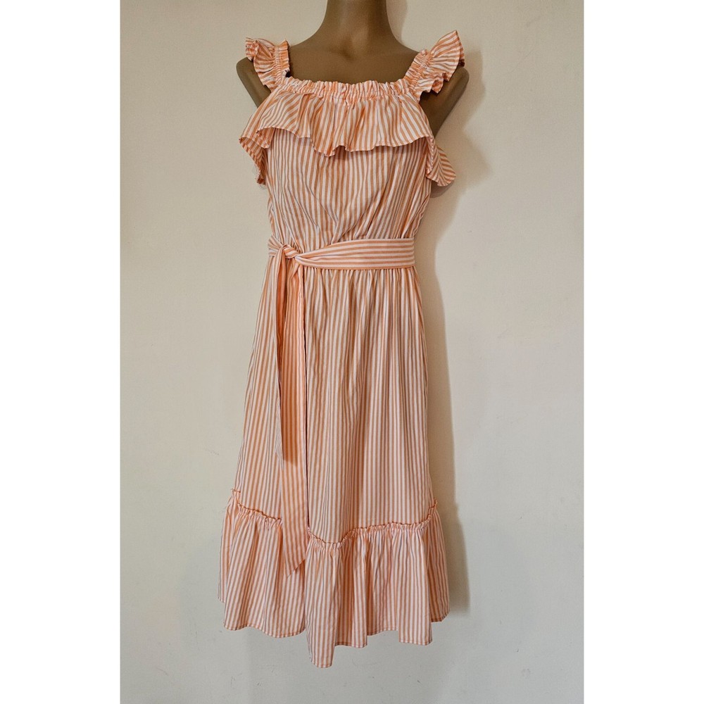 Michael Kors orange & white striped Summer Dress Boho Peasant Ruffle Neck Size S 4-6 Elastic Waist, Tie Belt Never worn No Tags Chest: 19" across Length: 46" shoulder to hem Fast shipping from a clean, smoke-free, dog-friendly home.