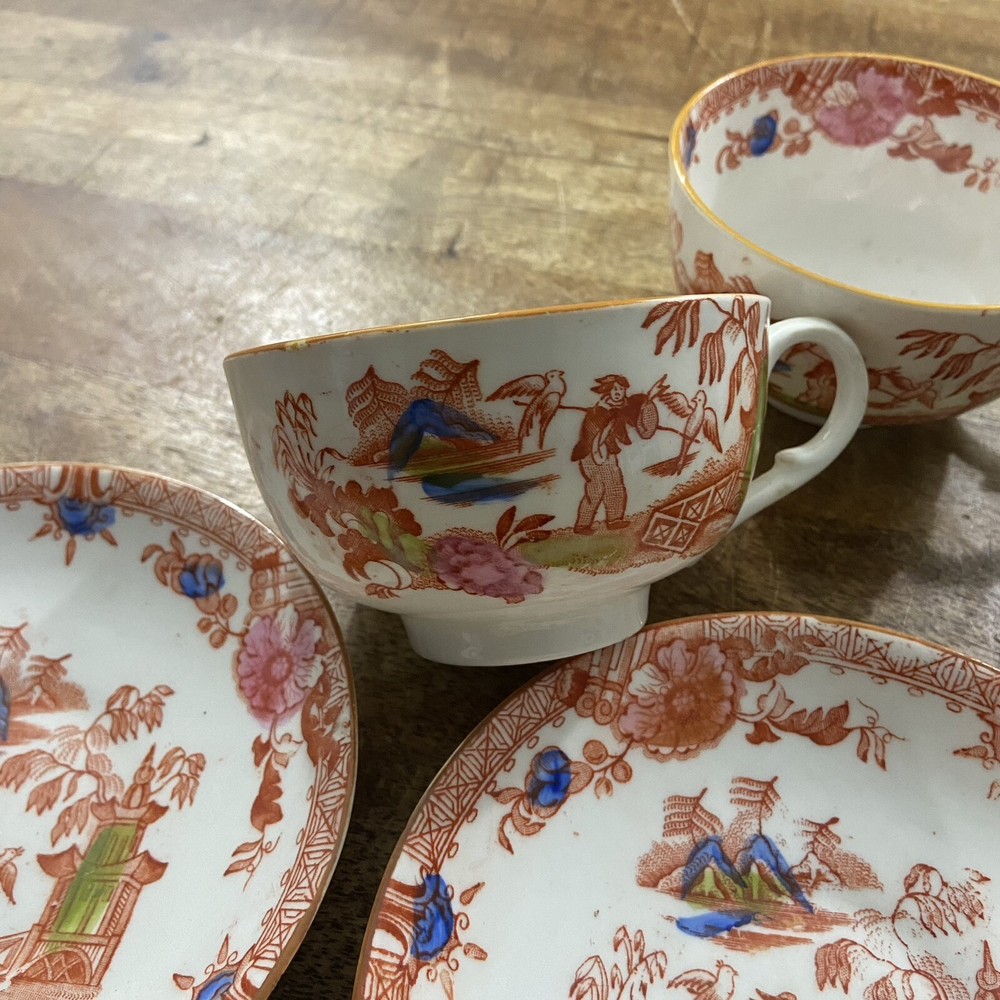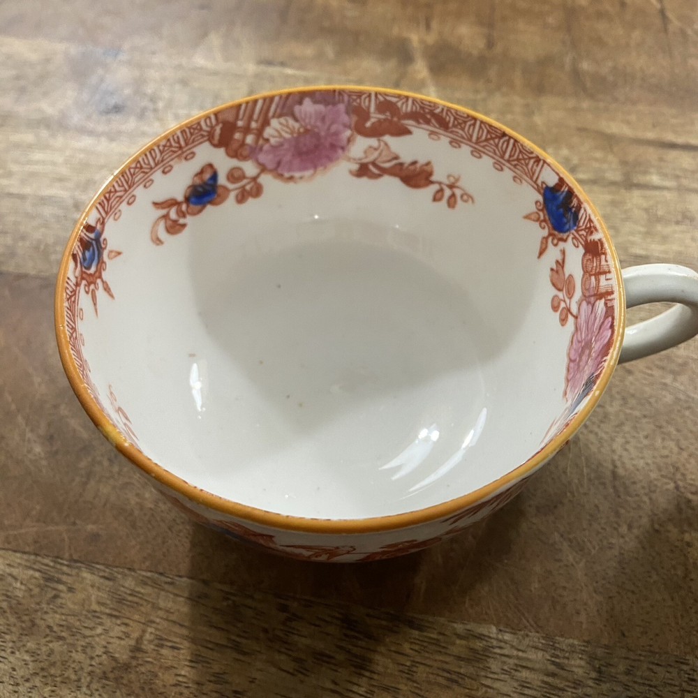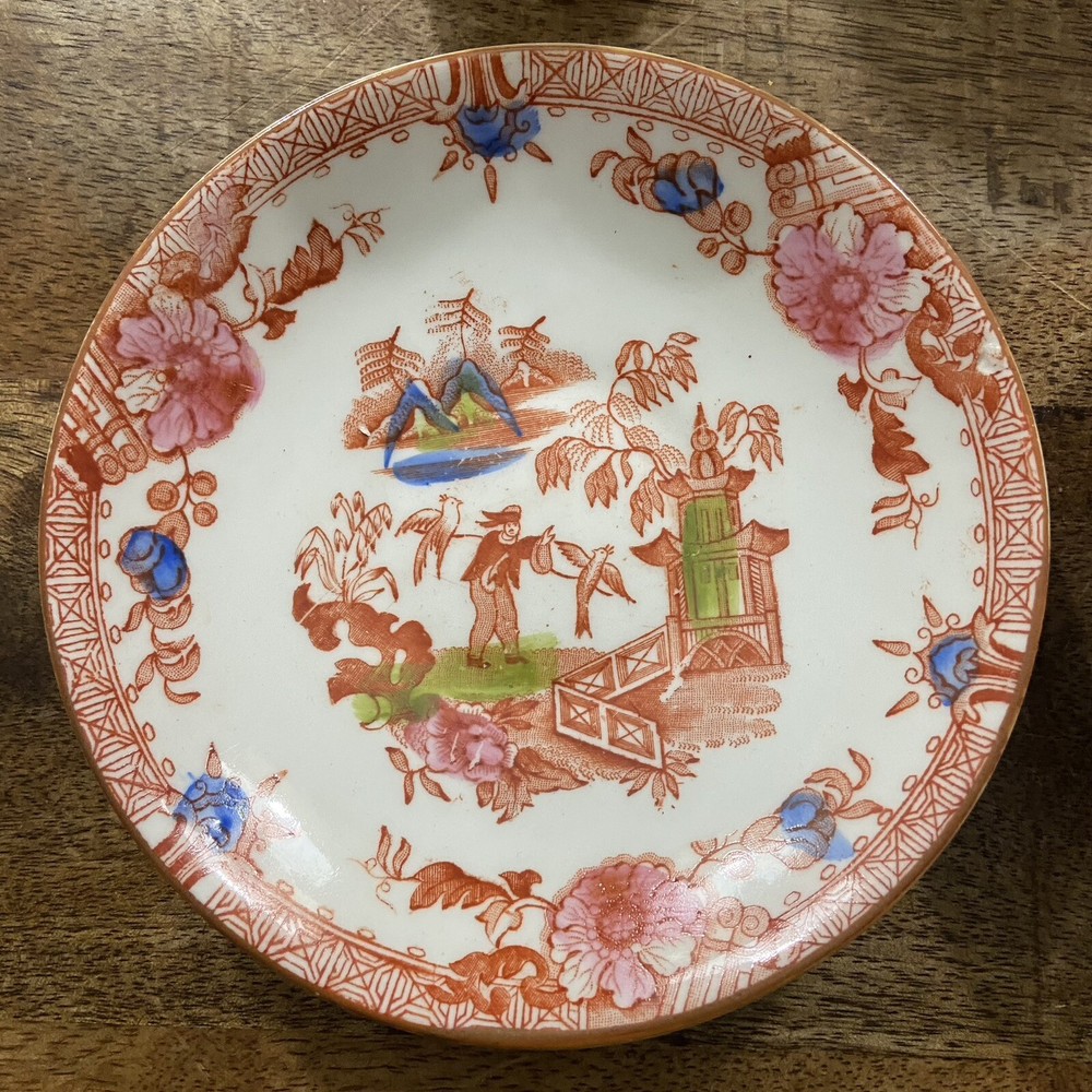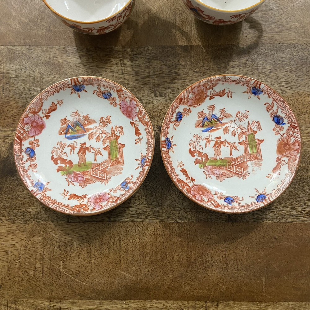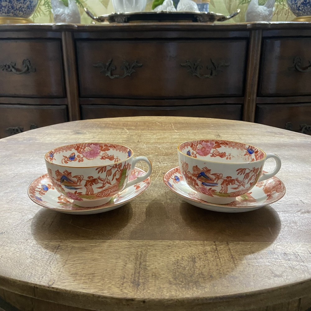 A lovely pair of oversized cups and saucers in a beautiful chinoiserie pagoda and fisherman pattern. Unsure of the pattern or manufacturer, I have seen various claims such as Williams & Sons and Gilditch & Sons. Believed to date to the middle of the 19th century (1840’s / 1850’s). All four pieces are in very nice condition without damage. Cup measures 4 3/8” across the top Saucers measure across 6 1/8” More similar pieces in my other listings