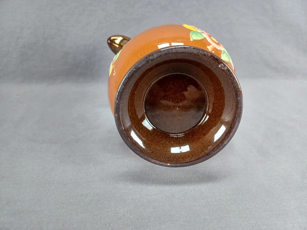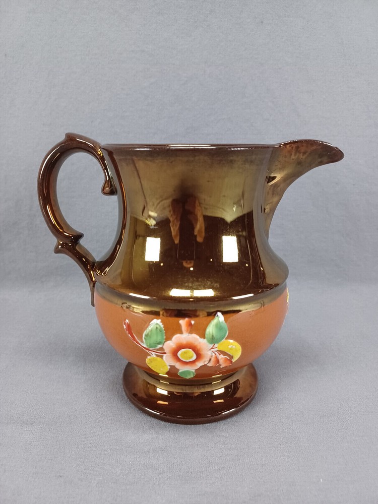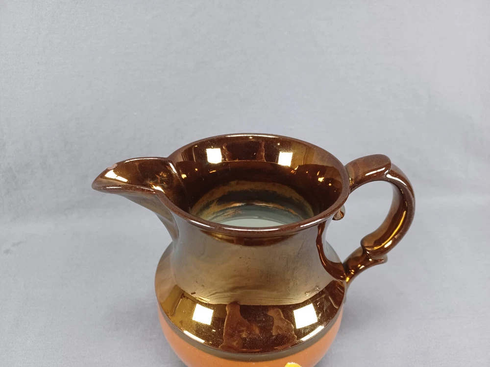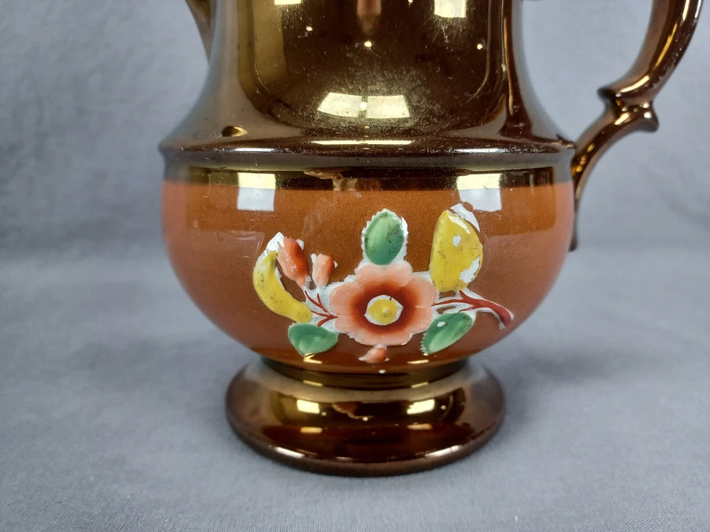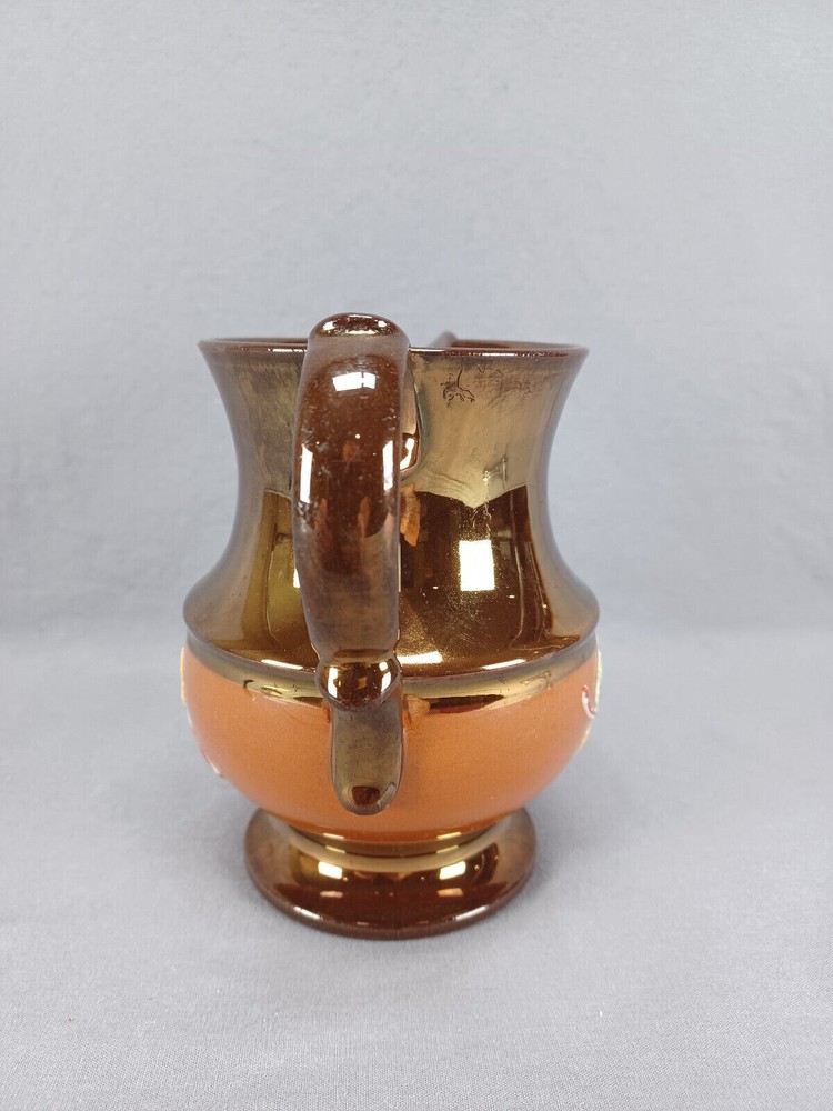 Mid 19th Century British Sprig Molded Flower Orange Band Copper Luster 6 " Jug Mid 19th century British copper luster pitcher. Has dark orange band around the bottom with a molded orange flower with yellow and green leaves. Unmarked. Has a chip to the spout, and a small bruise to the bottom of the handle, but otherwise good condition. Measures approximately 6 1/2 inches wide from spout to handle x 6 inches tall. This is an antique and may have small in manufacture defects that do not effect the display of the piece. GV ME