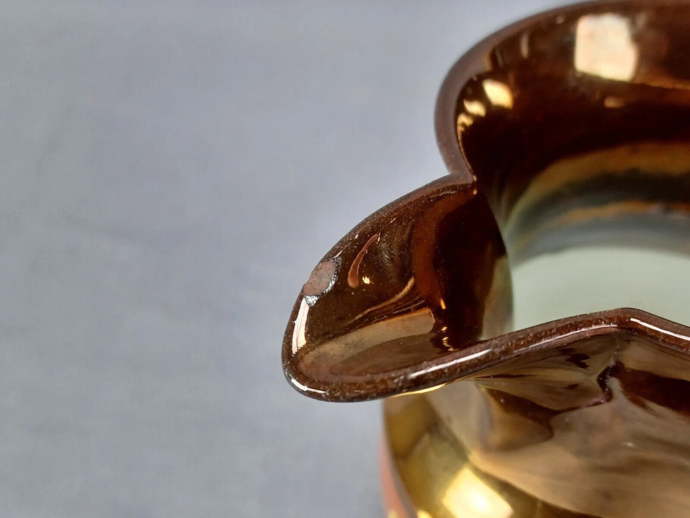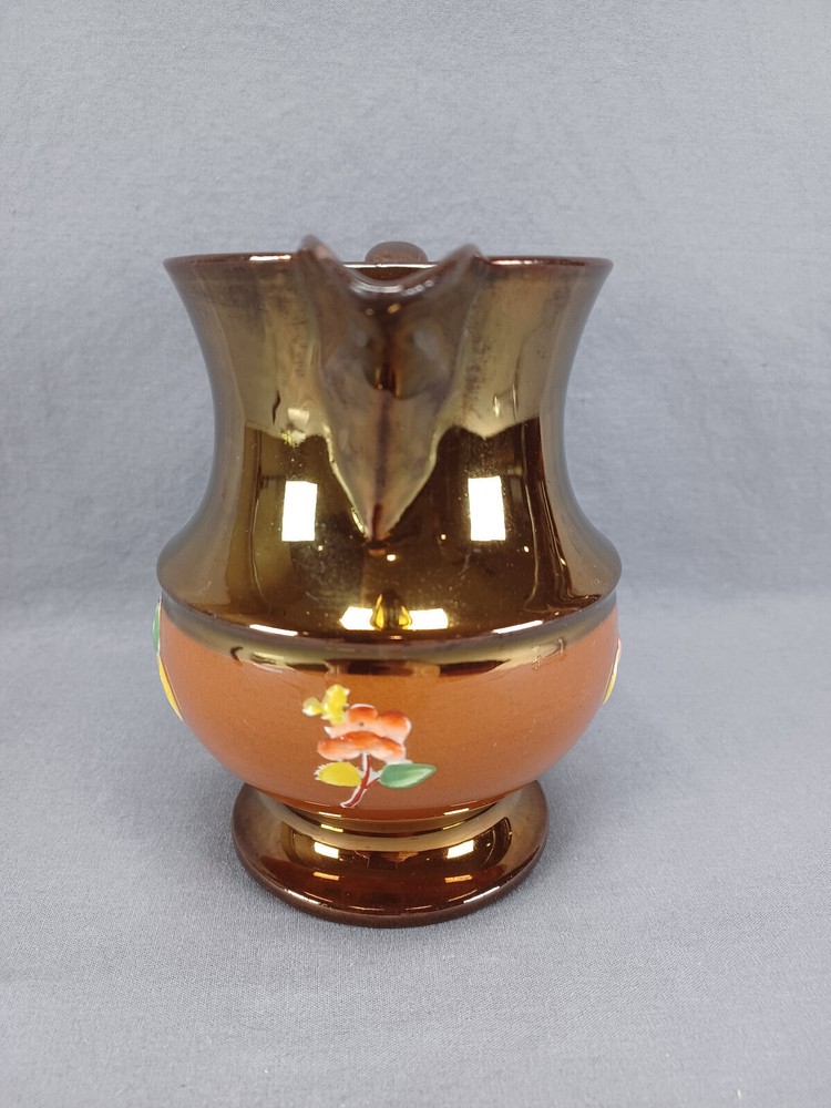 This charming antique jug is a lovely piece of history! The copper luster finish and vibrant orange floral detailing give it so much character. Though it has a few minor imperfections from age, they add to its authentic vintage charm. The size is perfect for display, and the craftsmanship is beautiful—definitely a unique find for any collector or decorator who appreciates antique elegance.