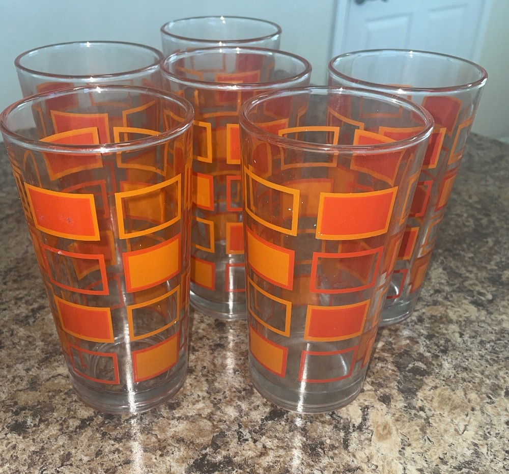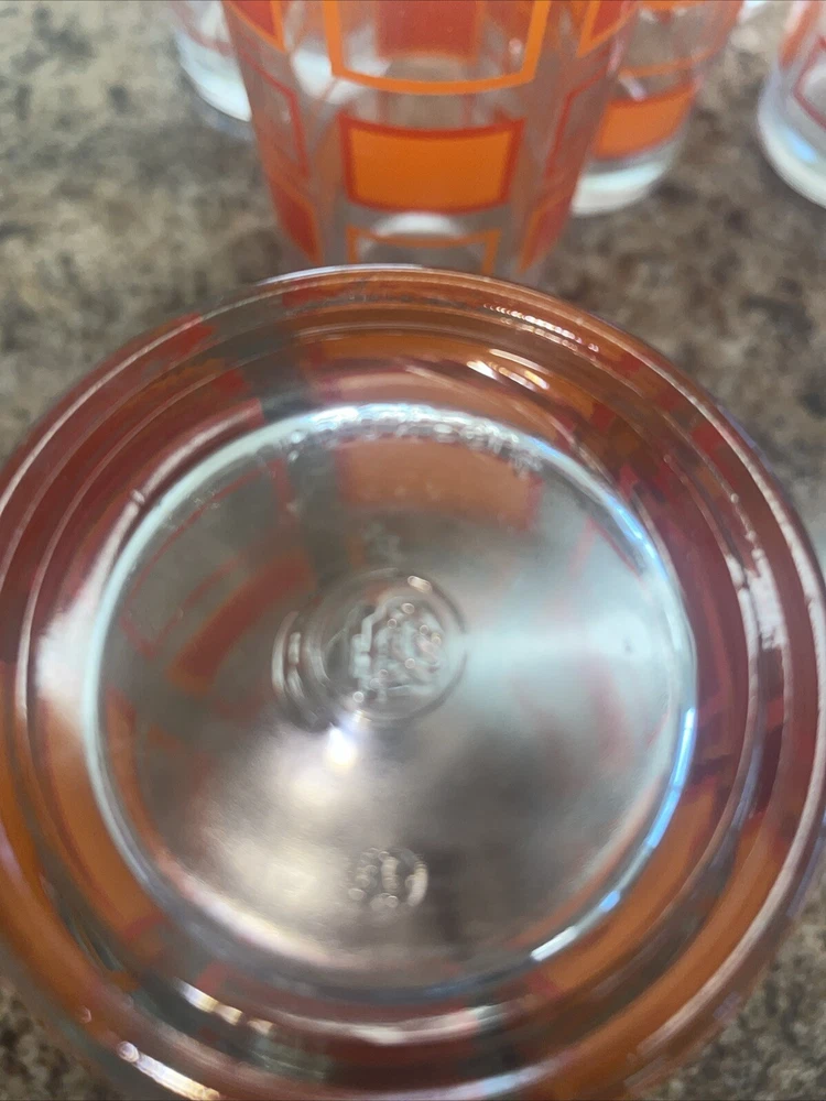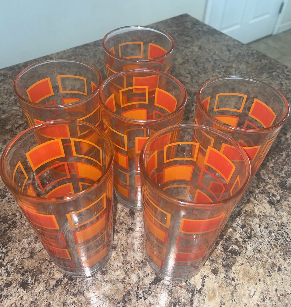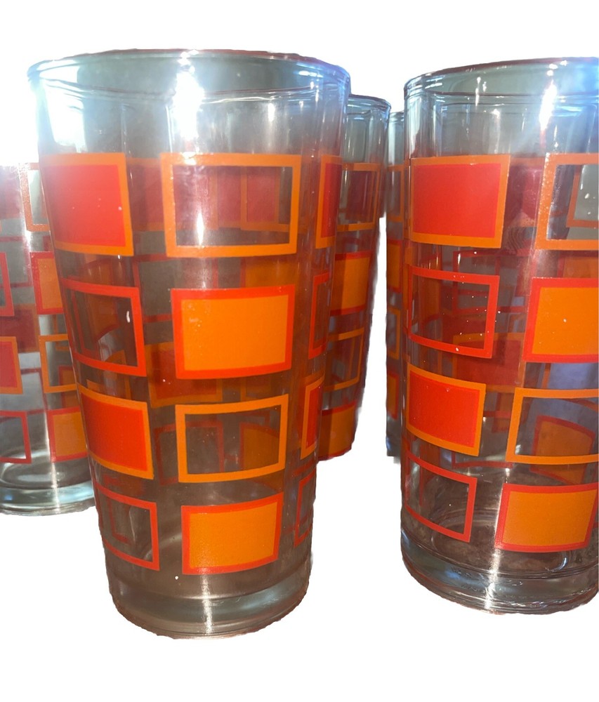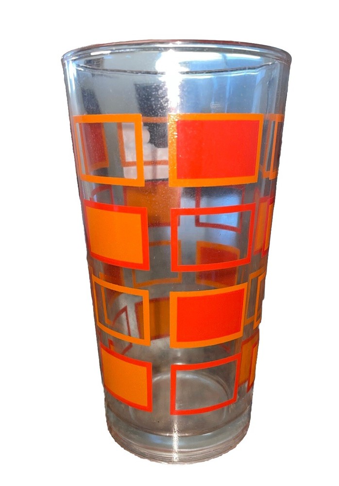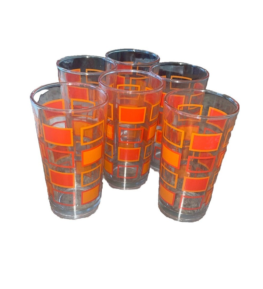 Add a pop of color to your barware collection with these Mid Century Tumbler glasses in a vibrant orange hue. The six-piece set features square-shaped glasses, perfect for all occasions. Crafted from high-quality glass, these tumblers are durable and stylish, adding a touch of Mid-Century Modern charm to any space. The pattern is an eye-catching square design, making them a unique addition to your drinkware collection. Ideal for both casual and formal occasions, these glasses are a must-have for any cocktail lover. The product line is Century, and they were manufactured in the 1960s, making them a rare find for collectors. Make a statement with these glasses and bring a touch of vintage charm to your home bar. I have 18 glasses selling in lots of 6. If you want all 18 I will do a better price