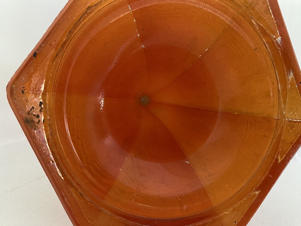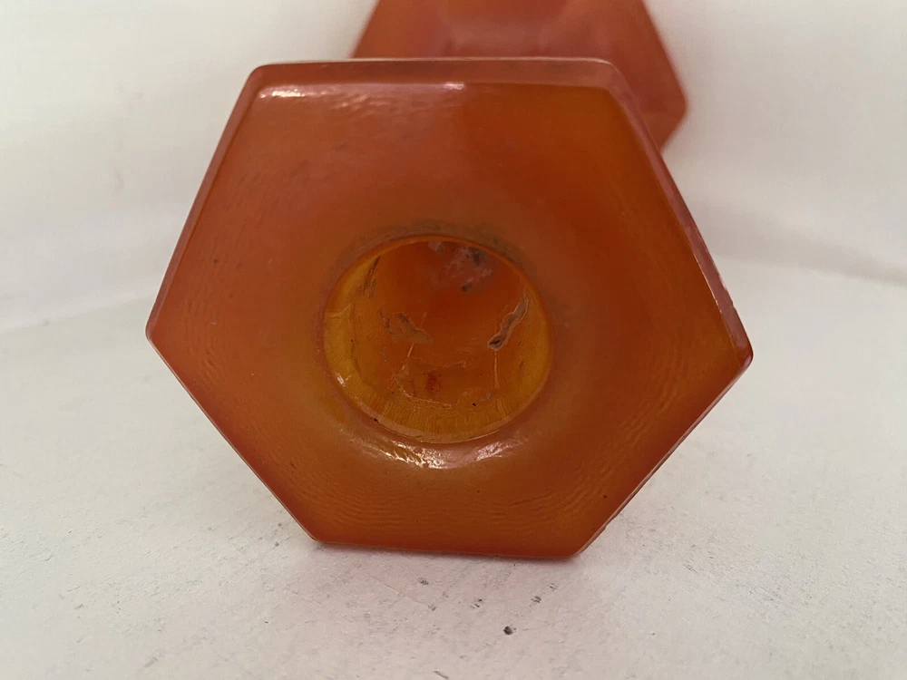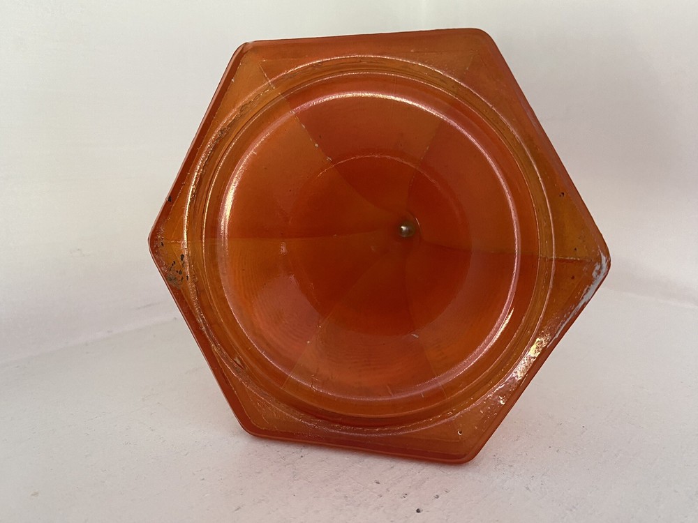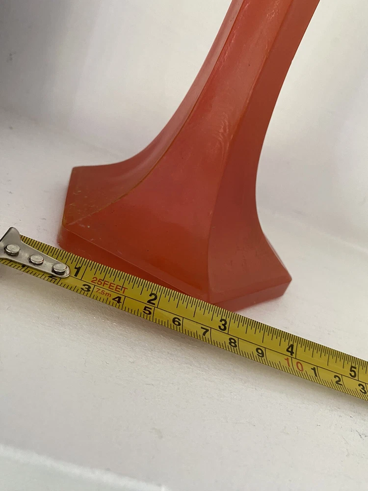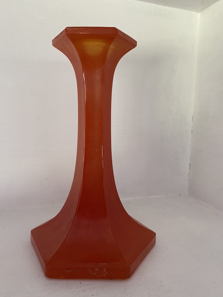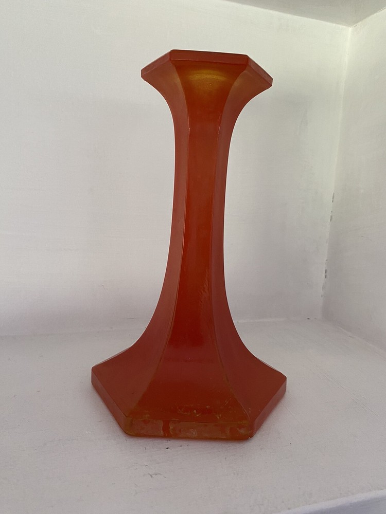 Imagine the possibilties for Halloween! Amazing MCM orange glass Candlestick as shown in photos. No labels. Measures approx. 7" to the top of the rim. Not sure of the origin since there are no labels. We see similar pieces listed as Czech - you decide. There are some small scratches in the glass and bubbles typical of this glass. Some paint splatter. Displays great. S elling as found at a local Es tate. No obvious breakage but some roughness on the glass here and there, corners. Please inspect the photos -- they tell the story. See photos. Send questions prior to purchase. Shipping by USPS or FedEx. Note: Happy to combine items to save on shipping. Will refund shipping overages.