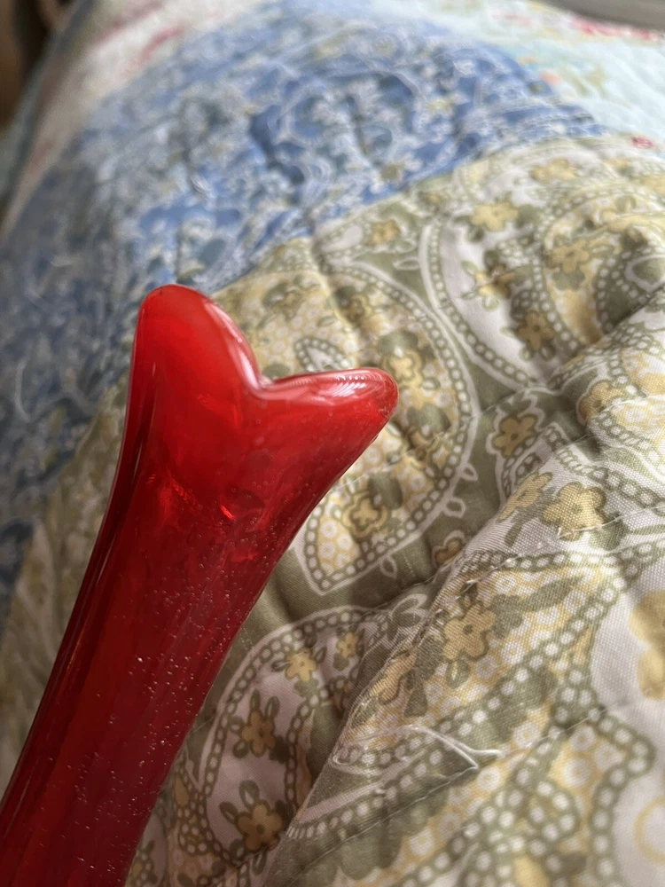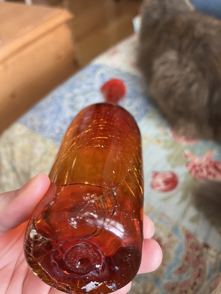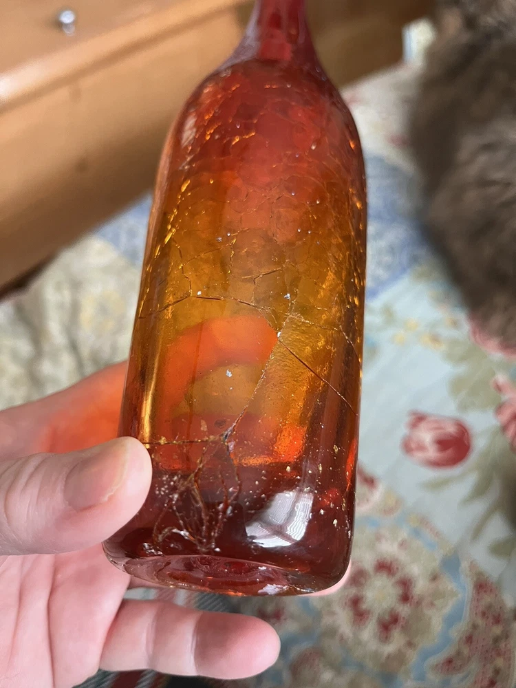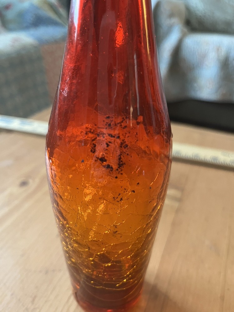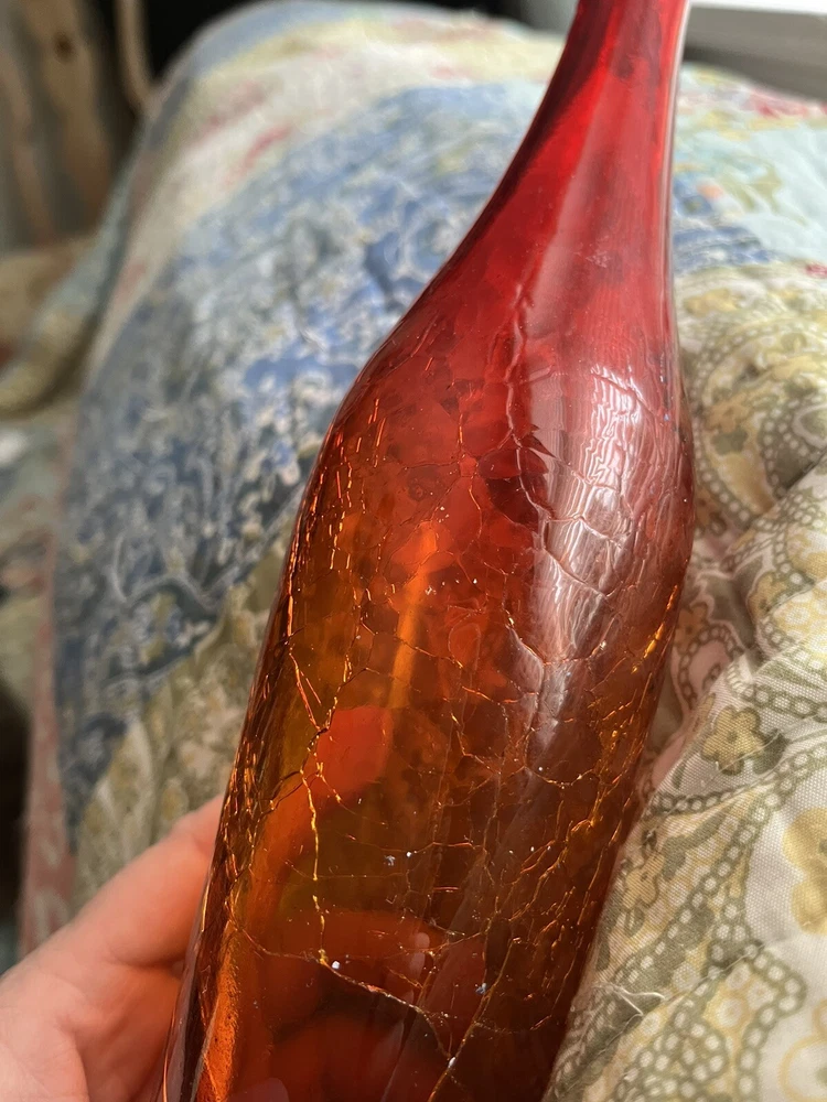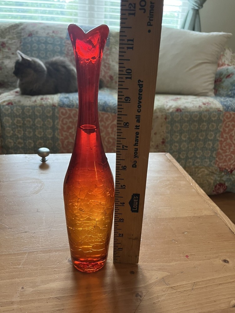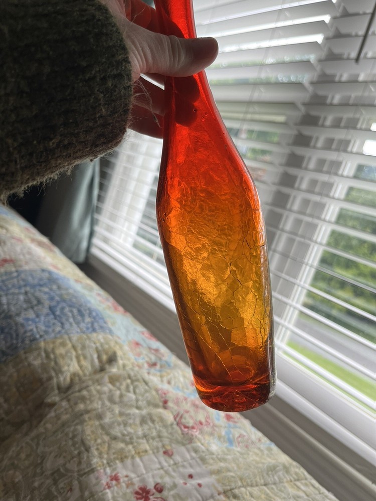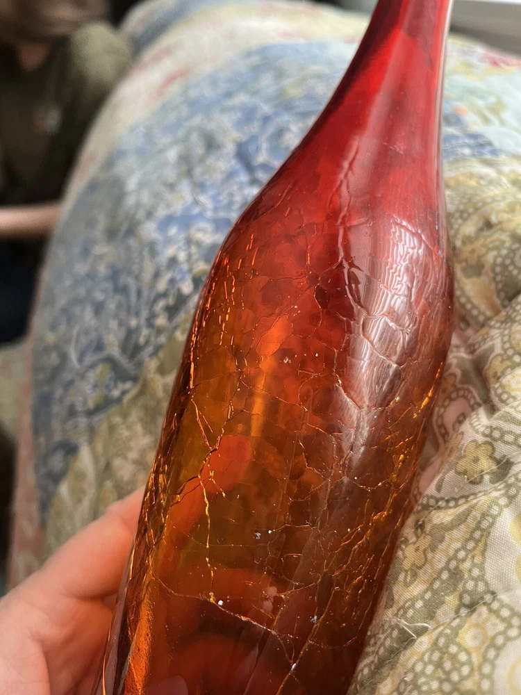 My husband picked this up and it's not my style...This looks just like another posted Mid Century AMBERINA Deep Tangerine CRACKLE Art Glass VASE. The other listing has a label " BLENKO" I do not know if this is a BLENKO...just looks exactly like it. Really pretty in the light...It's a rainy day here, and still you can see the pretty coloring shining through. I don't think this is a great piece for resale, but if you have a lovely window with nice pieces...this is definitely a lovely one to have. Look at pictures for details. You will need a baby bottle scrubber (unless I get one at the dollar tree!) to clean the inside of the vase. It does have skim chip on the rim (again as seen in the pictures above) AND the crackle at the bottom I can feel (which maybe that's the way it's supposed to be)...it holds water without leaking...so...consider carefully...since the top part you can't feel the crackle...but at the bottom you can.. See pictures...And this is priced accordingly. Thanks for looking!