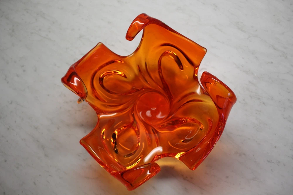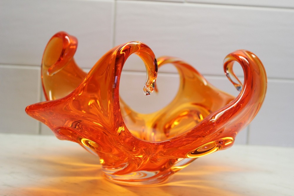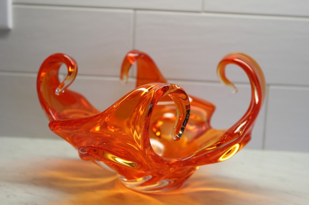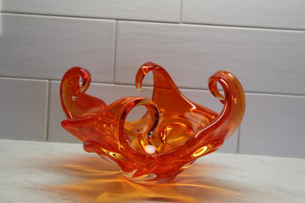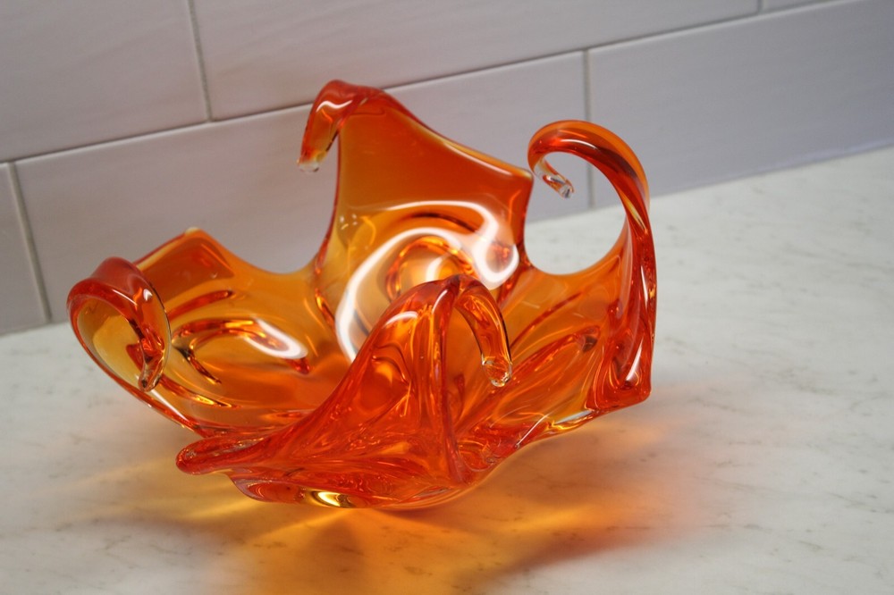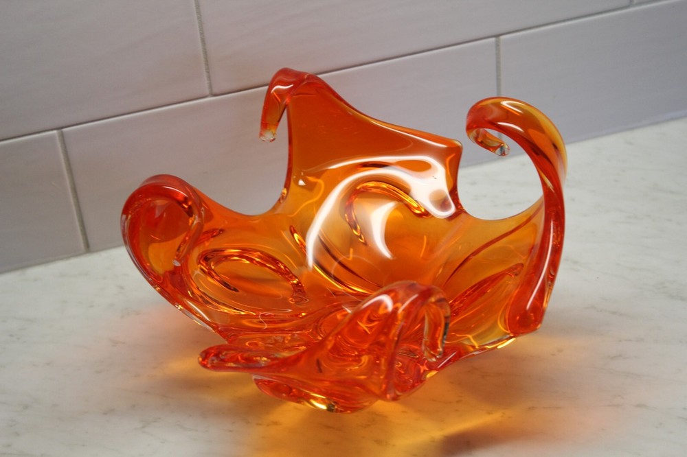 Mid Century Abstract Art Glass Bowl - Art Glass - Orange Bowl - 10 x 6 in tall...