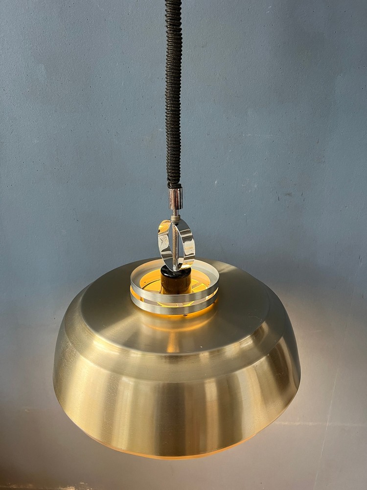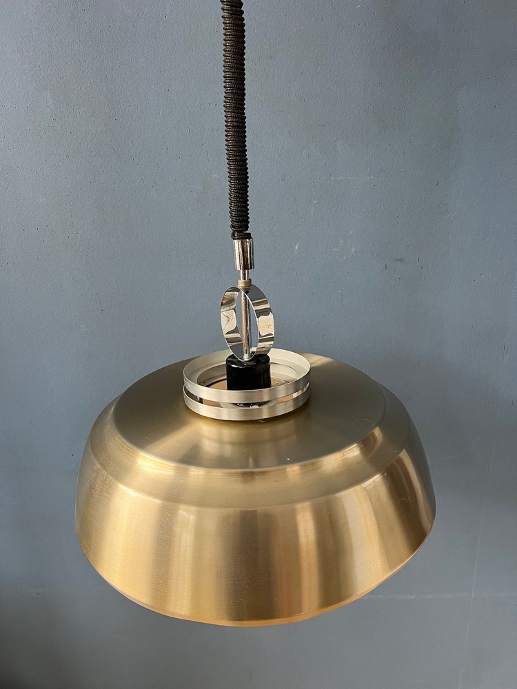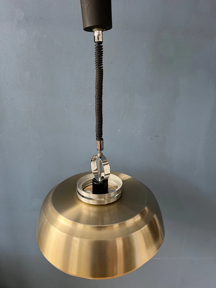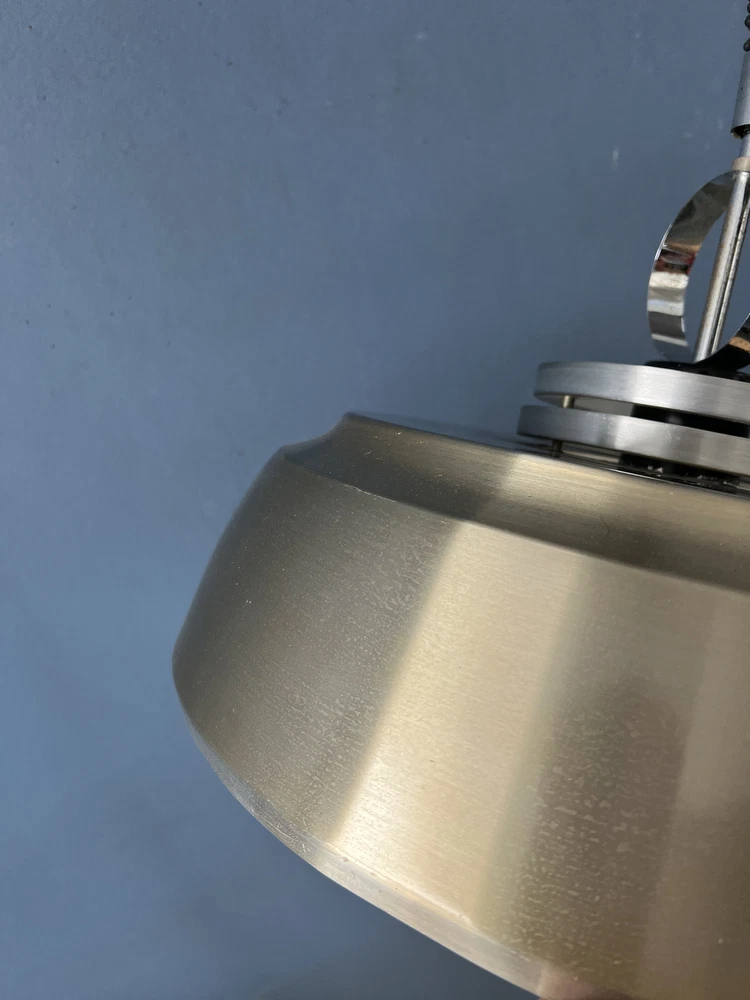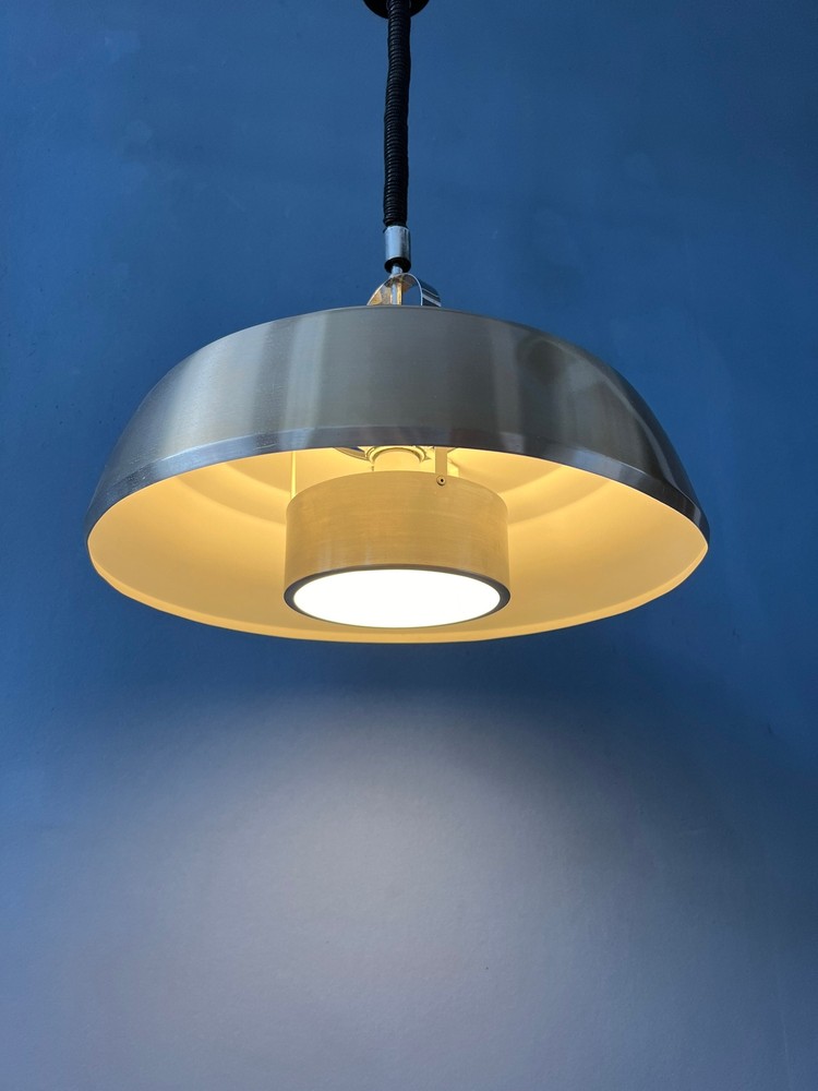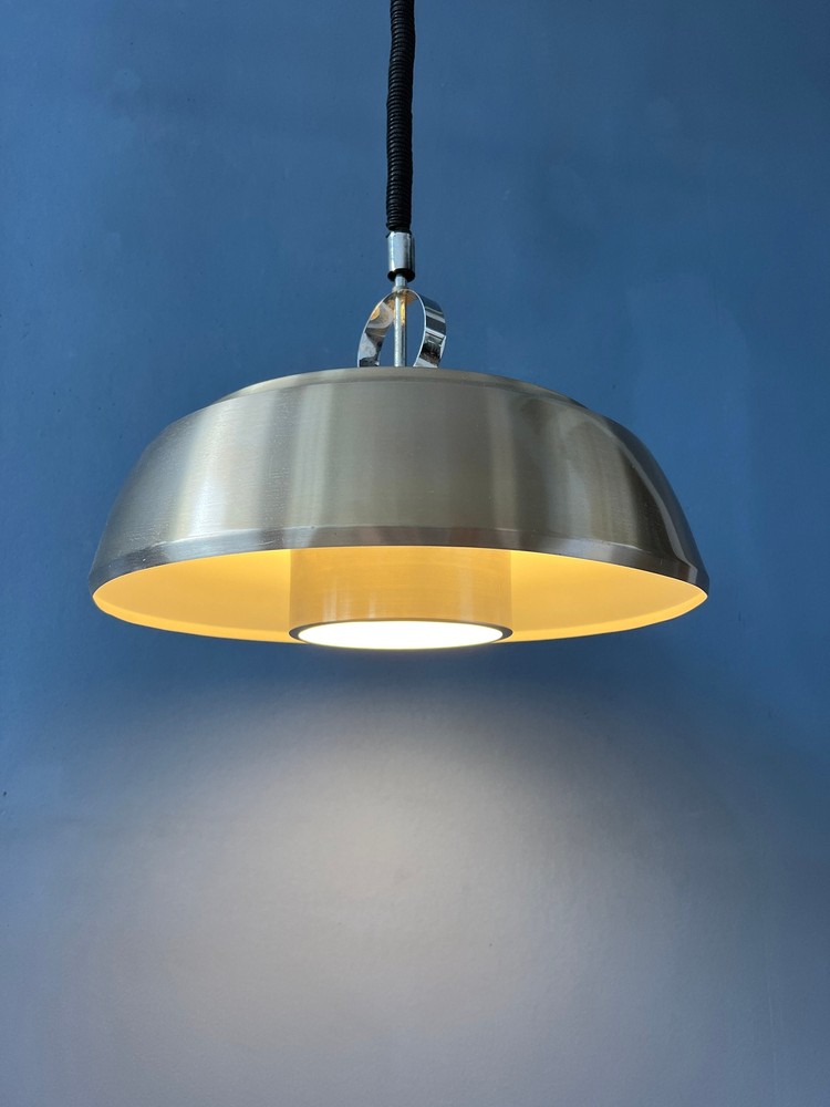 Shiny silver space age pendant lamp made from aluminium and chrome. The lamp has a simple but elegant design. The light projects nicely through the inner shade. The lamp requires one E27/26 (standard) lightbulb. [Condition] Good. The lamp is still looking great, it has only very minor user-wear. [Dimensions] ø Shade: 34 cm Height Shade: 25 cm [Shipping] All our products are shipped with track & trace and have full insurance.