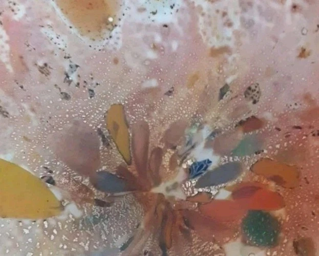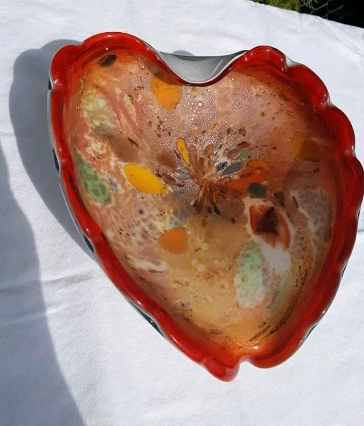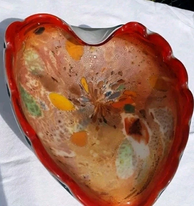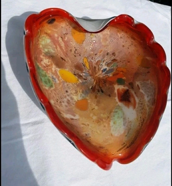 Mid Century Art Glass Fratelli Toso Heart Shaped Dish Orange Flame Teal Silver Metallic A colorful eye catching sparkling piece of Mid Century Murano Art Glass by Fratelli Toso. This gorheous heart shaped dish has a vinbrant reddish orange flame color with a white cased glass outer body. The inside of the dish has metallic silver flecks that highlight brilliant colors of aqua, teal, yellow, pink and plum. Stunning Glass Art Piece. No chips, cracks or flakes Beautiful gift for the collector in your life or to treat yourself to add to your own Collection and surround yourself with beautiful pieces. No smells Smoke free Pet free Hypoallergenic home Weight 3.5 lbs Measures approximately 9.25" x 8 " x 3" at tallest point Will be packaged with care to ensure safe arrival (F)