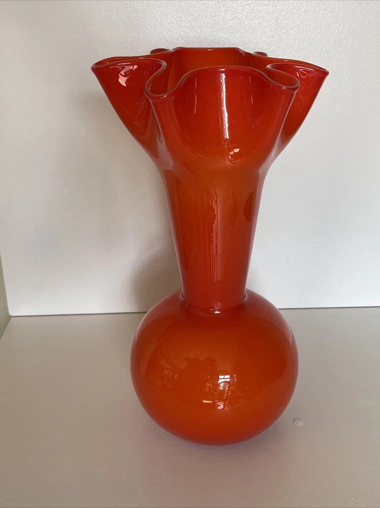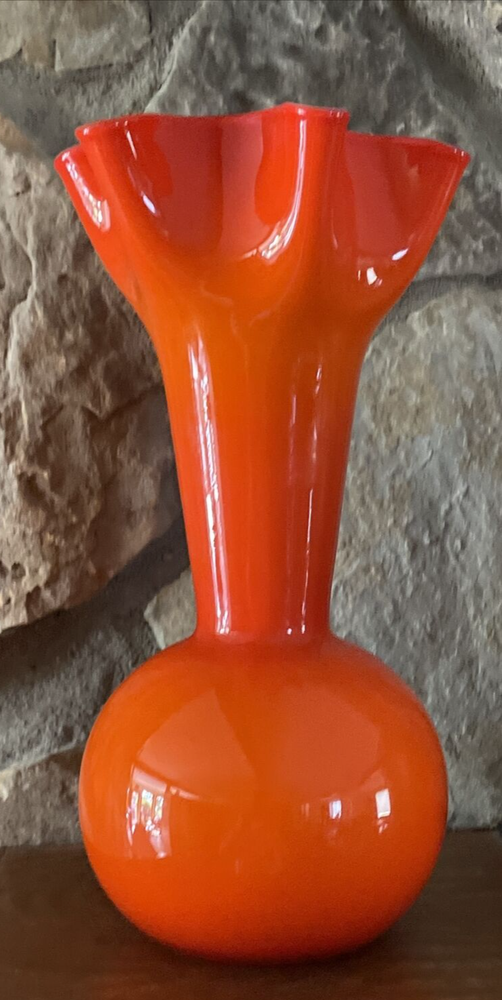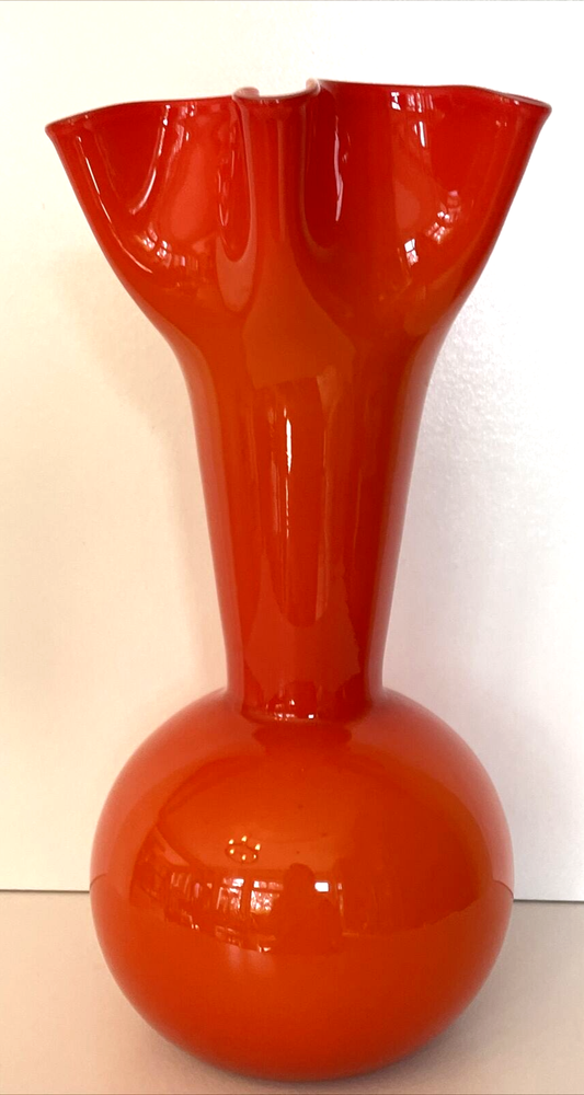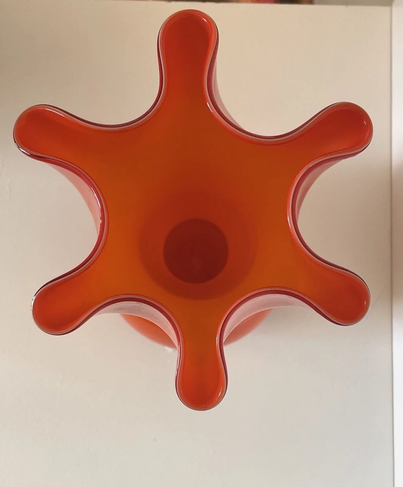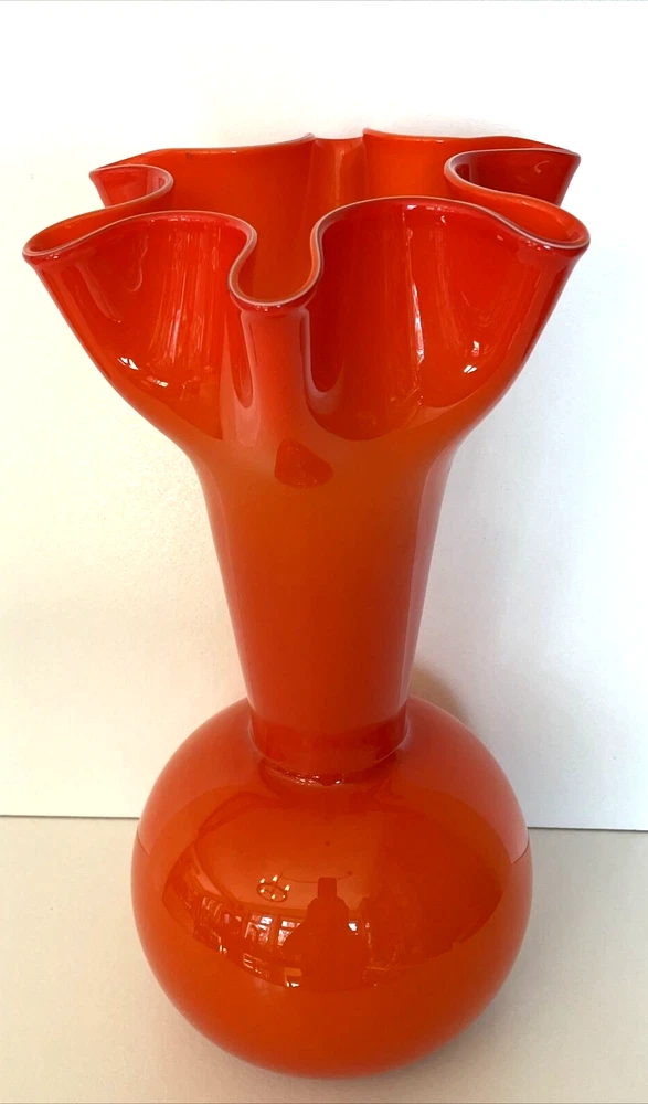MidCentury Ruffled Top Orange Clear White Crested 12" Art Glass Vase Your flowers are asking for this beautiful vase! This vase is a unique one of a kind piece of art glass MCM This is what you need to bring some joy into to your home - a bright happy vase. Vintage Art Glass Vase. The vase is made of fine blown glass. This vase is a bright orange in different hues.
