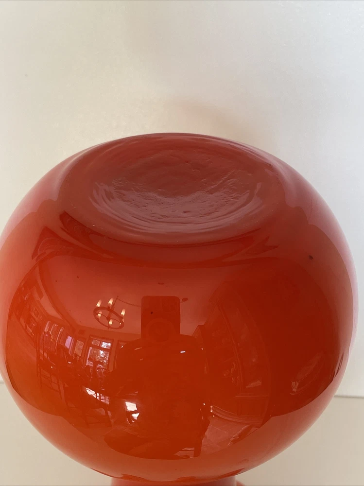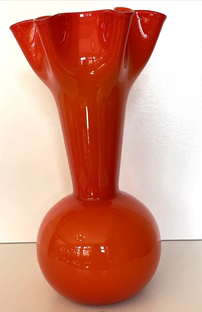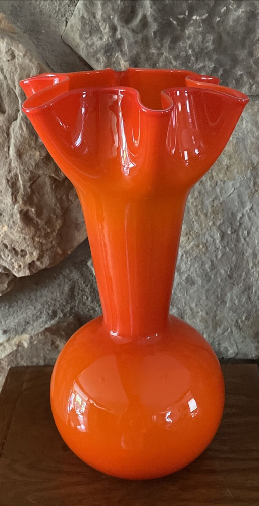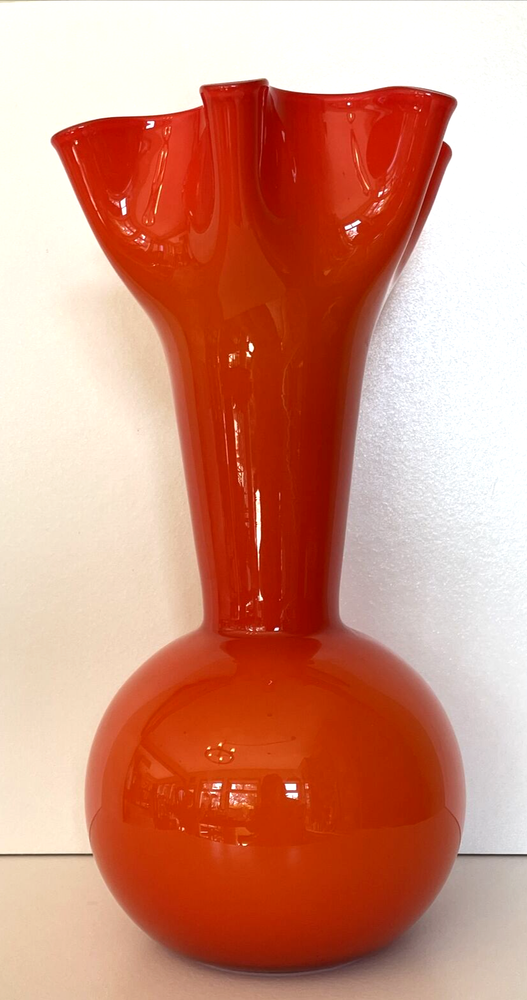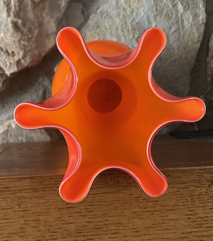 MidCentury Ruffled Top Orange Clear White Crested 12" Art Glass Vase Your flowers are asking for this beautiful vase! This vase is a unique one of a kind piece of art glass MCM This is what you need to bring some joy into to your home - a bright happy vase. Vintage Art Glass Vase. The vase is made of fine blown glass. This vase is a bright orange in different hues.