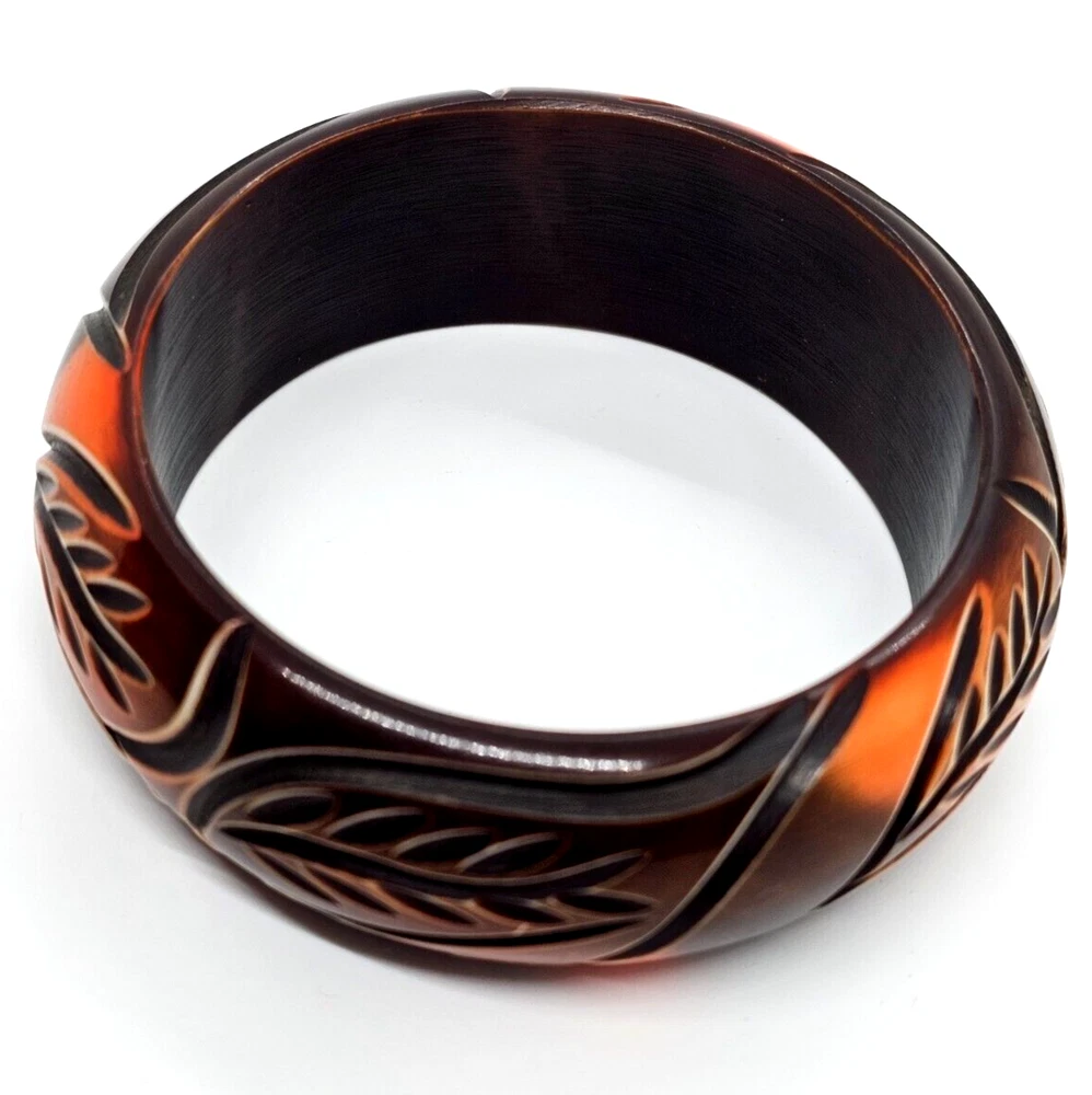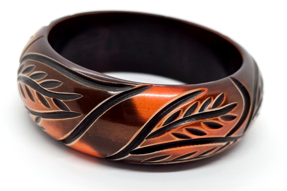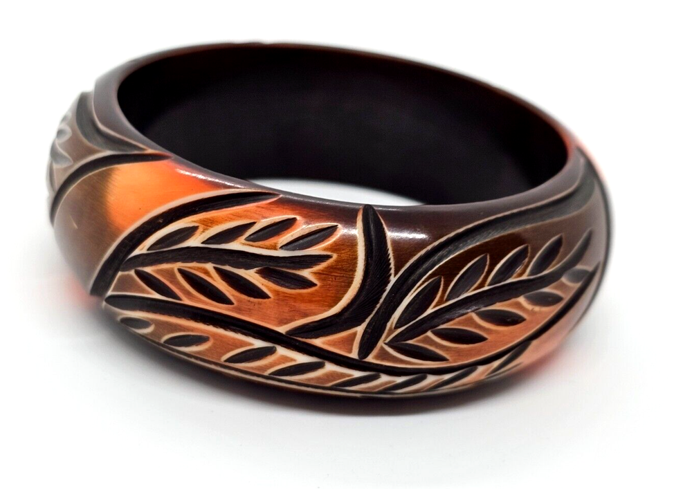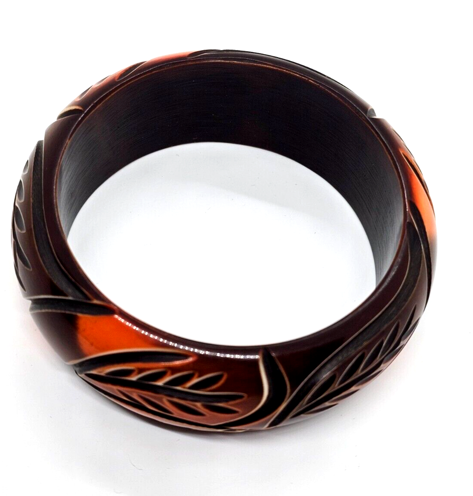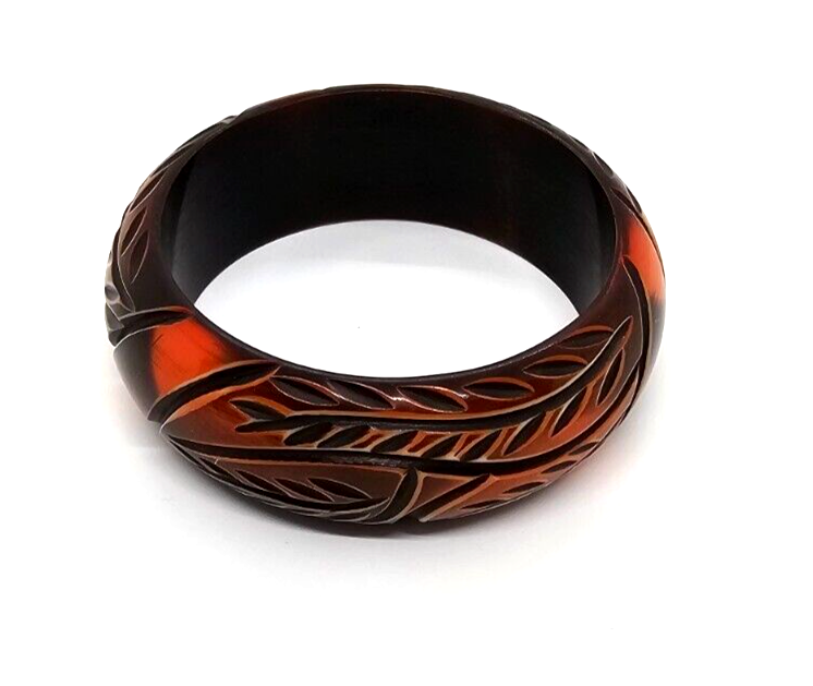 For your consideration is this cool mid century deeply carved burnt orange 1" wide Bakelite bangle bracelet. I love the leaf carving on this piece and the colors are amazing! This piece has been simichrome tested. These are in lovely condition and I will include a gift box. Thank you for taking the time to look at my auctions. I will always try my very best to give accurate information on all of the pieces I list. Please feel free to inquire about anything you feel might help you in understanding any items or my auction policies. I add new every items every week and there are always new treasures to see. Shipping Policies: I will ship all items within 1-2 business days of received and cleared payment. I provide tracking so you will able to see when your treasures arrive! I do not ship outside of the continental United States unless previous arrangements are made. If so, I will only ship via Ebay's global shipping program and the buyer assumes all costs for shipping plus any customs or import fees. I do offer combined shipping. I will send an invoice after the auctions are complete with a total and combined shipping. Any item or combination of items totaling more than $50.00 will require a signature upon arrival. This is for your protection as well as mine. Please read the auction carefully. I do my very best to describe each item with detail and show pictures that should meet your needs for viewing. If there are any defects, they will be noted. These auctions are “as is” so again, I ask that you please read the description and look at the pictures. I have had to do this because some do not understand that the majority of these items are estate pieces and pre-owned. If an item is “vintage” or “antique” it is at least 20 years old or more. Pre-owned items will have wear. This includes nicks, scratches, and sometimes worn vermeil. I always insure that each item is in the best of shape for their age. If an item is in mint condition, it will be clearly stated in the auction. Otherwise there may be signs of wear including the above mentioned. I buy and sell vintage, estate, and new jewelry. I take pride in what I offer on Ebay and research each and every piece that I place on auction . I will verify it's authenticity. If I cannot, it will be stated in the auction. I am always happy to help you find the right piece of jewelry to suit your needs. Most of the pieces that I offer are suitable for gift giving and I include a gift box on many items. You can bid with confidence! I take the greatest care in packaging and shipping all of my items. Each piece is bubble wrapped for security. I only accept Pay Pal and payment is due within 3 days of the auctions close. Thank you and happy bidding!