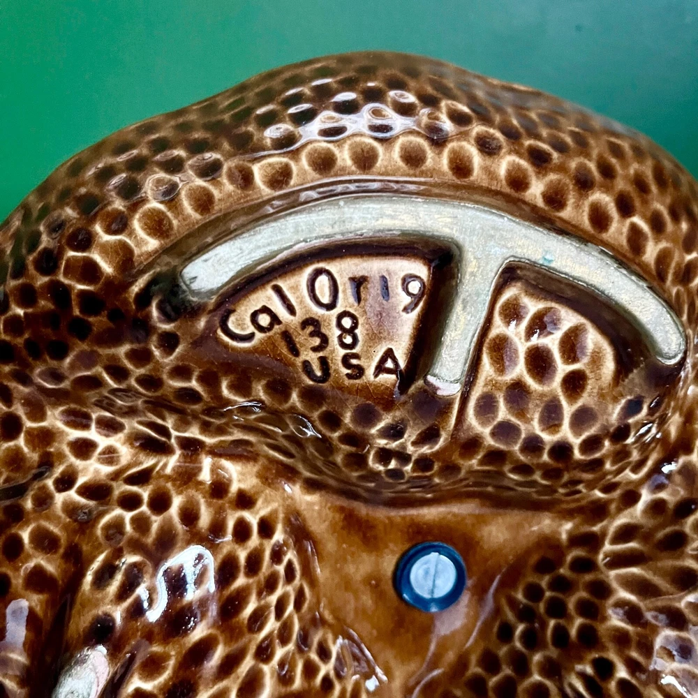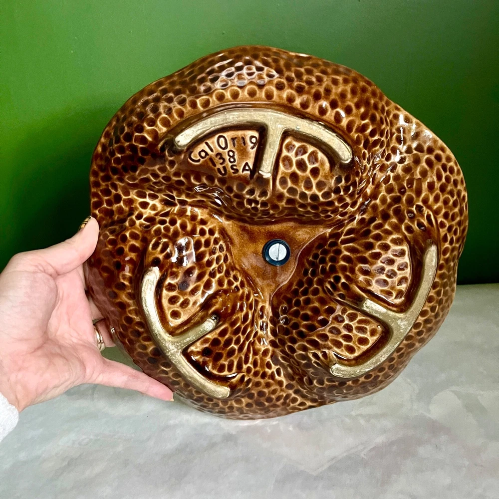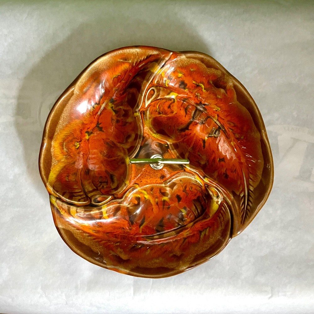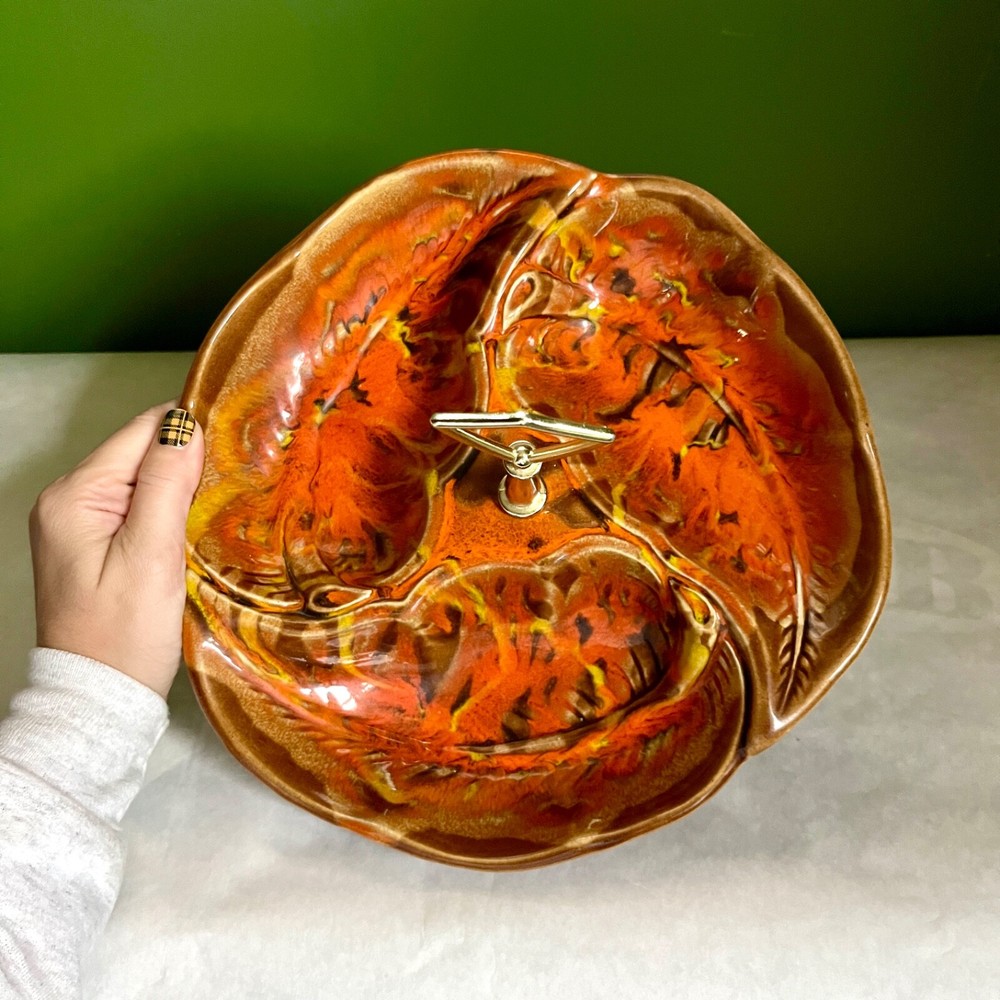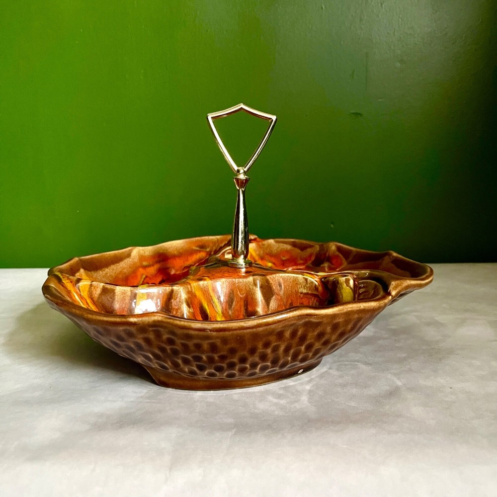 Fabulous mid century nut dish with splatter glaze in oranges, yellows, black and browns. This style of California pottery was popular in the 60s and 70s. Excellent vintage condition - no chips or cracks. Measures roughly 11 inches in diameter and stand 4.5 inches tall including the handle.