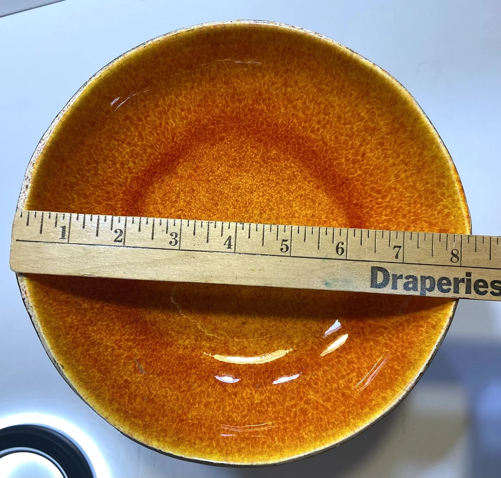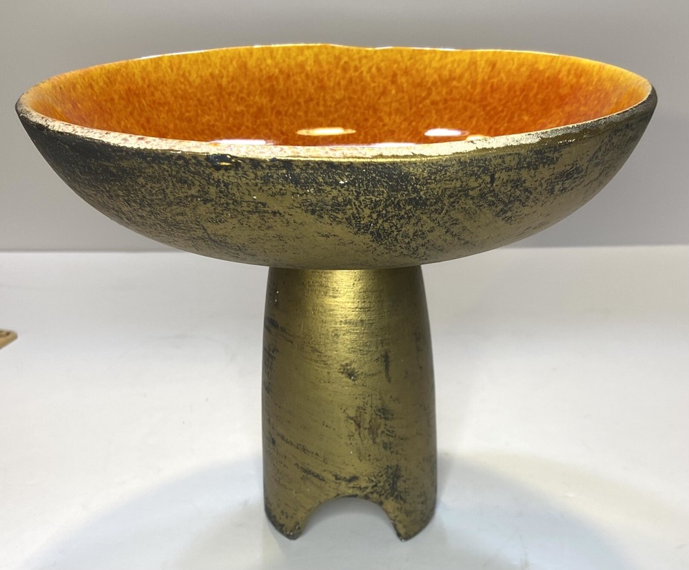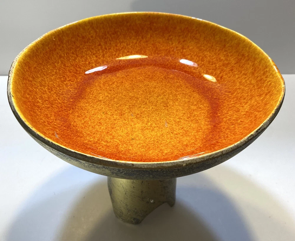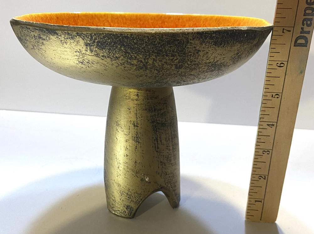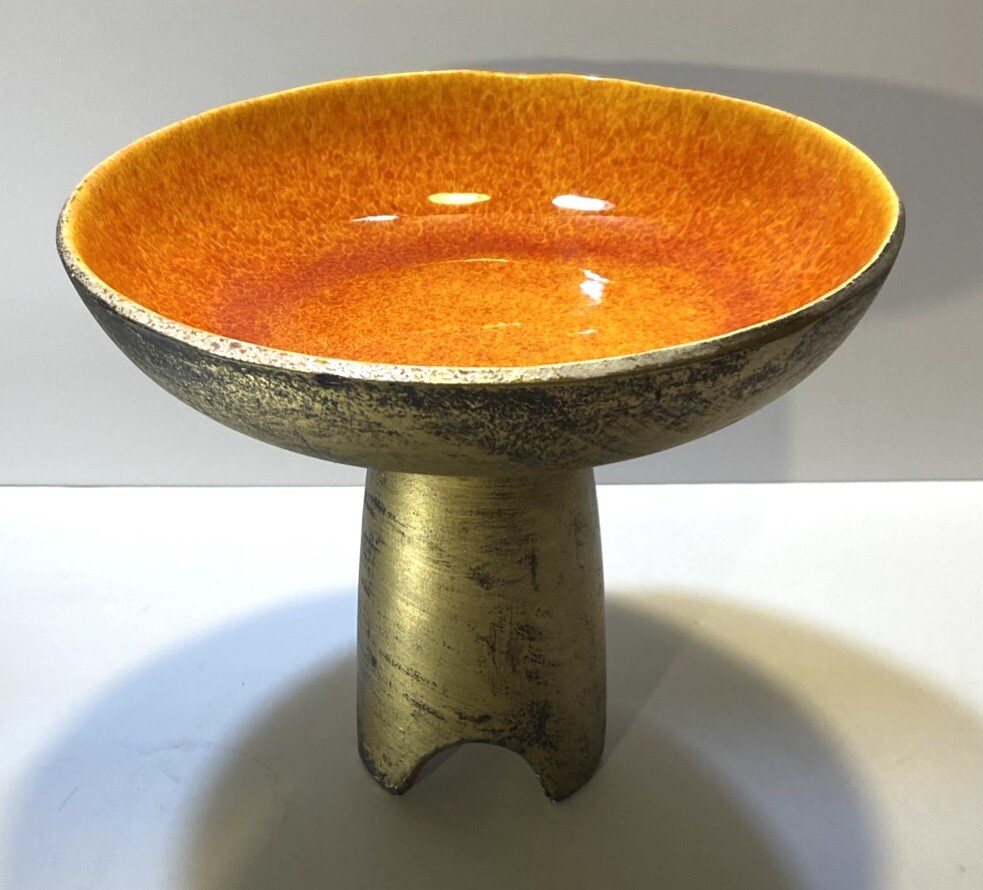 This Mid Century Ceramic Pedestal Tray is a versatile piece that can be used as a display dish or candle holder. The vibrant orange glaze adds a pop of color to any space, while the gold and black accents give it a stylish Mid-Century Modern look. Measuring 7 inches by 8 inches, this original ceramic piece is both decorative and functional, perfect for adding a touch of retro charm to your home decor. Please note there is some slight wear on the gold color. Also a chip on the edge that has been covered with black. Please look at photos for details. EB66