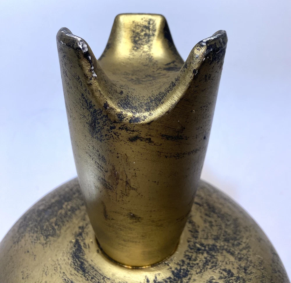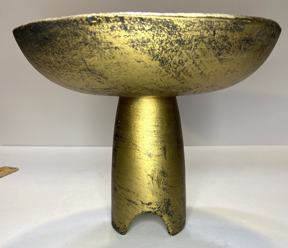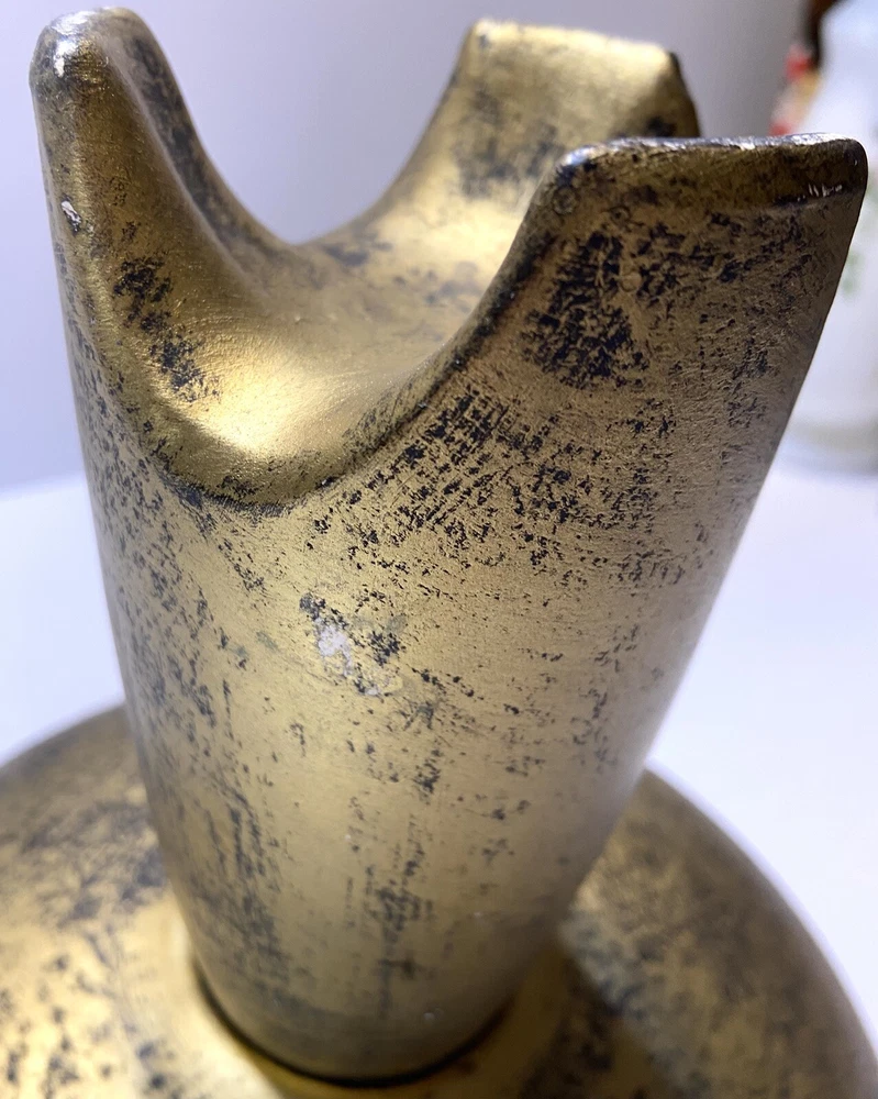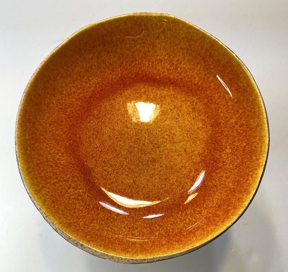 This Mid Century Ceramic Pedestal Tray is a versatile piece that can be used as a display dish or candle holder. The vibrant orange glaze adds a pop of color to any space, while the gold and black accents give it a stylish Mid-Century Modern look. Measuring 7 inches by 8 inches, this original ceramic piece is both decorative and functional, perfect for adding a touch of retro charm to your home decor. Please note there is some slight wear on the gold color. Also a chip on the edge that has been covered with black. Please look at photos for details. EB66