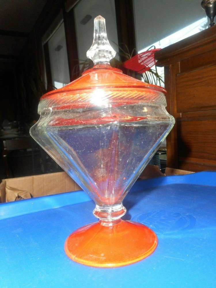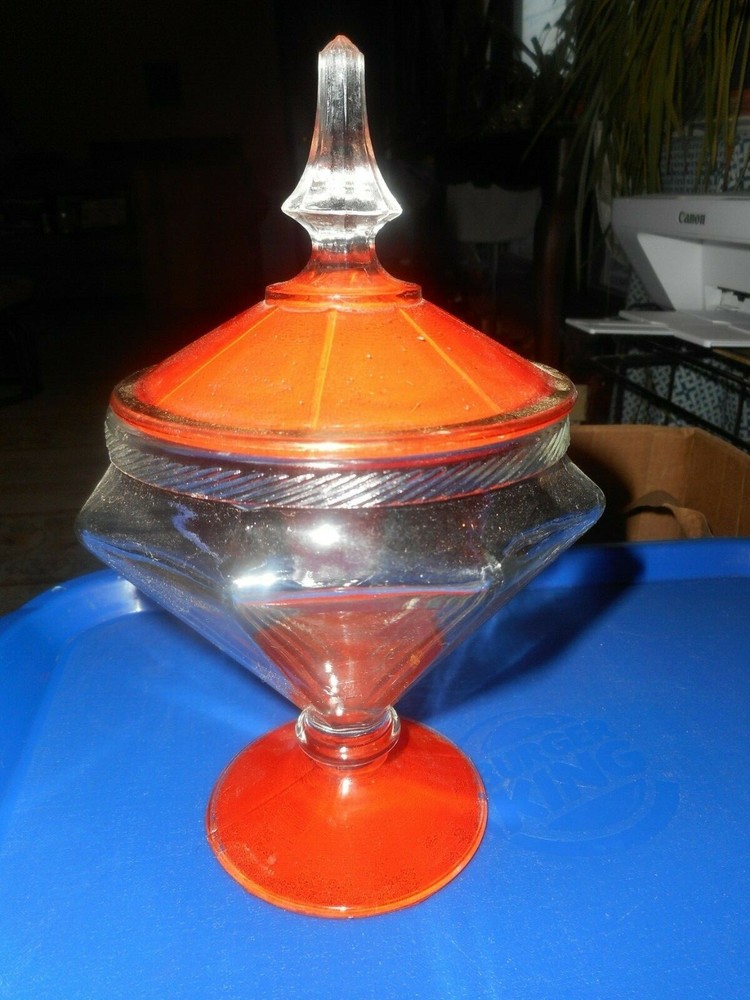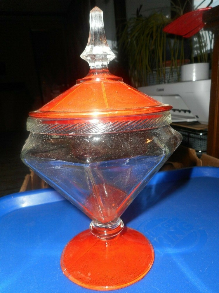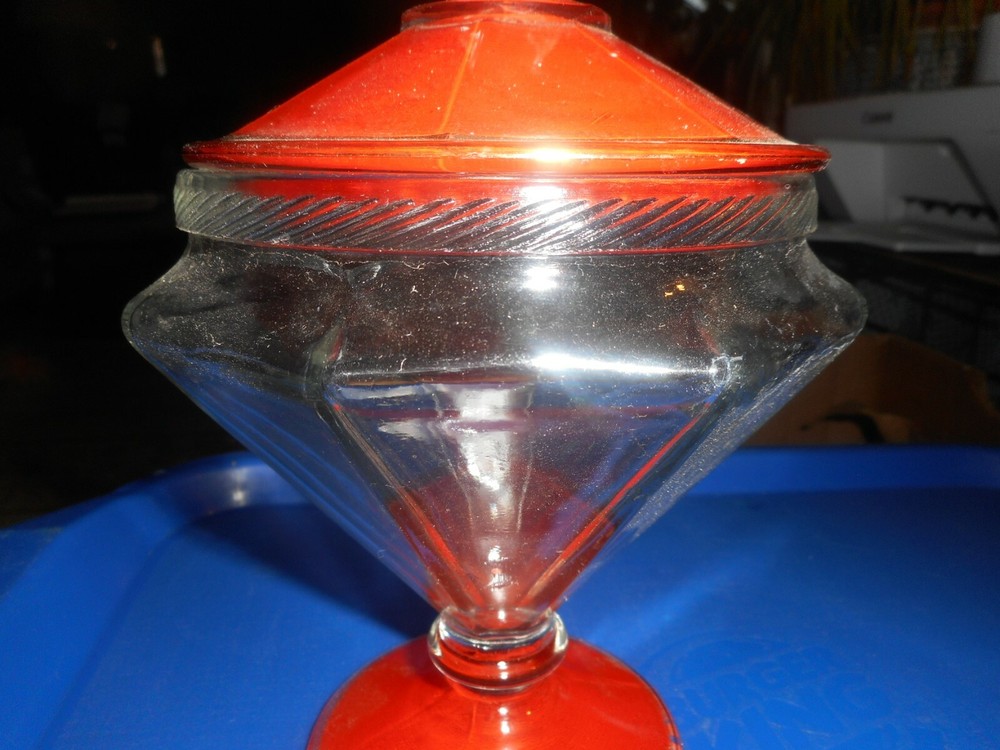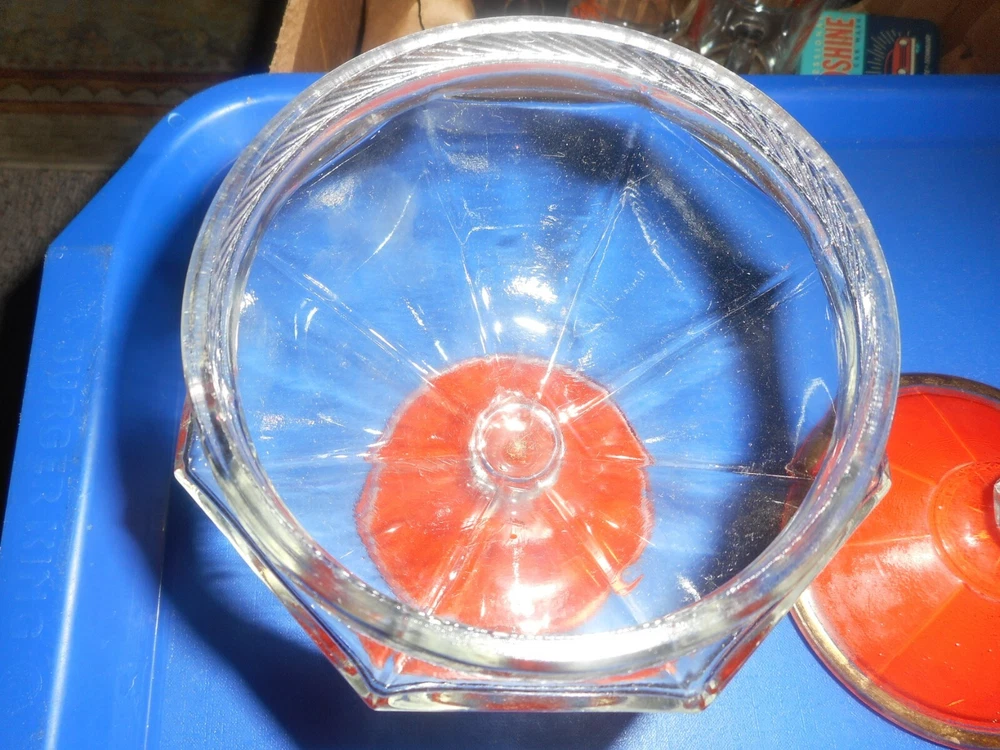 Vintage 1960's Mid Century Modern Clear Glass Candy Dish / Jar with Retro Orange Glass Lid and Base. Gold Trim Around Lid Edge. I believe this to be Heisey Approximately 9 inches high - Inner part of dish is approximately 4.5 inches across. The dish is in great shape. There are no nicks in the glass. The lid and the base of the jar are painted orange enamel. There is gold trim around the lid that is slightly worn off.
