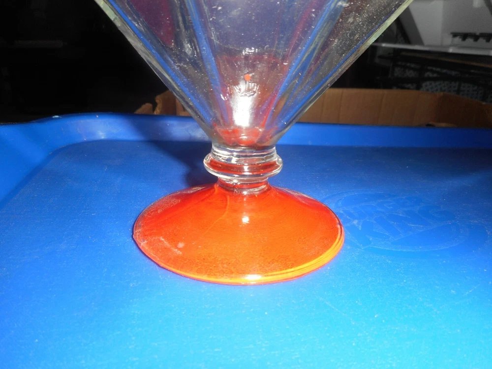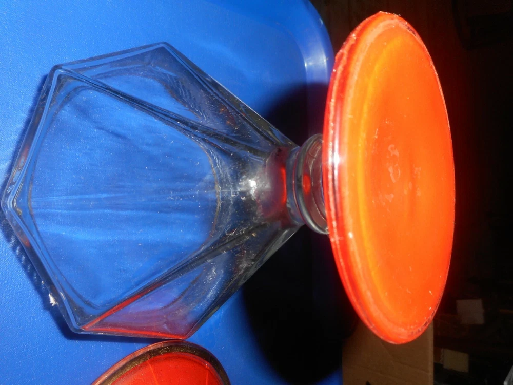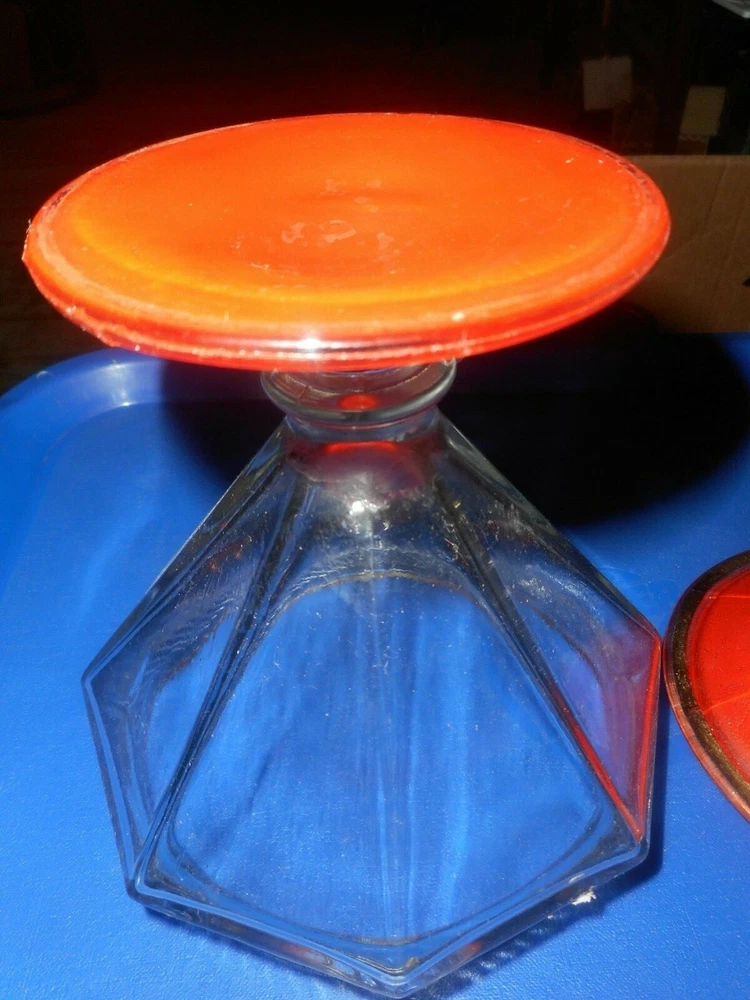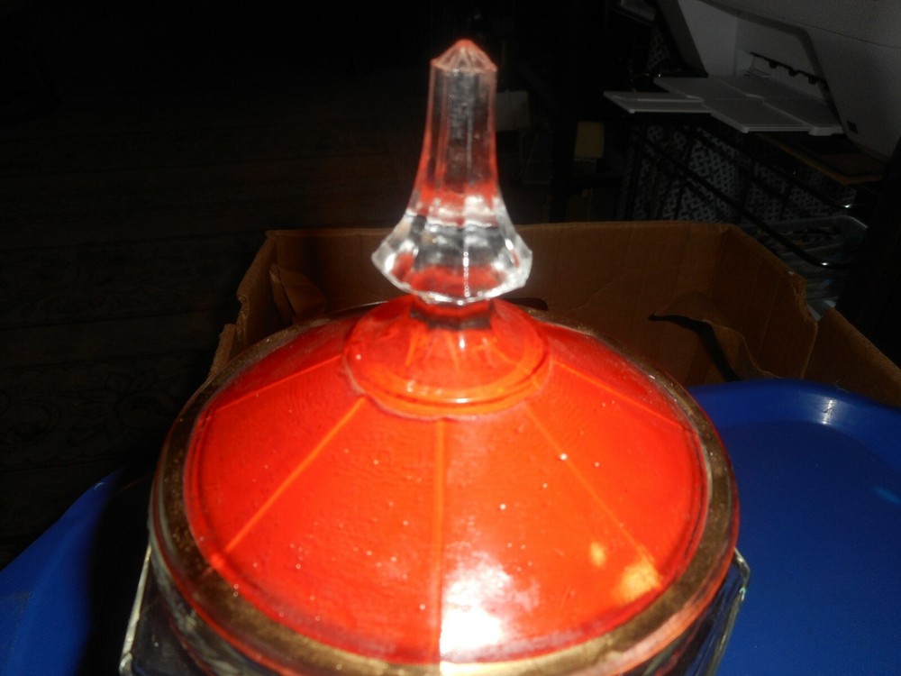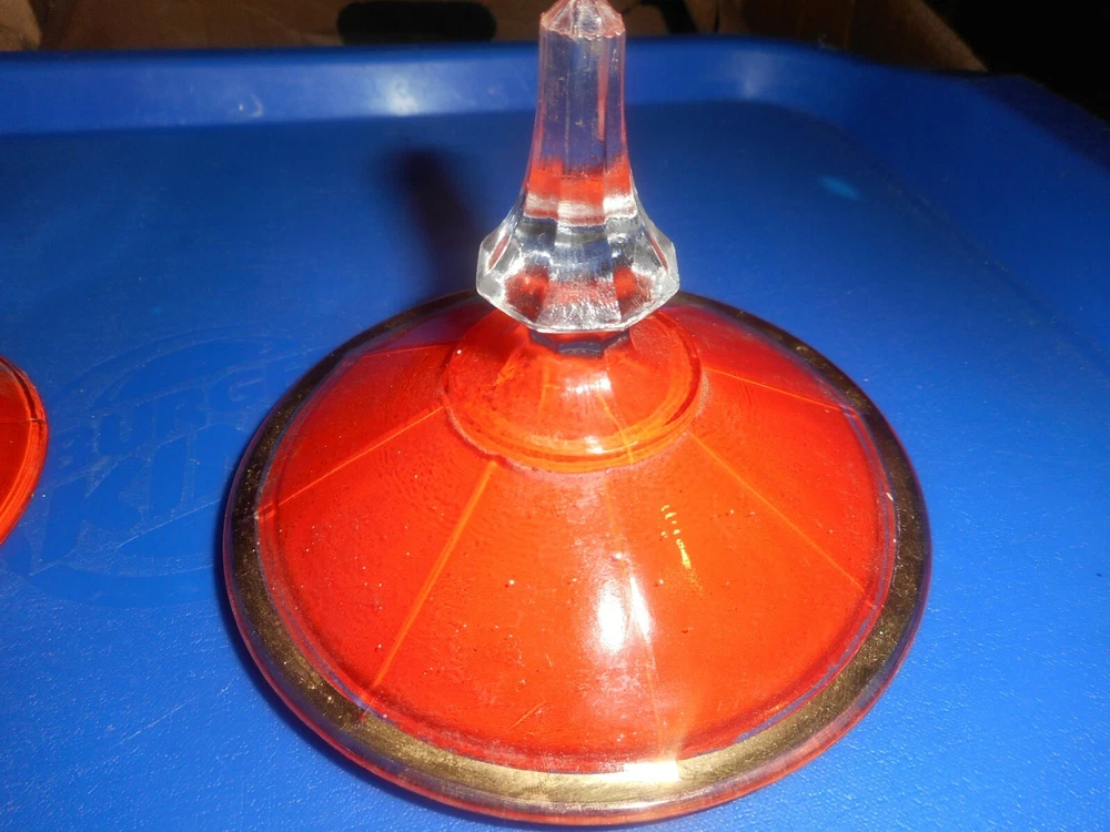 Vintage 1960's Mid Century Modern Clear Glass Candy Dish / Jar with Retro Orange Glass Lid and Base. Gold Trim Around Lid Edge. I believe this to be Heisey Approximately 9 inches high - Inner part of dish is approximately 4.5 inches across. The dish is in great shape. There are no nicks in the glass. The lid and the base of the jar are painted orange enamel. There is gold trim around the lid that is slightly worn off.