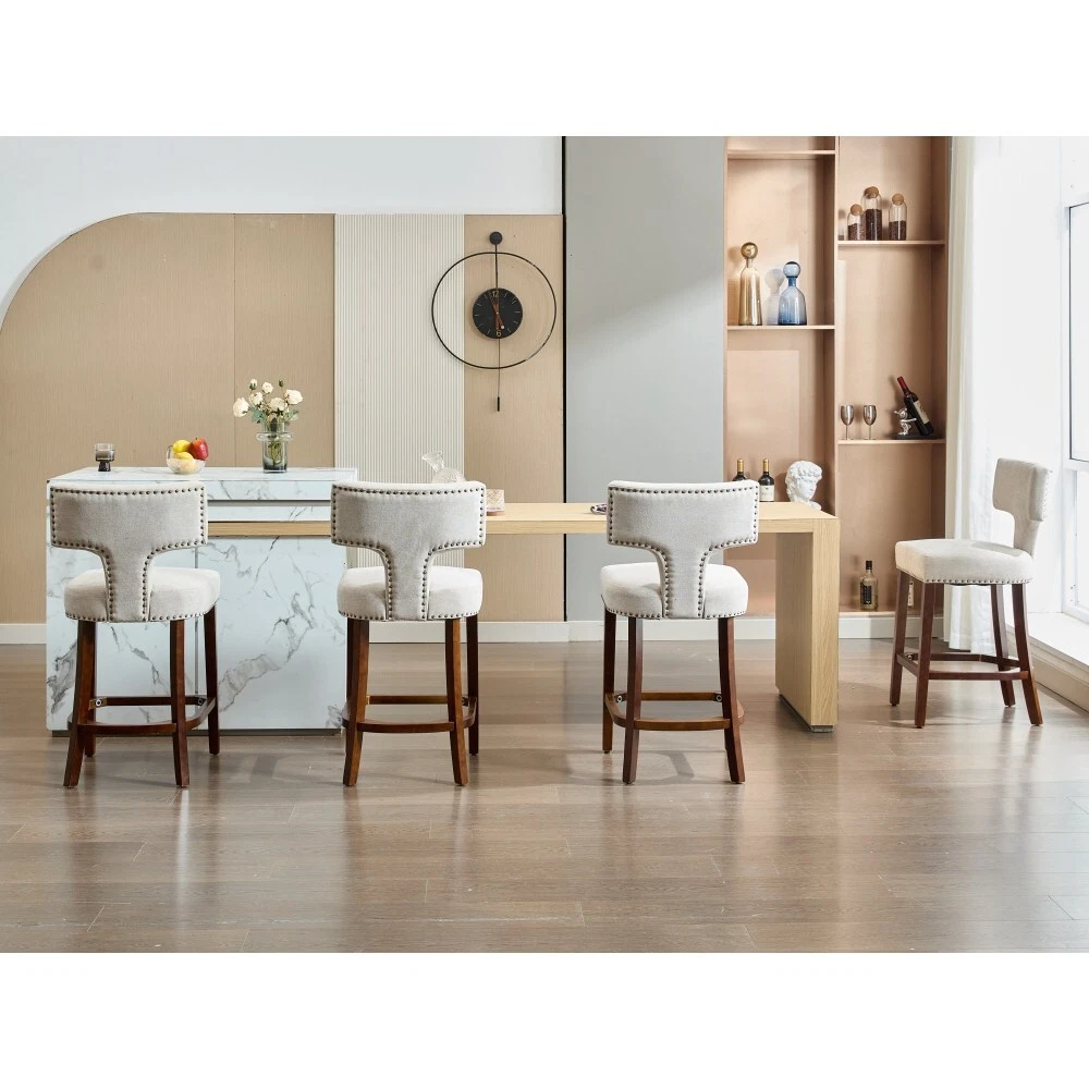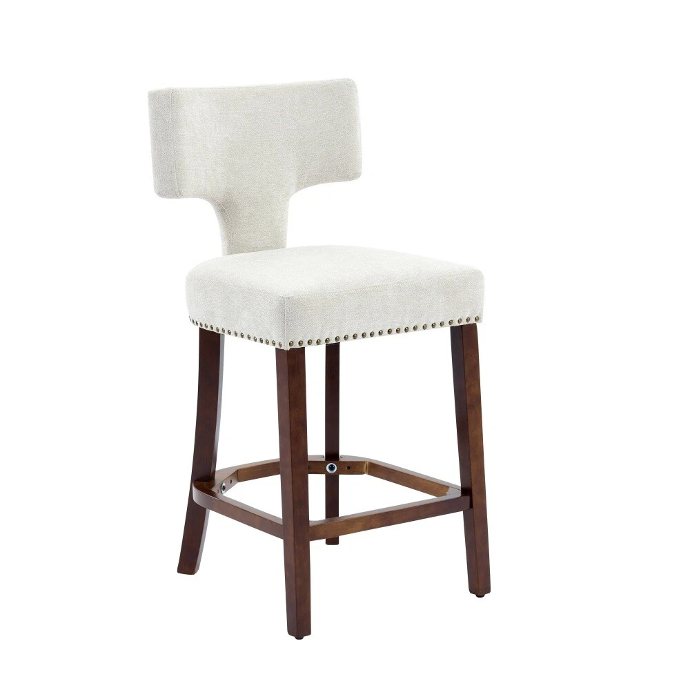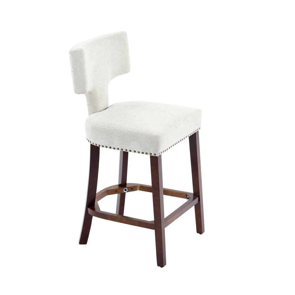Armless design, splayed legs, foam cushion upholstery, and ergonomically curved backrest provide you comfortable seat feeling. The curved backrest is decorated with copper nails around it. The Cushion uses a high density foam and steel spring inner with high rebound structure, providing you with a comfortable seating experience. And brings a very warm atmosphere into dining room, sitting room and apartment. The chair's frame and legs are made of solid wood with enough security to hold up to 300 pounds. Please use the instructions and assembly tool inside the package to complete the assembly. Adjustable pegs on the legs allow you to adjust the height of the legs. This is a kind of solid wood structure bar chair with the simplest installation The curved backrest is decorated with copper nails The curved backrest is decorated with copper nails around it. The Cushion uses density foam and steel spring The Cushion uses a high density foam and steel spring inner with high rebound structure, providing you with a comfortable seating experience. And brings a very warm atmosphere into dining room, sitting room and apartment. The solid wood legs in walnut color are equipped w This is a kind of solid wood structure bar chair with the simplest installation.The solid wood legs in walnut color are equipped with adjustable balance studs.