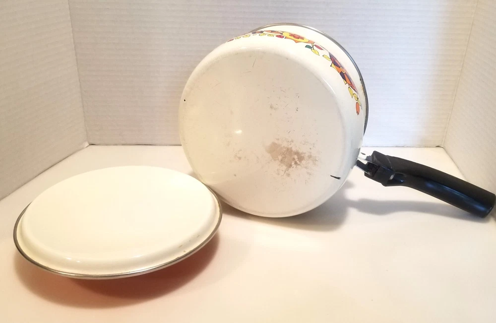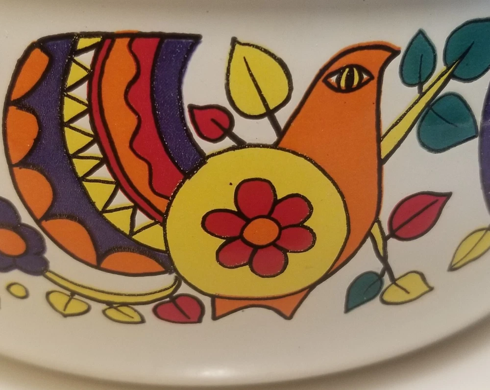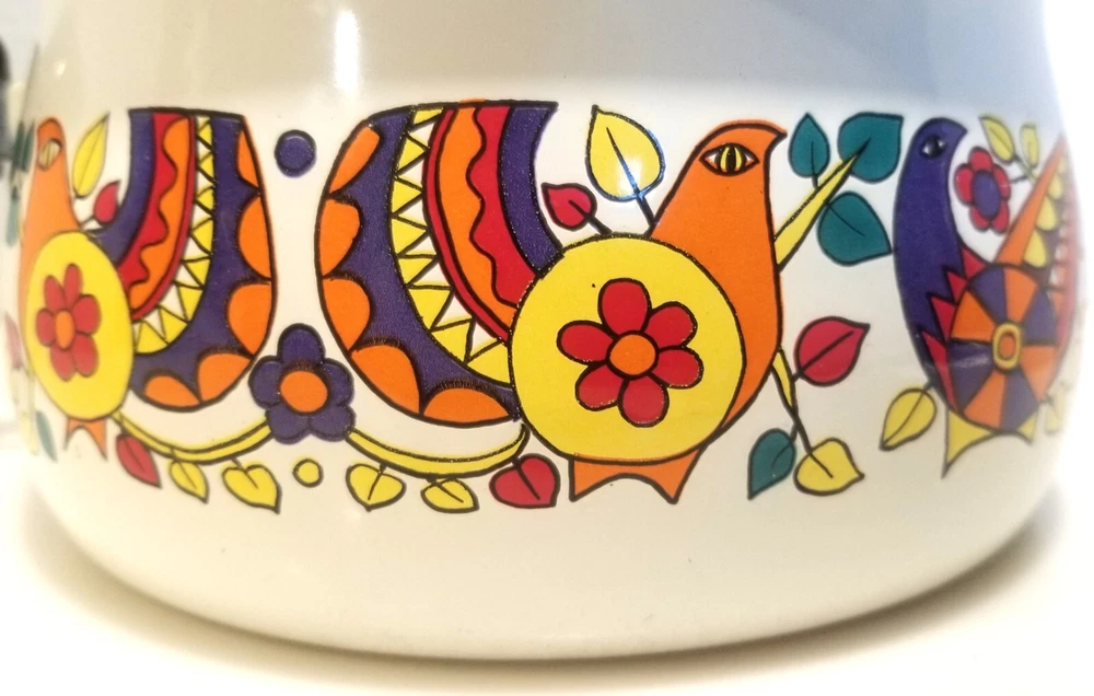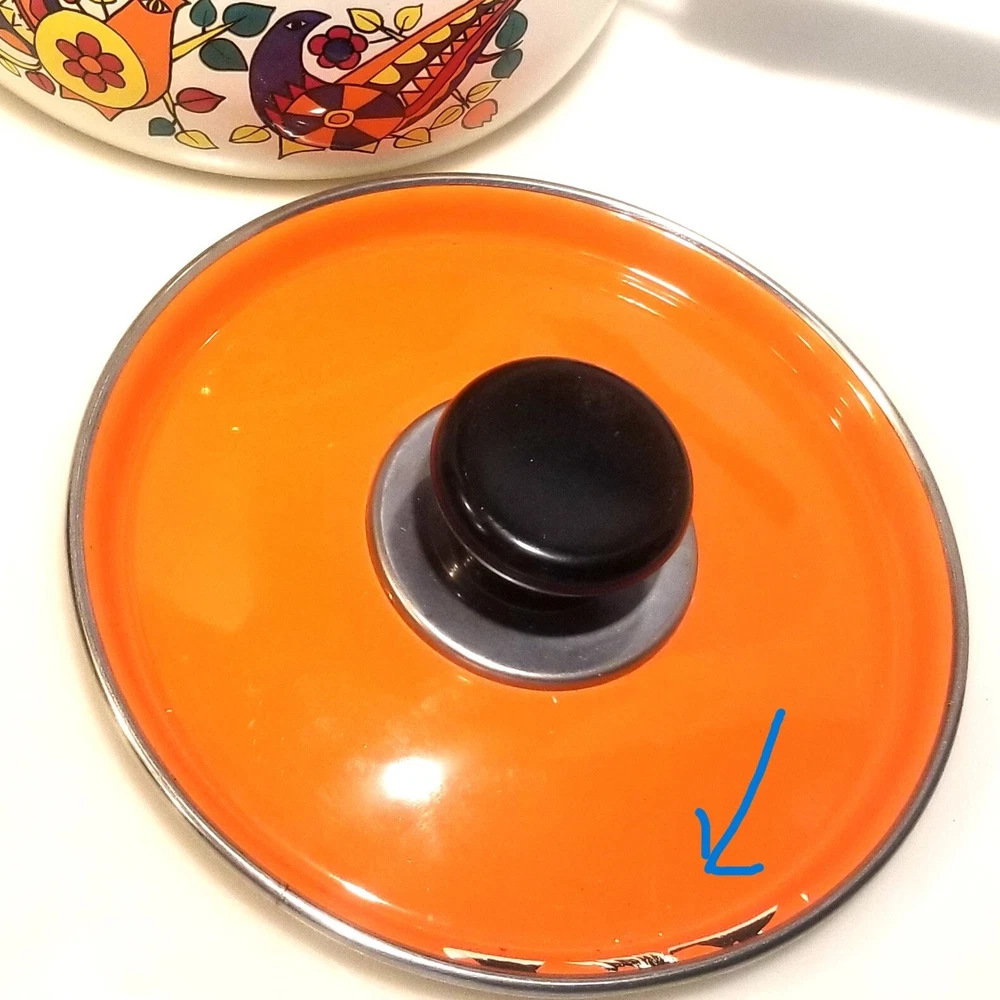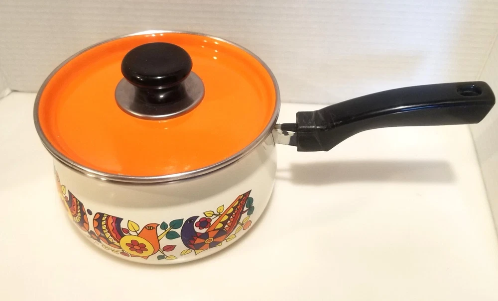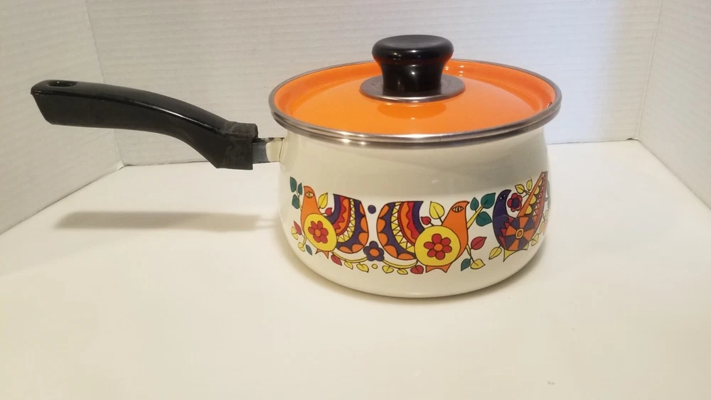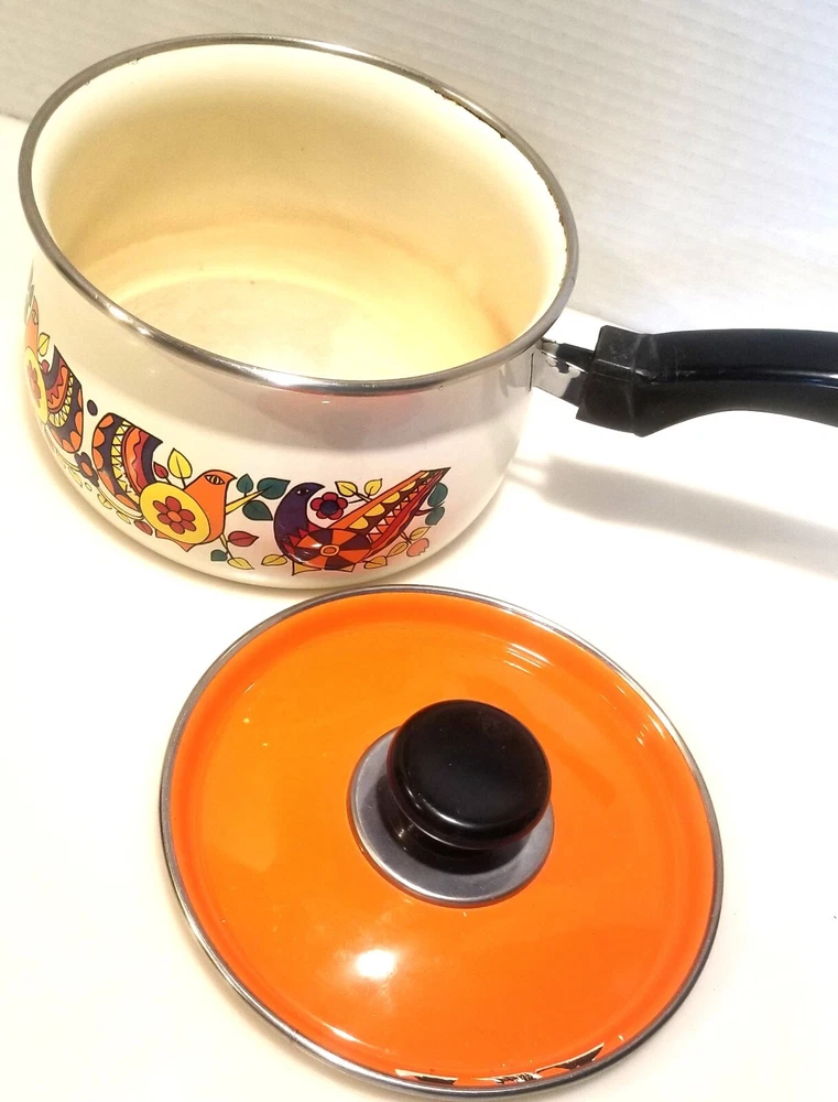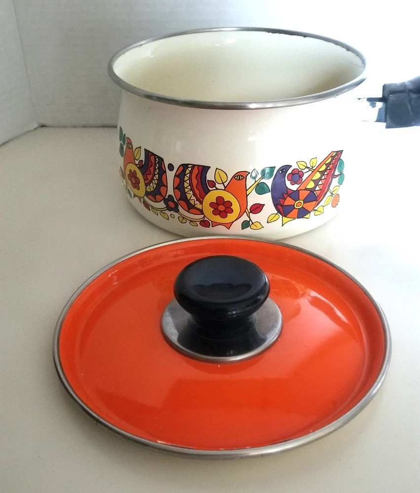 RARE! This is the epitome of "retro", the orange, the birds, the flowers, the enamel! This pot looks so good it could be used as a display with your Fiesta Ware! The pictures and the color are still super vibrant. The pot is used (and retro) so the inside and bottom have some wear. The lid has some chipping as shown in the last picture, but it truly adds to the patina. Pictures are representative of condition. Dimensions: Pot width: 7" Pot with handle width: 13" Pot depth: 4" Pot with lid depth: 6"