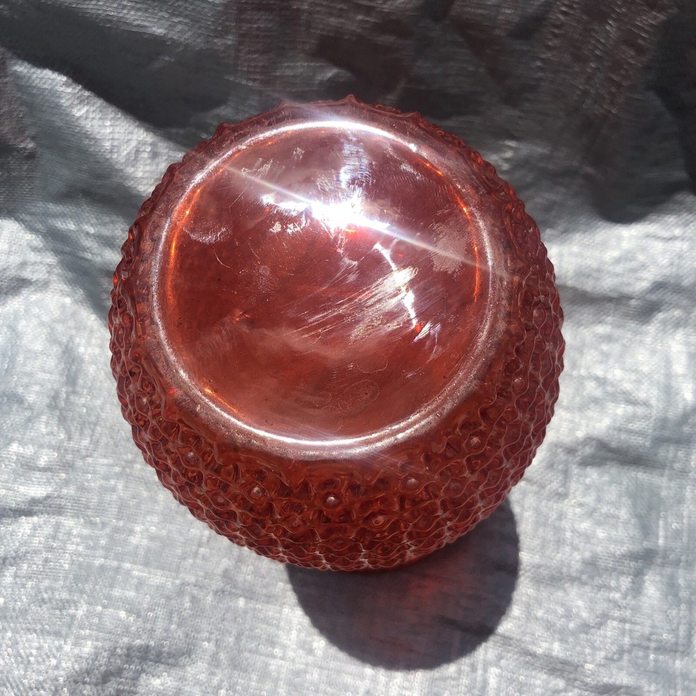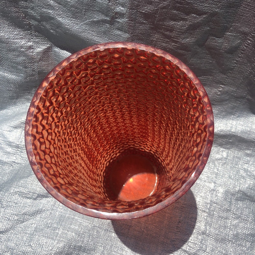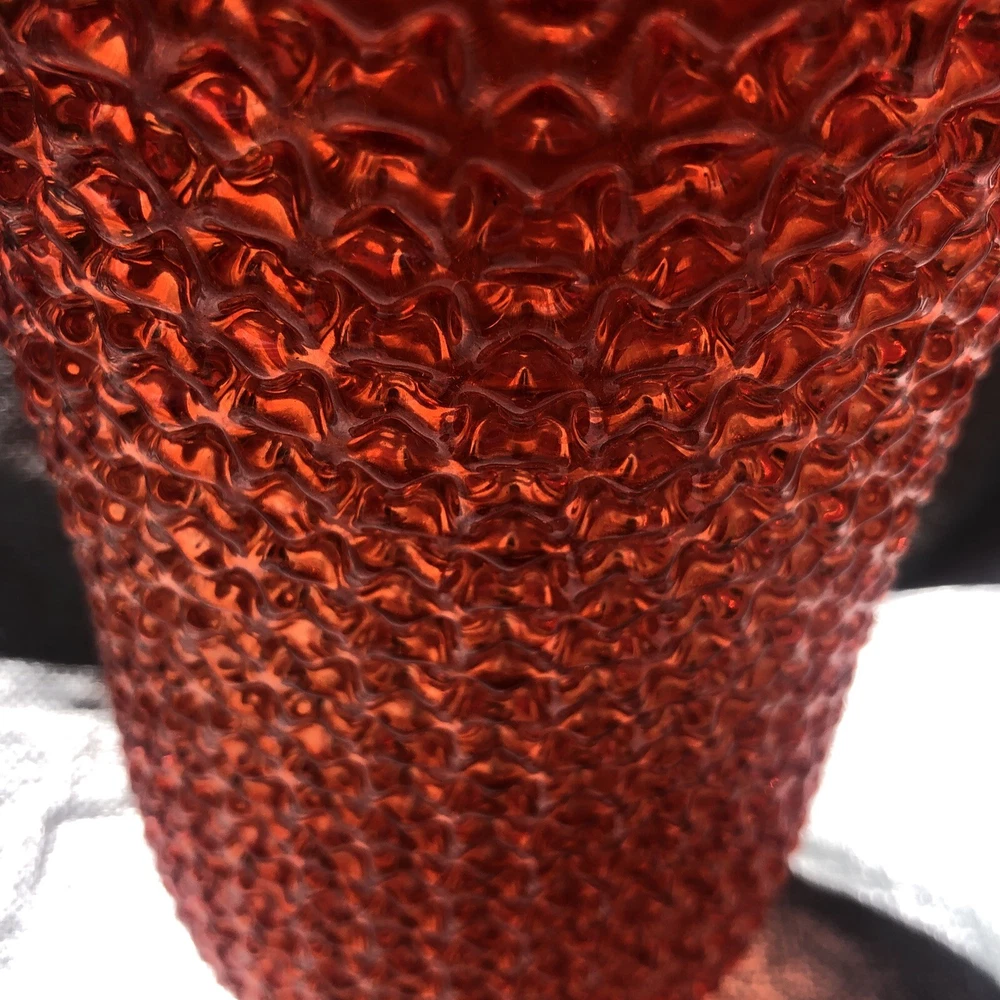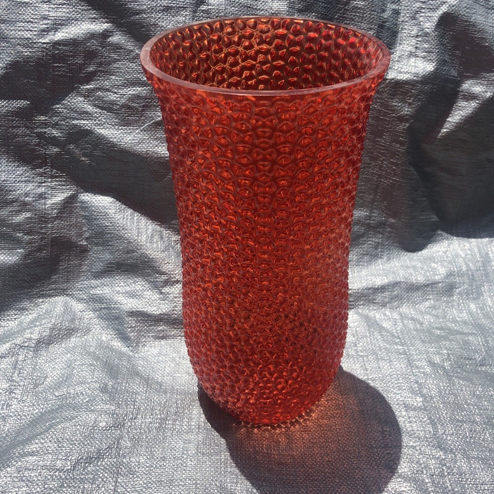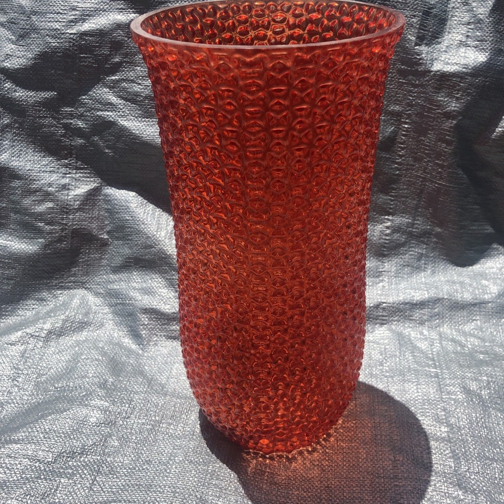 Mid Century Orange Red Geo Bump Textured Large 12” Vase. Bumpy texture is quite intriguing. More orange than red but sometimes in dim light it looks red. Unsigned unmarked age origin is unknown. 07232...