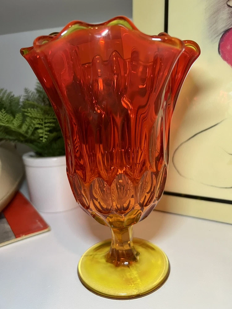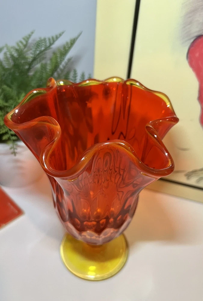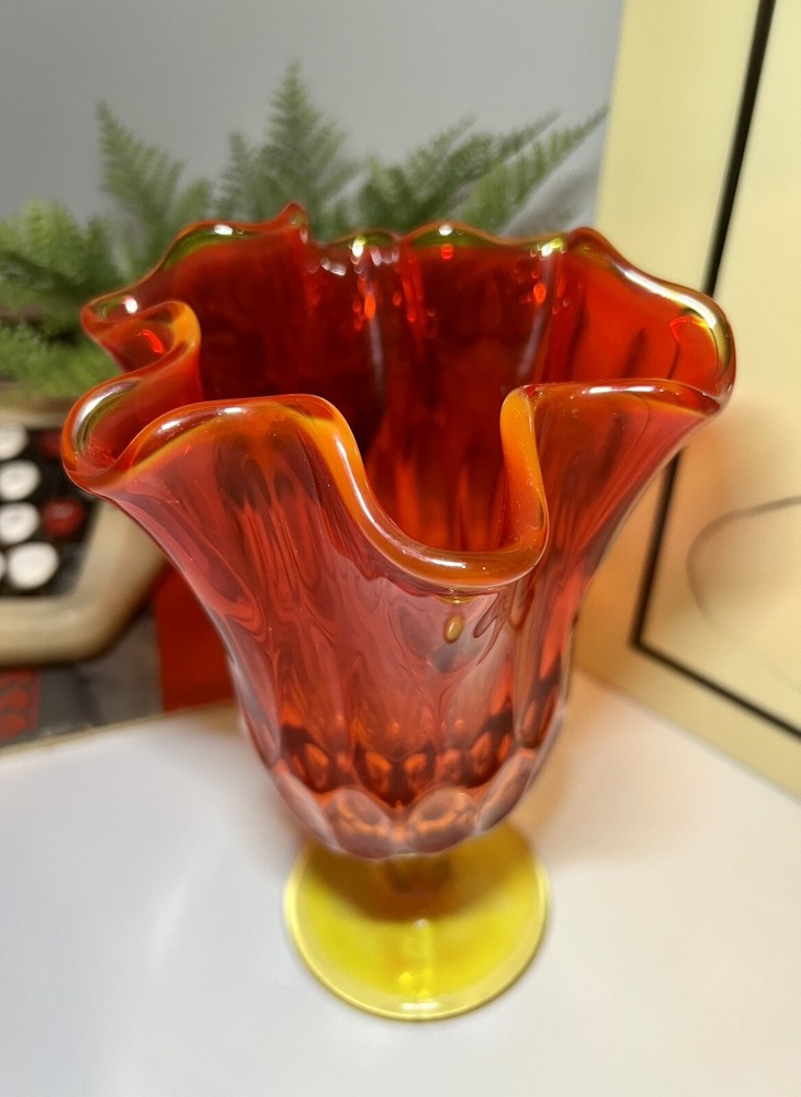 Mid Century Fenton Amberina Swung Art glass Vase Measures approximately 7 3/8” tall at highest point; 5 1/4” at widest point I combine shipping. From smoke free home. All sales are final~so please ask questions before bidding. Please see all photos for the best idea of condition and description of this item. Contact me if you have any questions. Will Ship with one business day after payment is received. Thank you for looking.