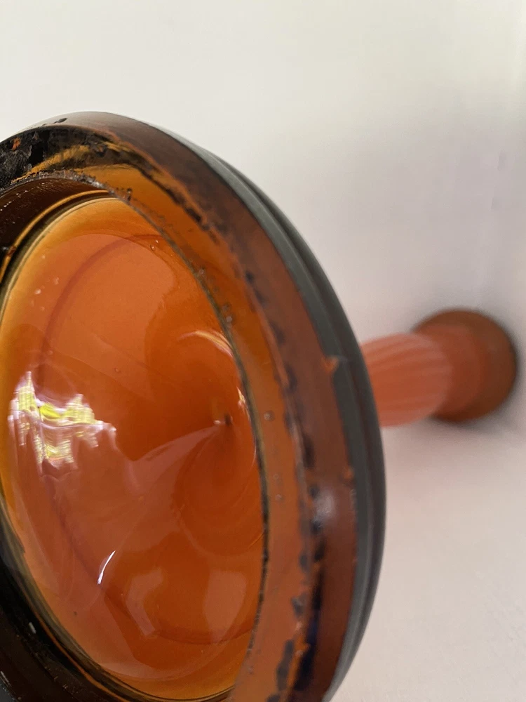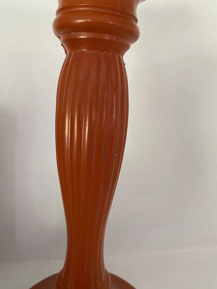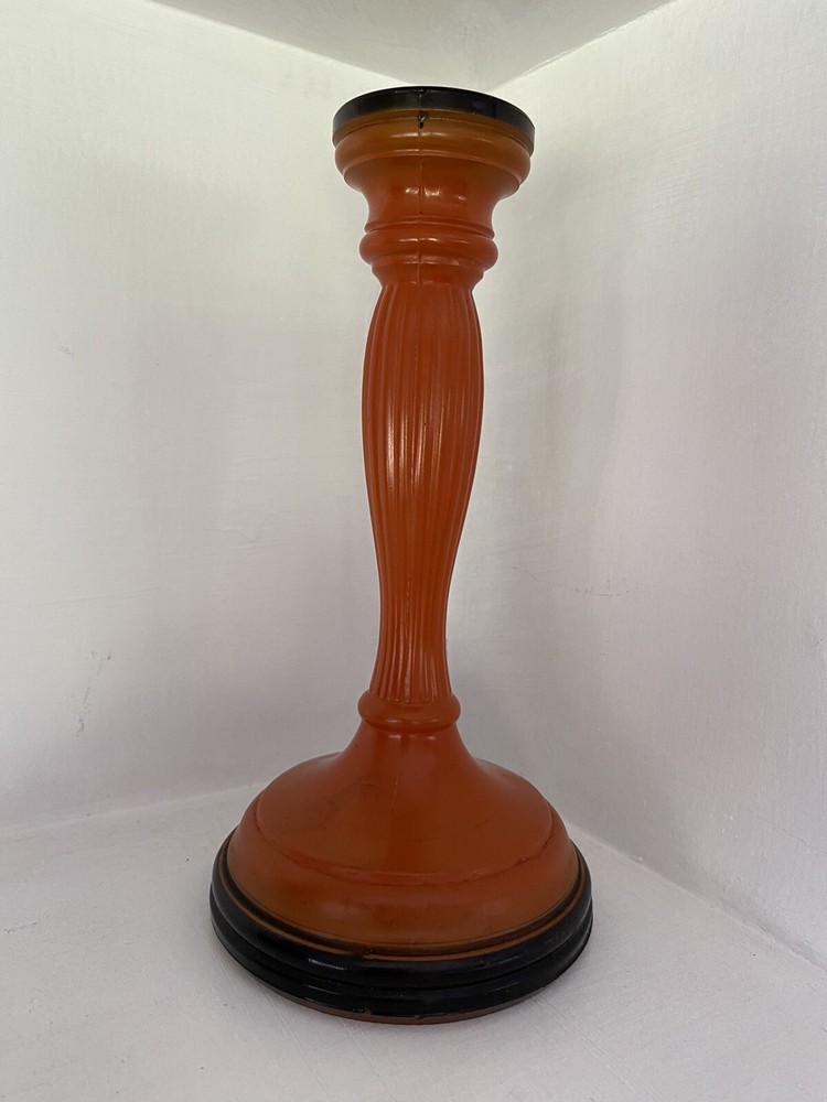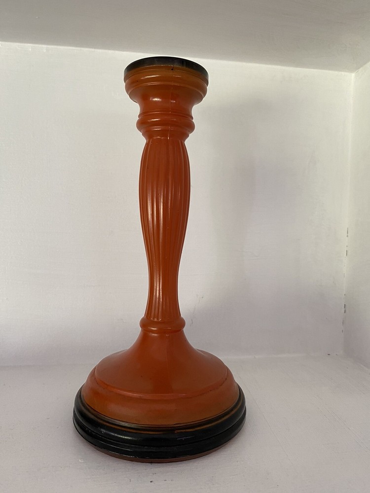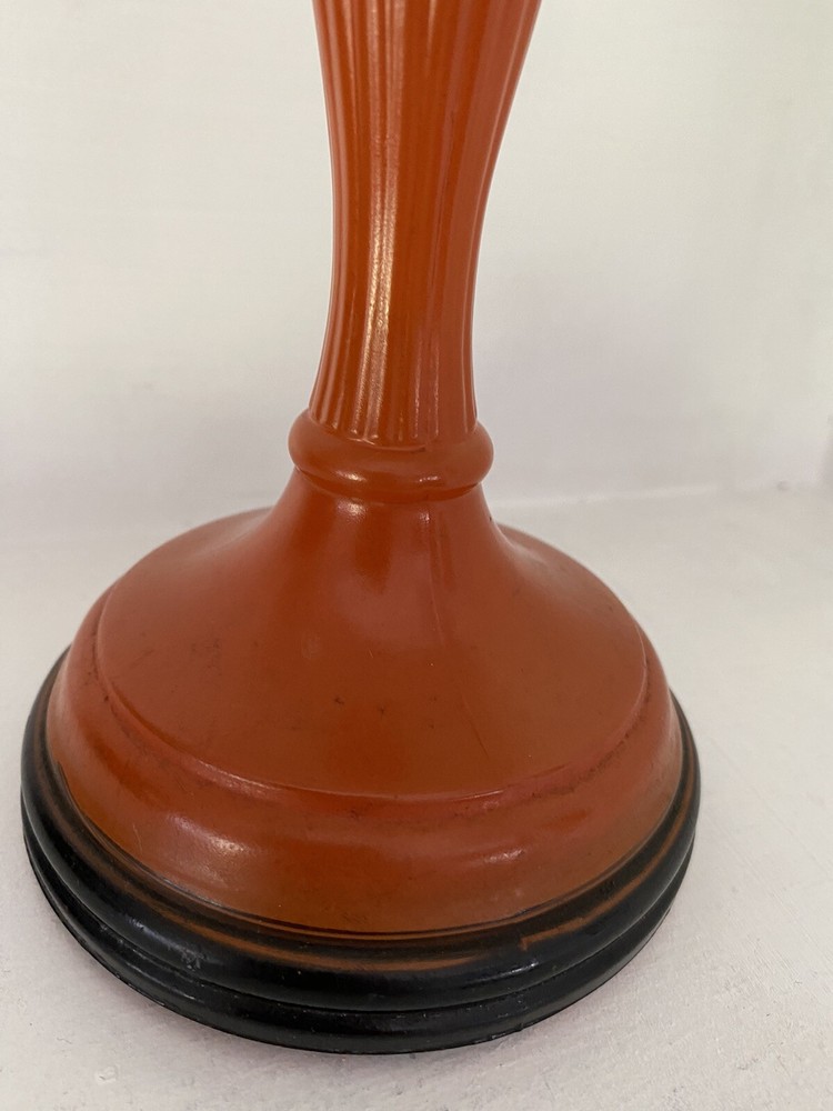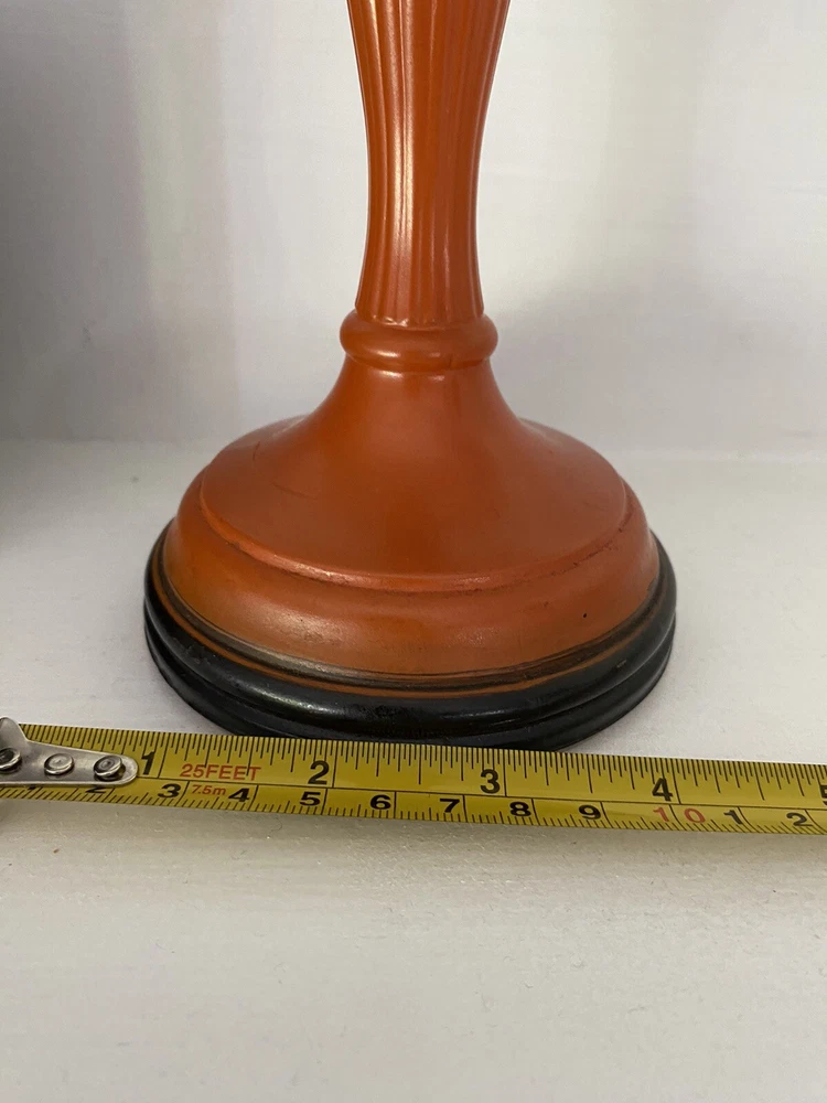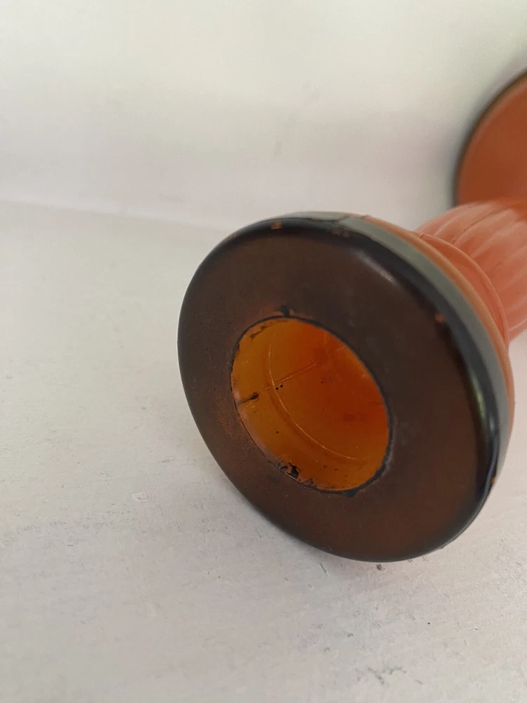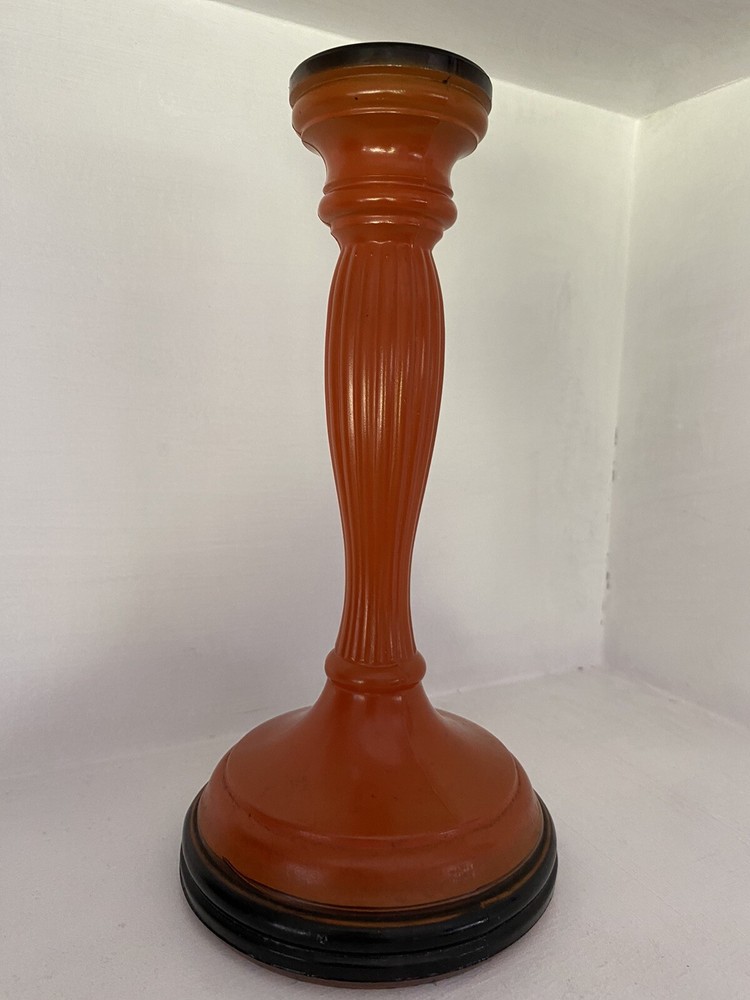 Imagine the possibilties for Halloween! Amazing MCM orange and black glass Candlestick as shown in photos. No labels. Measures approx. 9" to the top of the rim. Not sure of the origin since there are no labels. We see similar pieces listed as Czech - you decide. There are some small scratches in the glass and bubbles typical of this glass. Displays great. Selling as found at a local Estate. No damage. Please inspect the photos -- they tell the story. See photos. Send questions prior to purchase. Shipping by USPS or FedEx. Note: Happy to combine items to save on shipping. Will refund shipping overages.
