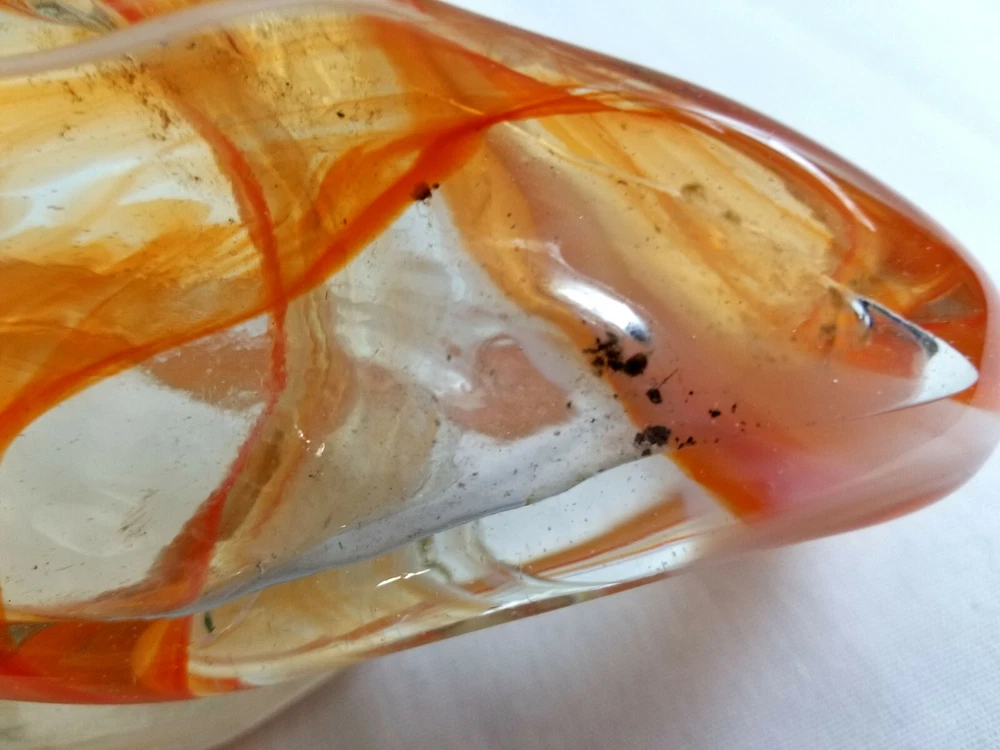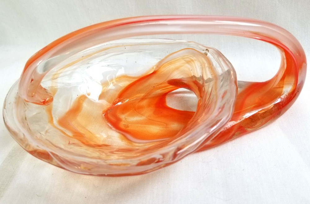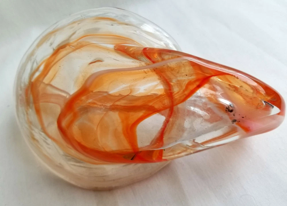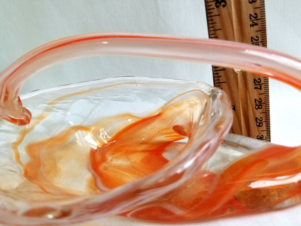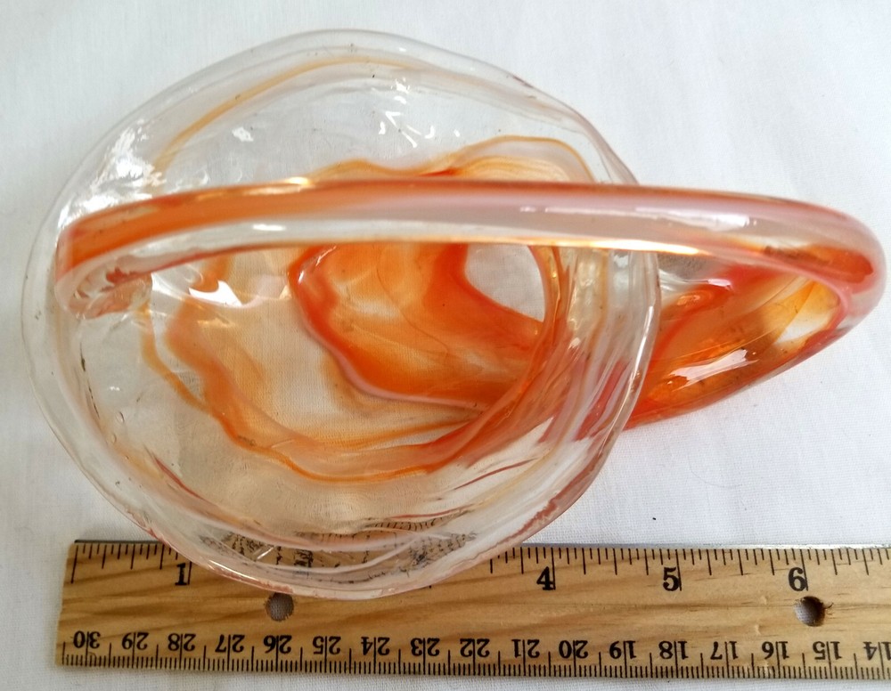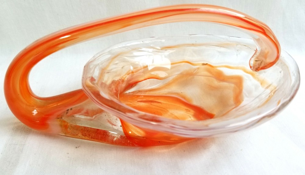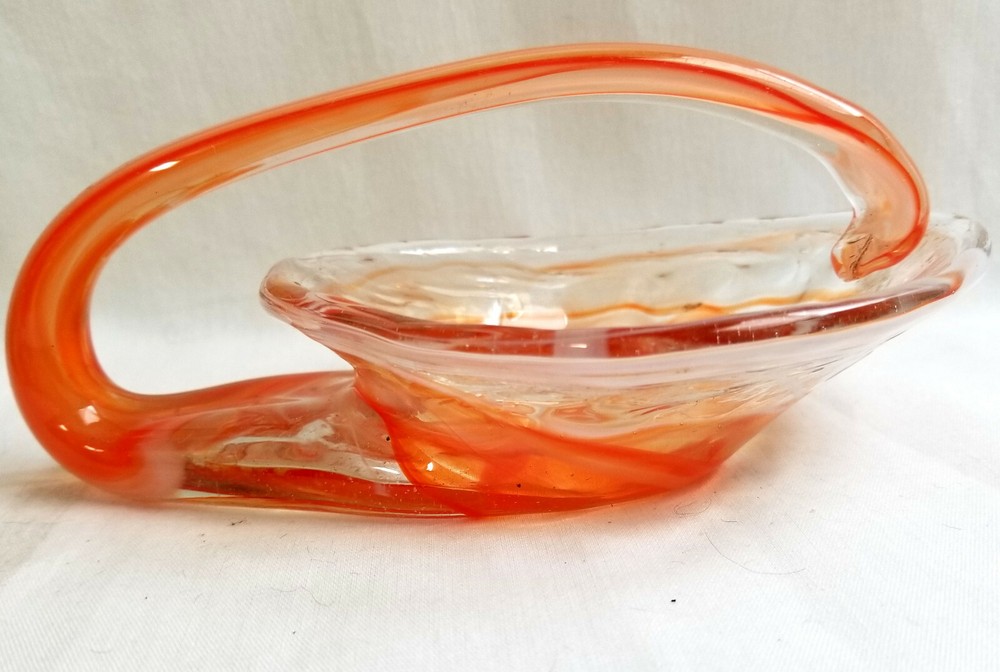 Mid Century Hand Blown Art Glass Orange Clear Swan Candy Dish Bowl ★ Vintage elegant glass. Unique in shape. ★ Material: Glass. ★ Approximate Size: 2" tall, 6" across. ★ Brand/Maker: Unknown. ★ Color: Clear with shades of orange swirls. Monitors display colors different. If you have any questions on color or size, contact us so we can help you. ★ Condition: Pre-Owned - No chips or cracks. Small black spot on bottom/burnt glass. Colors are good & bright. See Pictures. *~*SHIPPING*~* Shipping is FREE with in the Continental USA on fixed priced listings only. We combine the shipping on multiple purchases. International Buyers Please Note: Import duties, taxes, and charges are not included in the item price or shipping cost. These charges are the buyer's responsibility. Please check with your country's customs office to determine what these additional costs will be prior to bidding or buying. Payment needs to be received within 2 days or an contact to let me know if you are bidding/shopping on other items. We are here to help and will be happy to work with you! *~*MISCELLANEOUS*~* We work very hard to insure that the item you are purchasing is “As Described”, but we are human so if any mistakes are made, PLEASE Contact us, so we can work with you to make all things right. Check out all the photos in listing. You are welcome to message us for more information on this or any of the other items. SB55 Shoppe is a Smoke Free, Pet Friendly environment. Thank you and we appreciate you and your business. Please visit us again. *~*RETURNS*~* 100% Money Back Guarantee item will be as described! If Multiple items or Lot of Items are purchase and one is damaged in mail, refund will be for only the one that is damaged. Contact Seller Item must be returned in the same condition that it was received. Other conditions apply. Shop with confidence! Track Page Views With Auctiva's FREE Counter