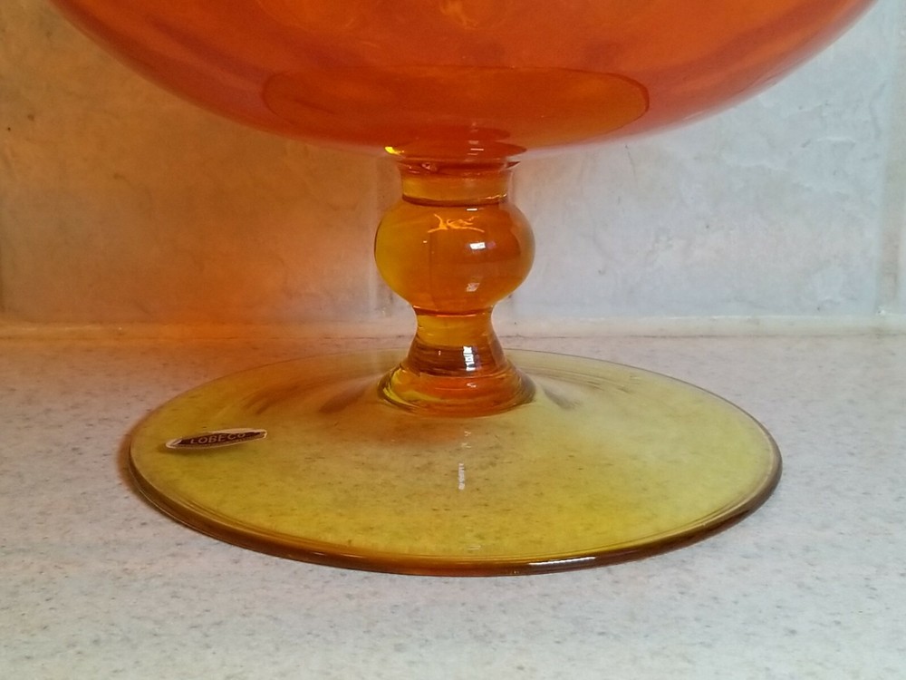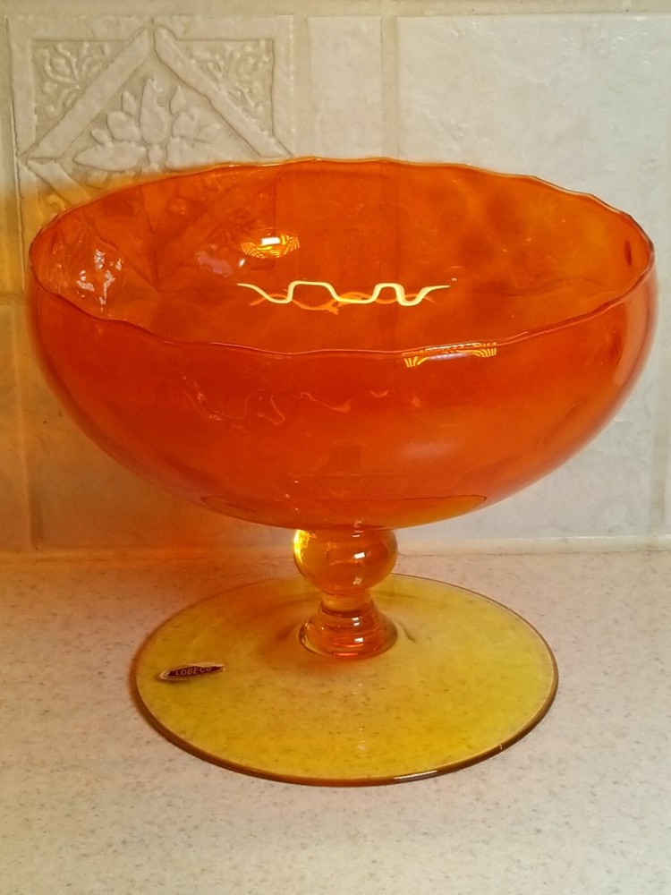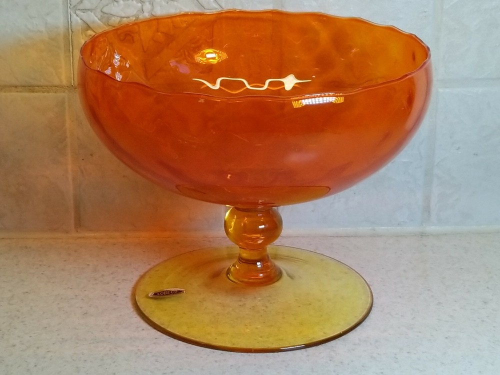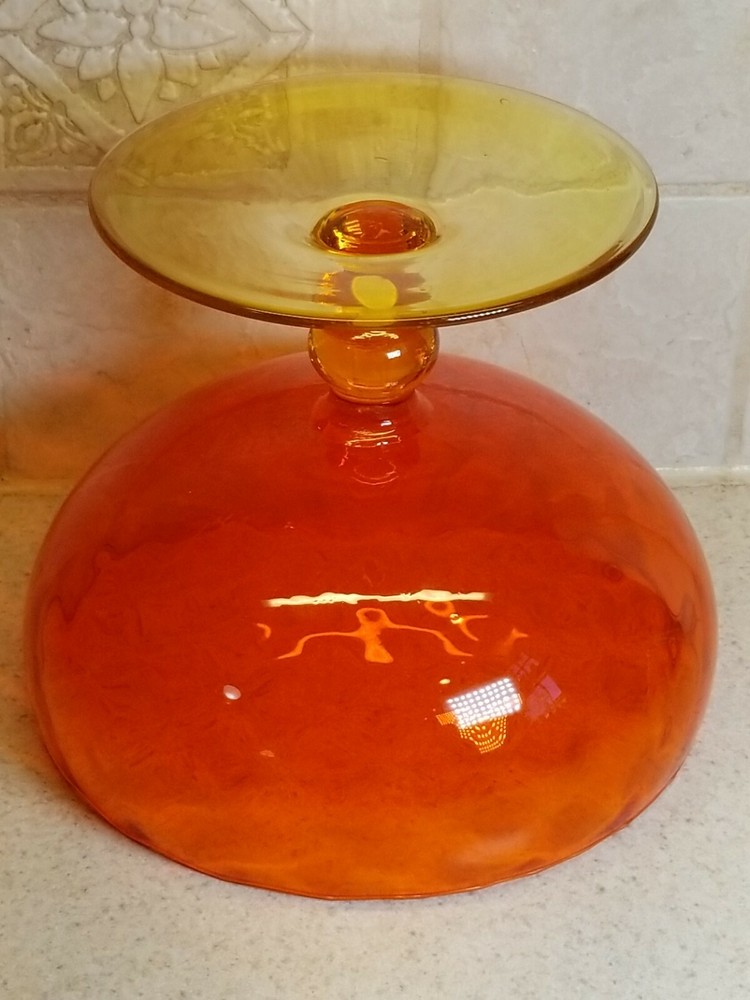 Mid Century Italian Empoli Orange & Yellow Art Glass Compote. Gently used and all good example. Clean inside and out. Stands at 6". It is found in great condition. There are no chips, flakes, cracks or damages that I see. Applied base and foot are all good. Please see all of my photos. Multiple purchases are always combined to save on shipping charges. Please contact me with any questions and I will respond promptly. Thanks for looking!