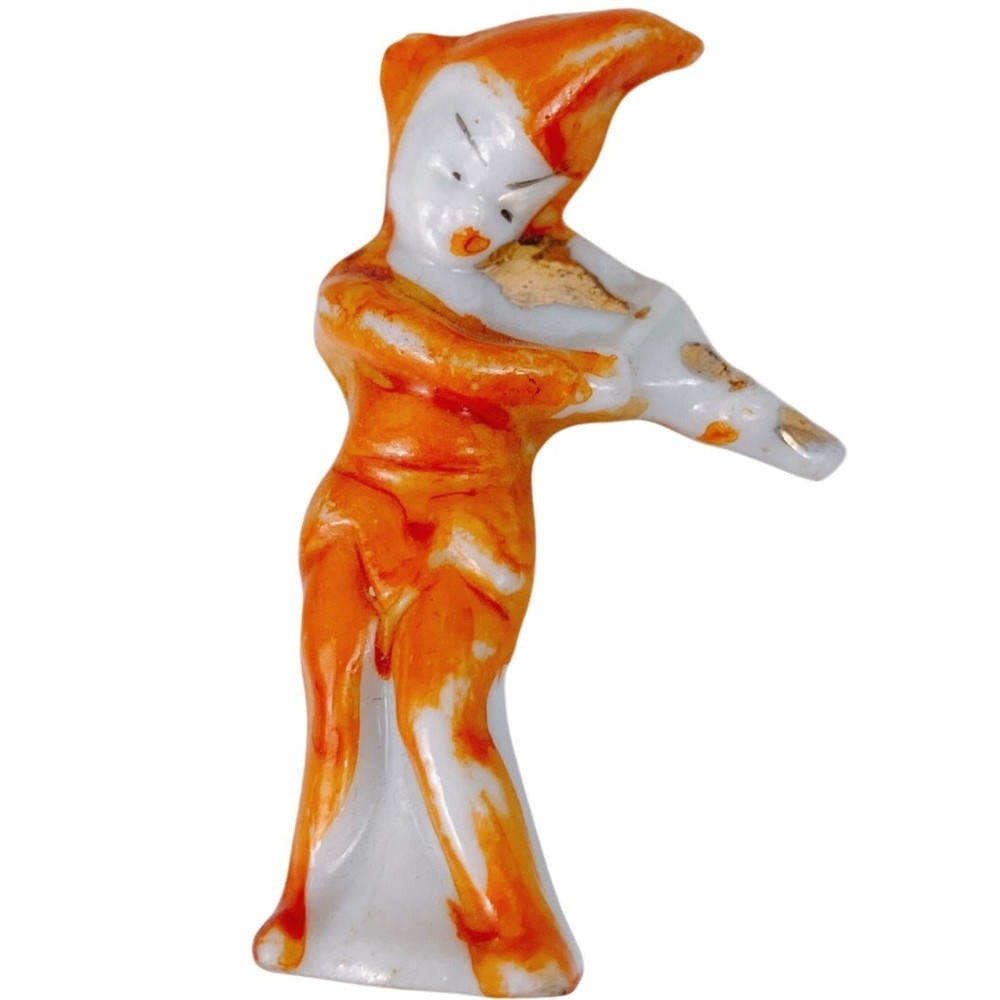 <![CDATA[<div>This mid-century porcelain figurine captures the whimsical charm of early postwar Japanese exports, when delicate hand-painted ceramics were crafted for a growing Western market hungry for affordable, decorative novelties. With its expressive pose & vivid orange glaze, it reflects both the playful aesthetic & economical artistry of 1950s Japan, blending nostalgia w/ collectible appeal. Designer: ? Origin: Japan Materials: Glazed porcelain Style/Era: Mid-century; likely 1940sā50s; features hand-painted orange, white, & gold-tone coloration in a whimsical, stylized figural design common to early post-war Japanese exports Condition: Good used / vintage condition; moderate paint wear, particularly on arms, chest, & instrument; no visible cracks or breaks; wear consistent w/ age Approx Dimensions: 2 1/16 x 1 1/4" (widest) Features: Molded figurine; violinist or musician pose; "MADE IN JAPAN" mark incised on foot; hollow base; gloss glaze Offers / questions welcome