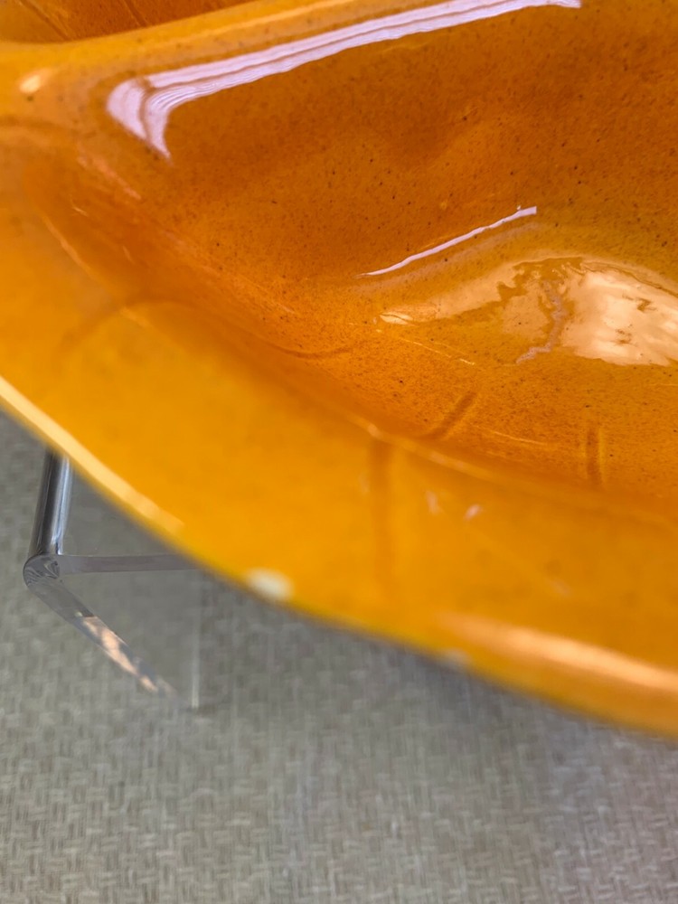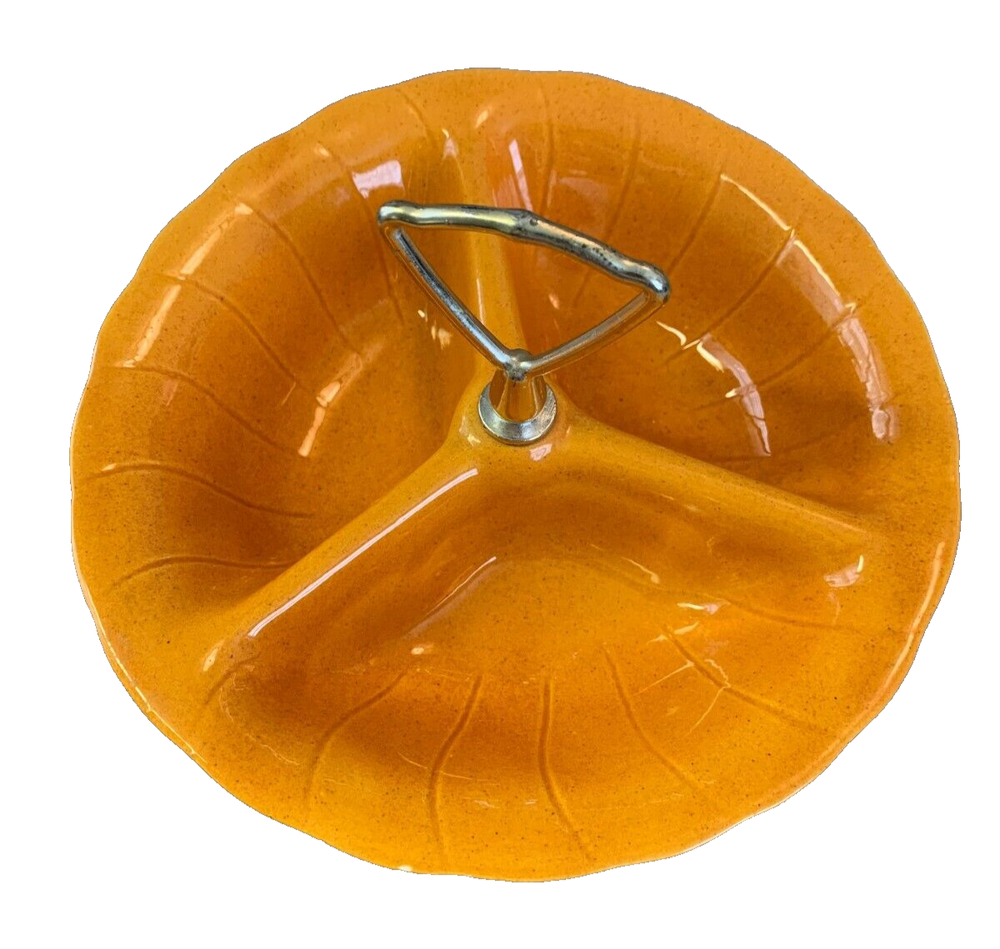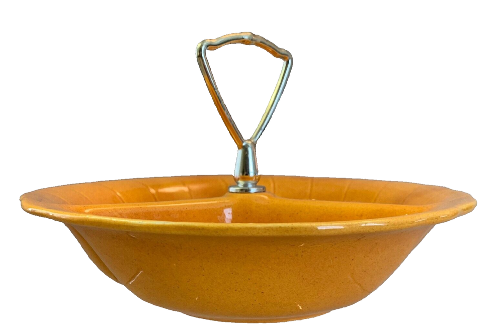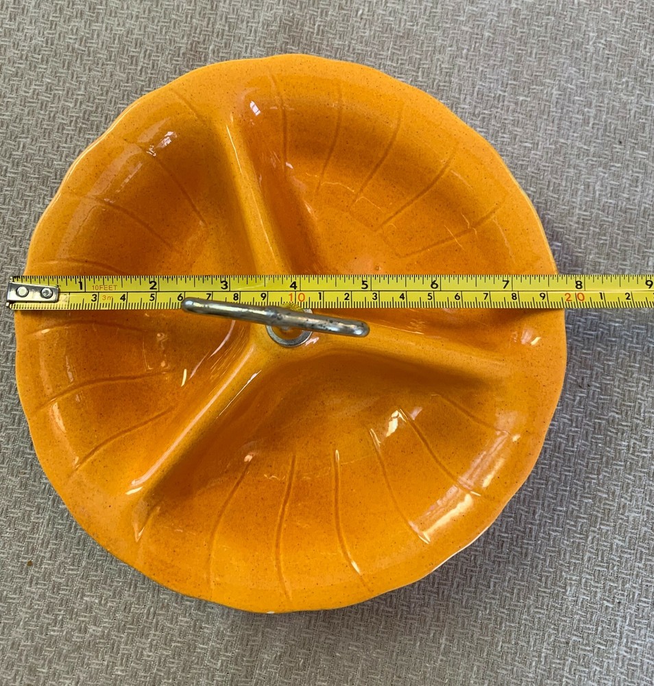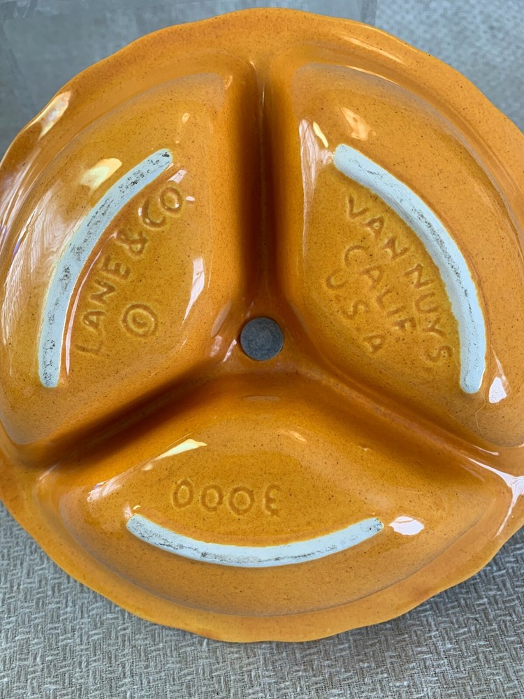 Vtg Orange Ceramic Nut Snack Candy Serve Dish Divided Bowl Handle Lane Calif USA Great bright orange color will add fun to any party, great for nuts, snack mix or crackers. Condition is pre owned and used with a small chip on the edge. Otherwise very clean. Enlarge and look at all photos for more details on condition, design and size. Please contact if additional information or photos are needed.