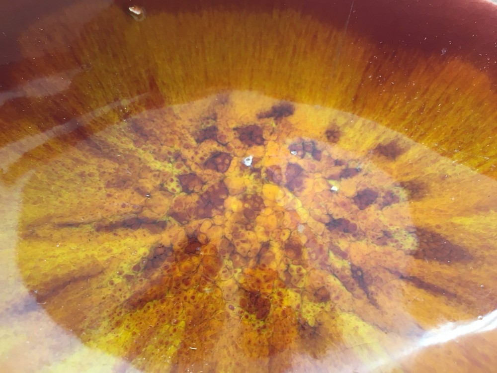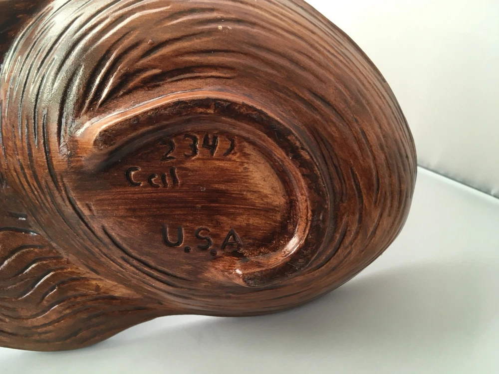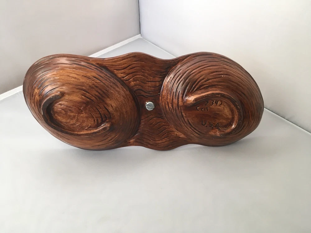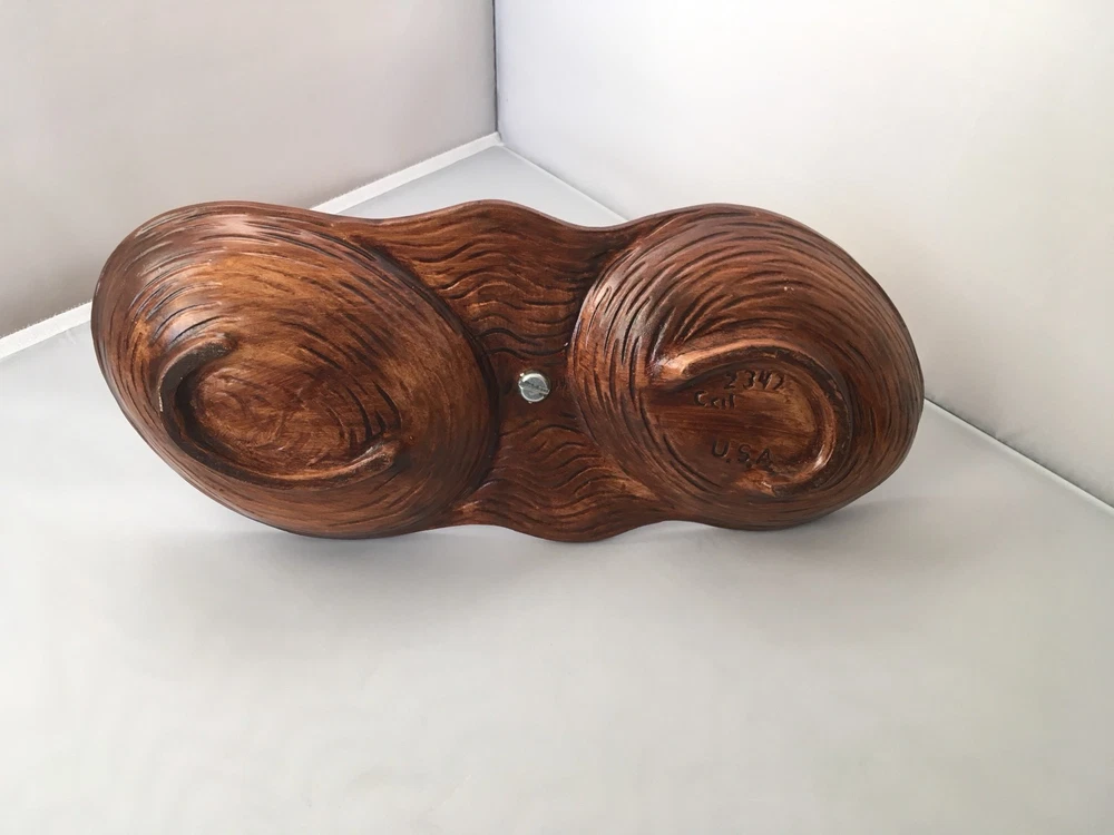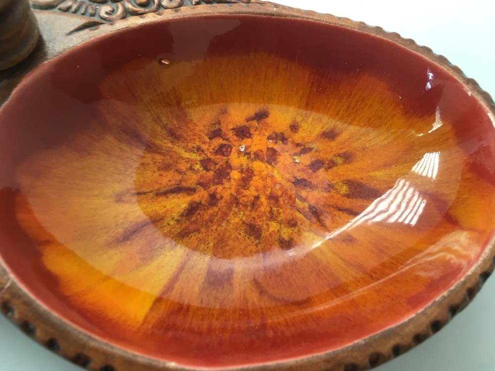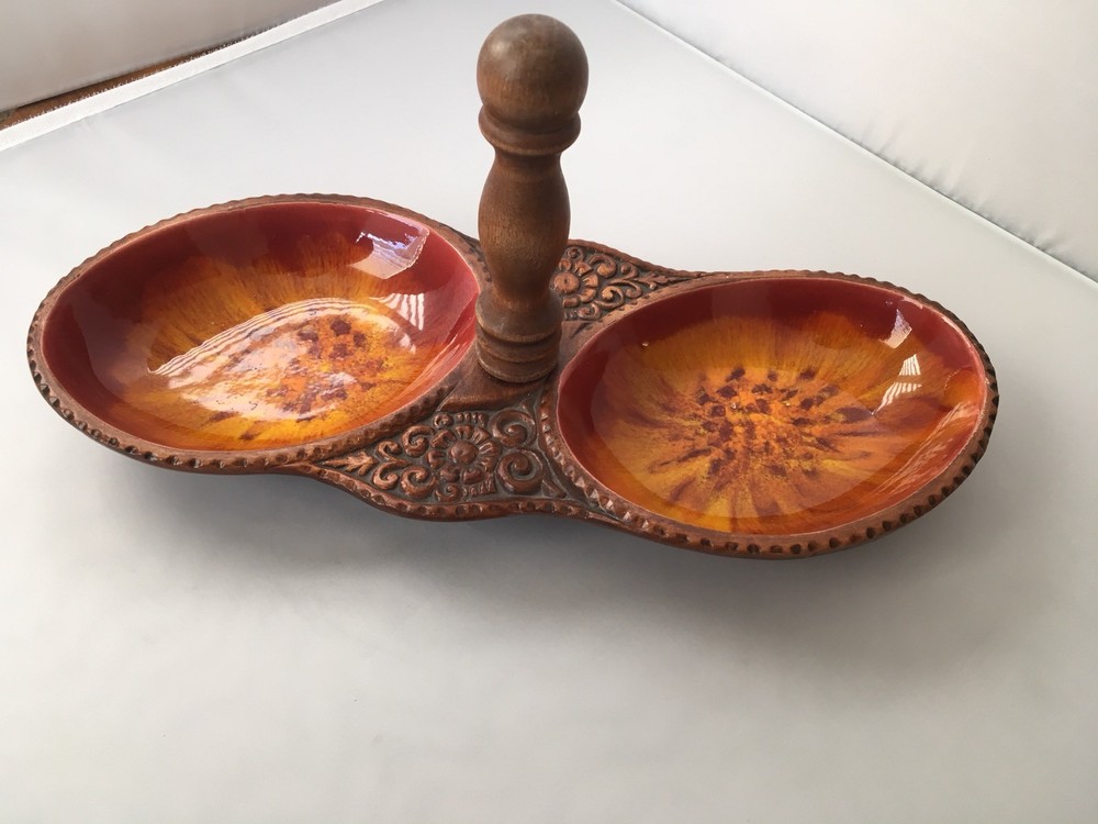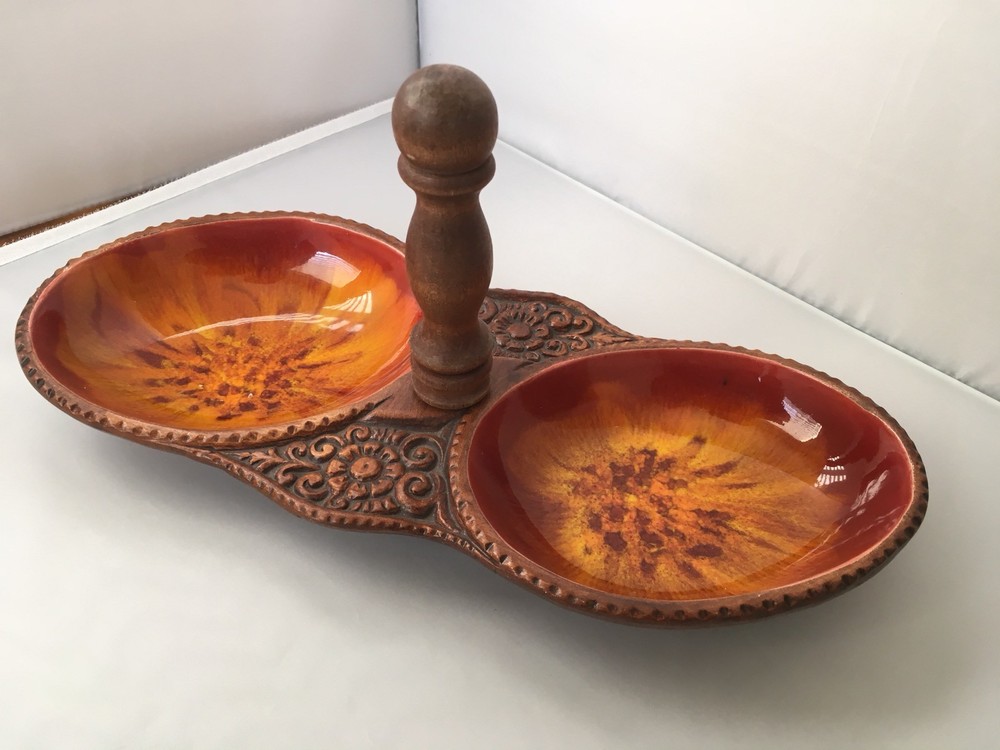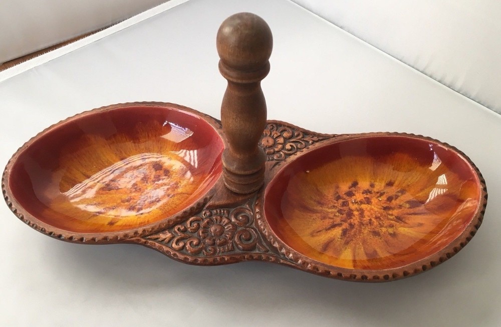 Great Mid Century Snack, Nut or Candy Dish Burnt orange and red glazed inside of bowls. Marked 2342 Cal U.S.A on bottom Wooden handle Ceramic base Measures approx. 12" x 5" and 6" tall A few small imperfections in the glaze or small chips on one bowl. Please see photos.