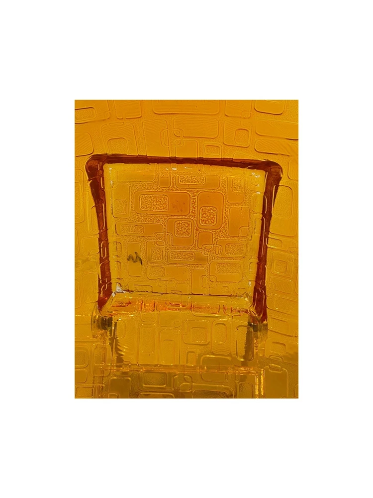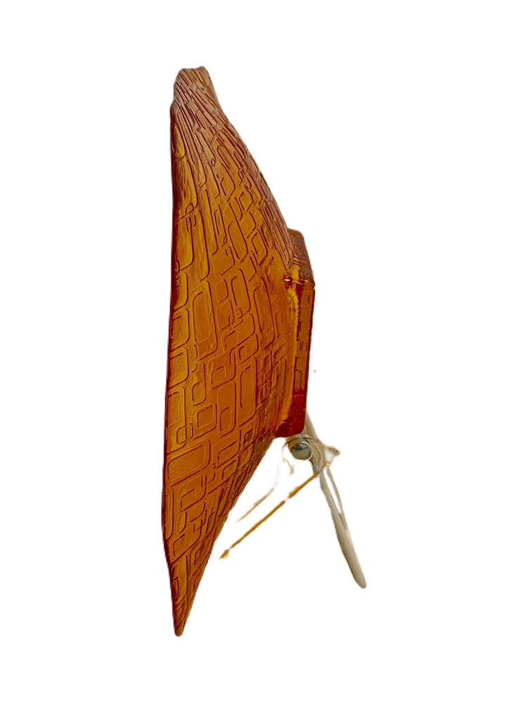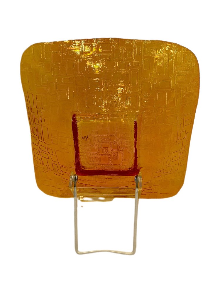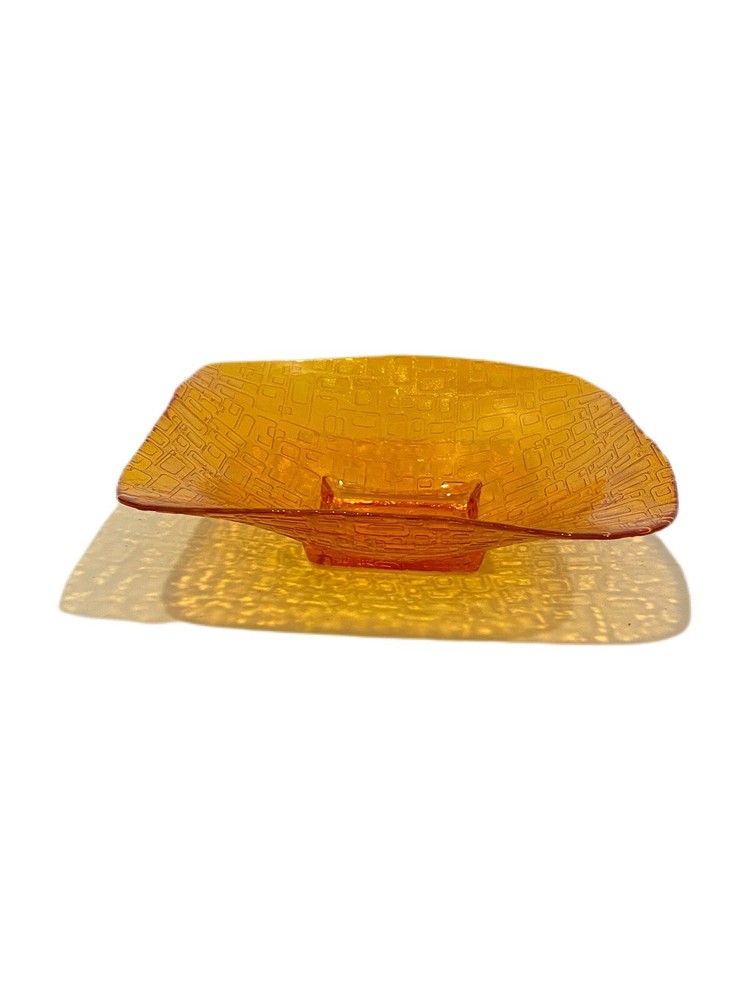 Mid Century Mod Style Low Bowl Glass Dish Orange Geometric Square Design. Approx. 10" x 10" square. Good used condition. No chips or cracks. Little bit of paint chipping on the bottom of the dish (see last photo). Looks like something you would see in Palm Springs, CA.