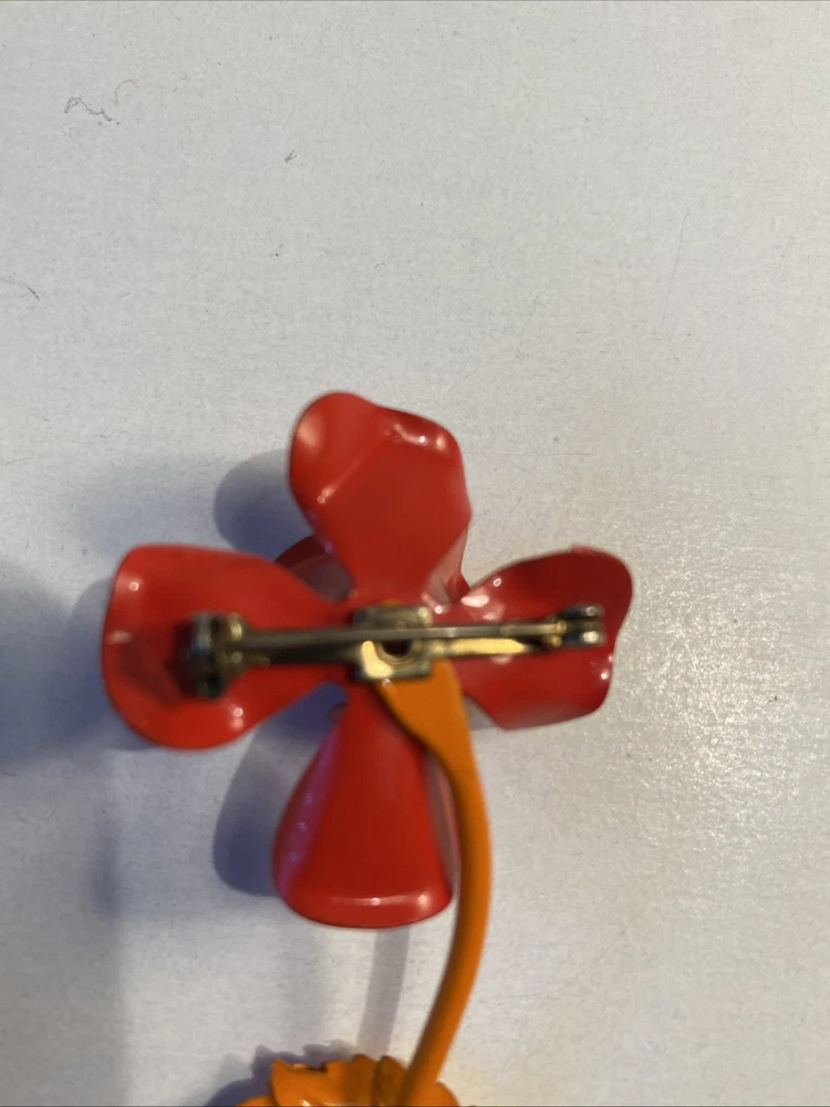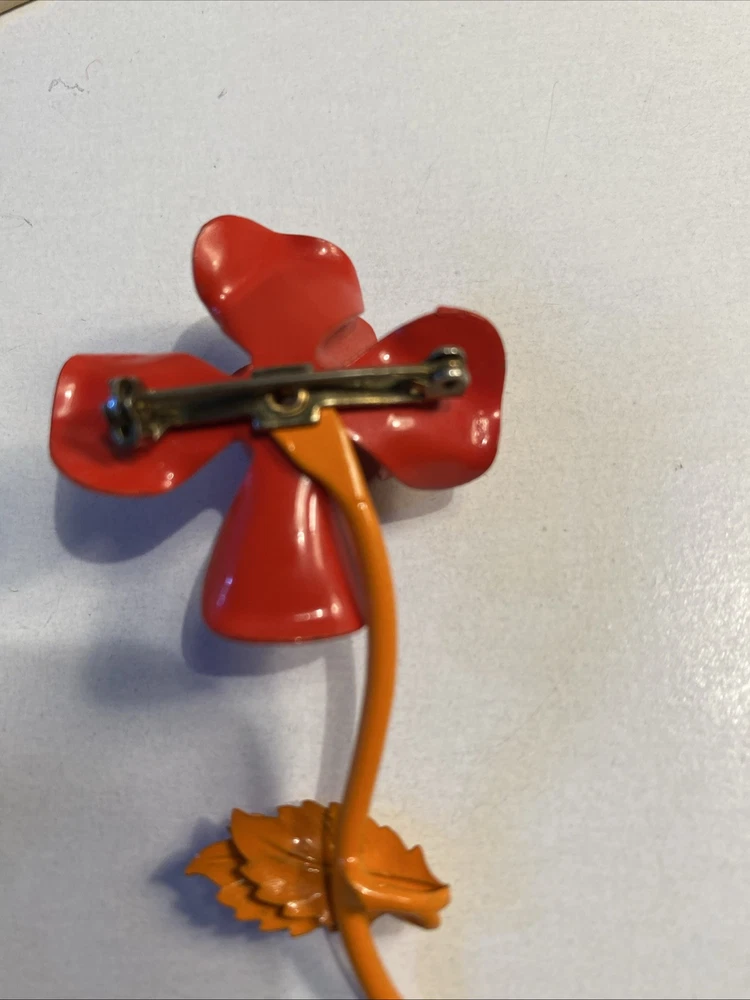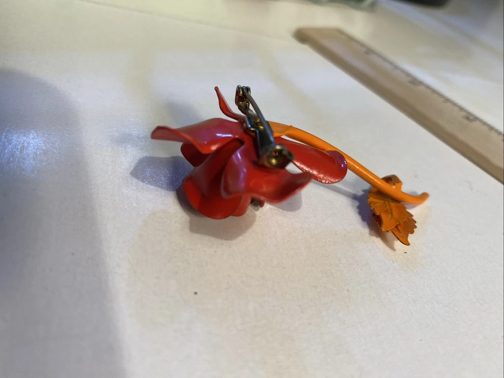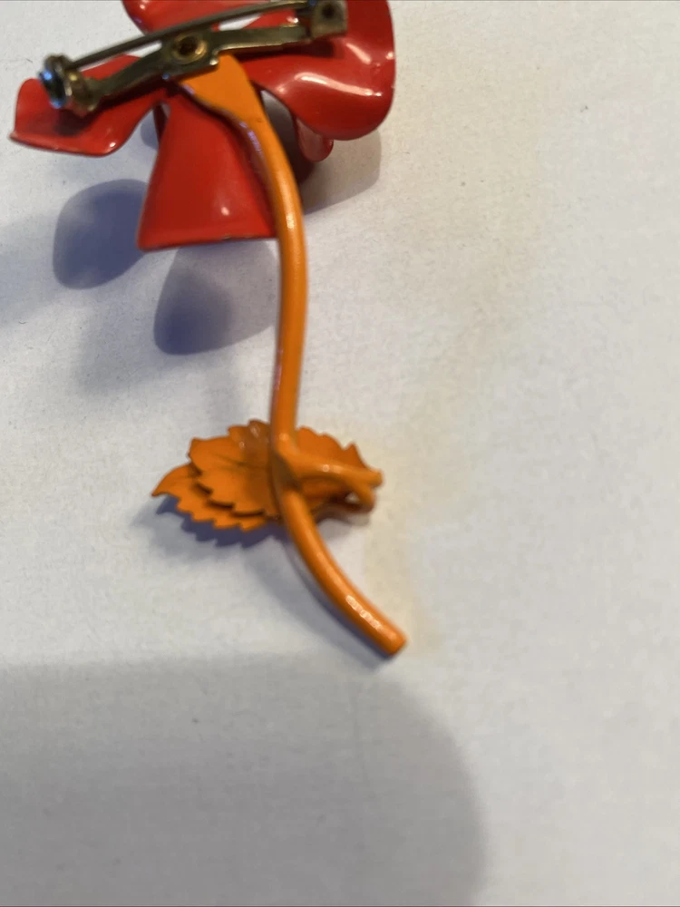 Mid Century Modern 3” Metal Flower Rose Brooch Pin Enamel Red & Orange Good condition see photos...