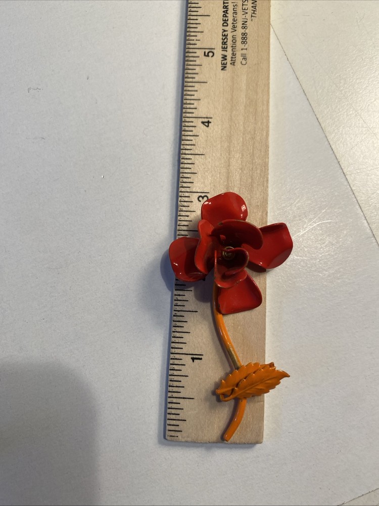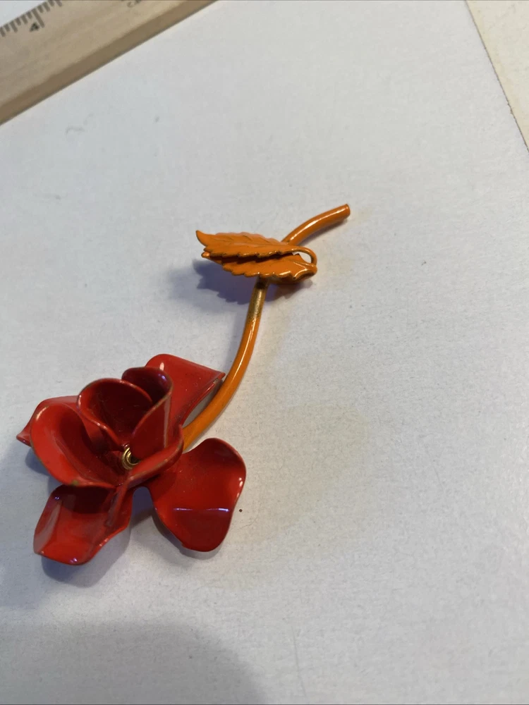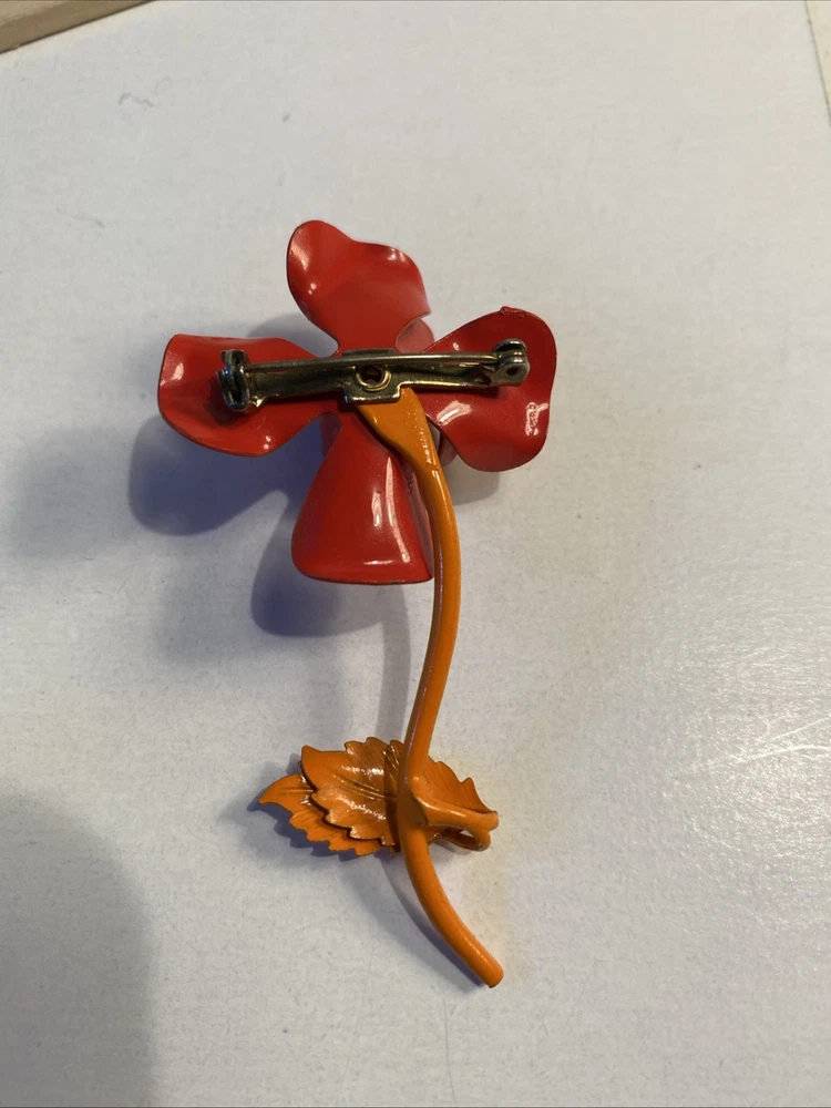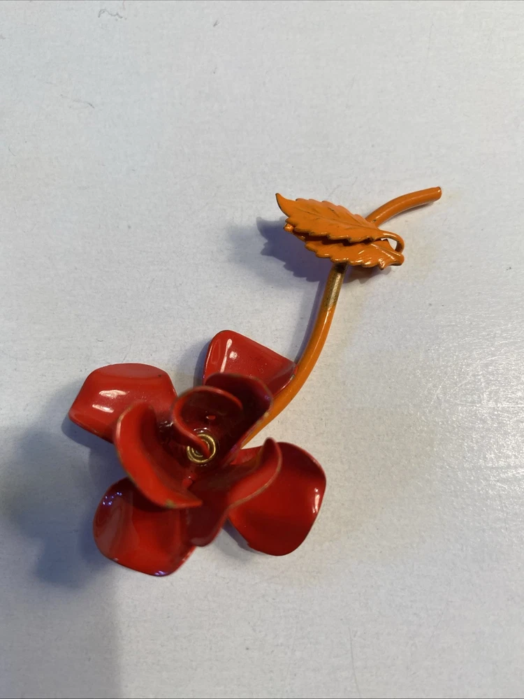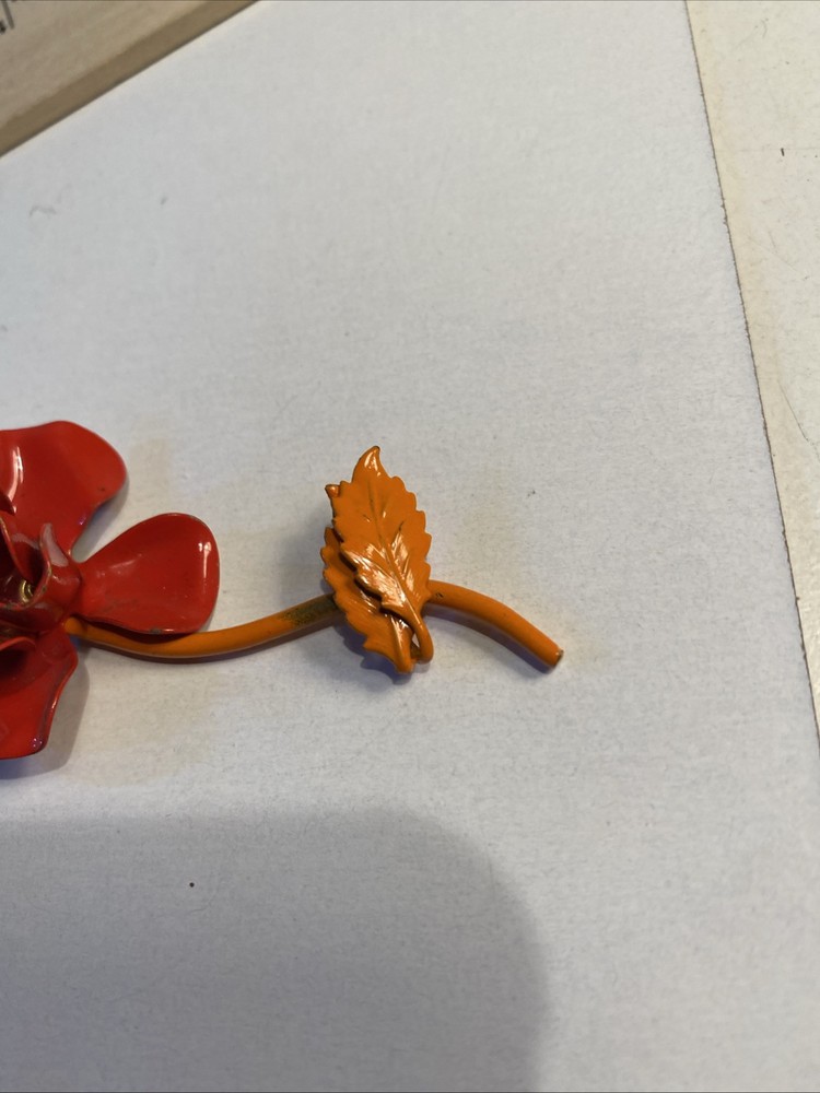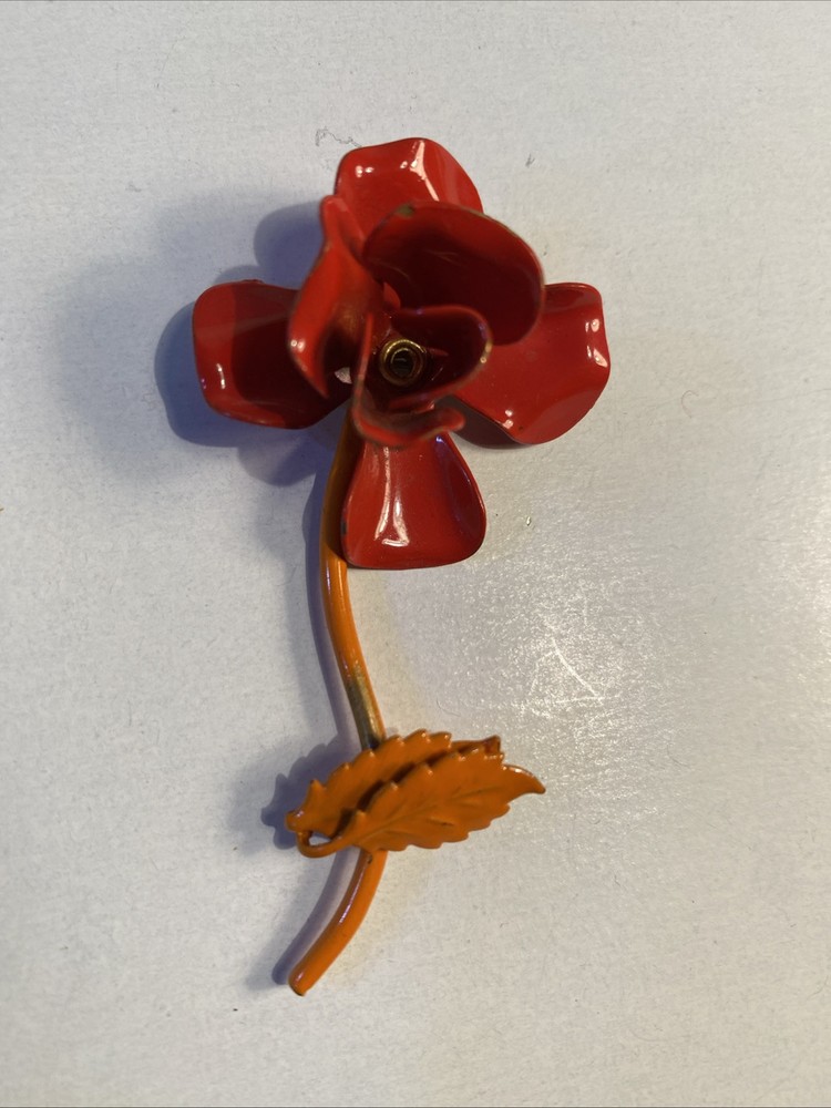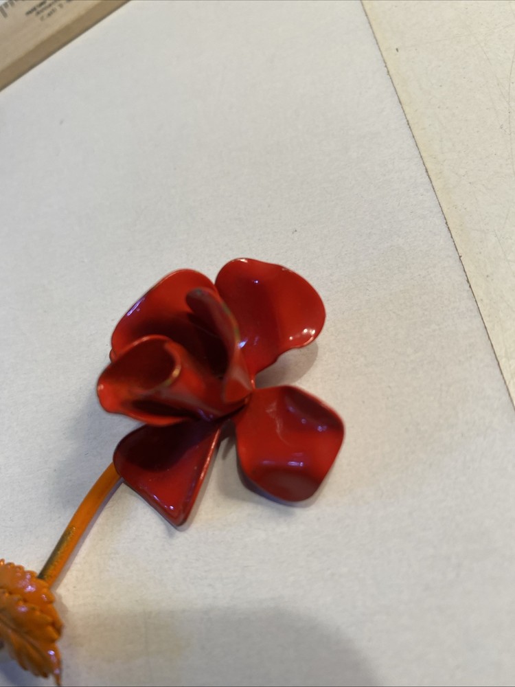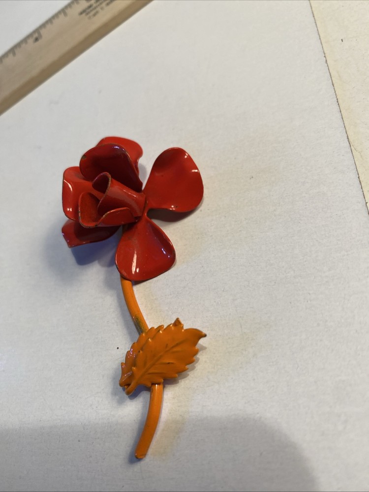 Mid Century Modern 3” Metal Flower Rose Brooch Pin Enamel Red & Orange Good condition see photos